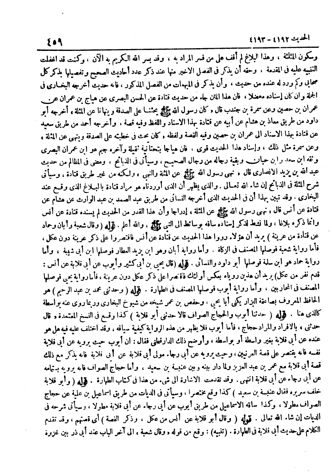 وَسُكُونِ الْمُثَلَّثَةِ وَهَذَا الْبَلَاغُ لَمْ أَقِفْ عَلَى مَنْ فَسَّرَ الْمُرَادَ بِهِ وَقَدْ يَسَّرَ اللَّهُ الْكَرِيمُ بِهِ الْآنَ وَكُنْتُ قَدْ أَغْفَلْتُ التَّنْبِيهَ عَلَيْهِ فِي الْمُقَدَّمَةِ وَحَقُّهُ أَنْ يُذْكَرَ فِي الْفَصْلِ الْأَخِيرِ مِنْهَا عِنْدَ ذِكْرِ عَدَدِ أَحَادِيثِ الصَّحِيحِ وَتَفْصِيلِهَا بِذِكْرِ كُلِّ صَحَابِيٍّ وَكَمْ وَرَدَ لَهُ عِنْدَهُ مِنْ حَدِيثٍ وَأَنْ يُذْكَرَ فِي الْمُبْهَمَاتِ مِنَ الْفَصْلِ الْمَذْكُورِ فَإِنَّهُ حَدِيثٌ أَخْرَجَهُ الْبُخَارِيُّ فِي الْجُمْلَةِ وَإِنْ كَانَ إِسْنَادُهُ مُعْضَلًا فَإِنَّ هَذَا الْمَتْنَ جَاءَ مِنْ حَدِيثِ قَتَادَةَ عَنِ الْحَسَنِ الْبَصْرِيِّ عَنْ هَيَّاجِ بْنِ عِمْرَانَ عَنْ عِمْرَانَ بْنِ حُصَيْنٍ وَعَنْ سَمُرَةَ بْنِ جُنْدُبٍ قَالَ كَانَ رَسُولُ اللَّهِ صَلَّى اللَّهُ عَلَيْهِ وَسَلَّمَ يَحُثُّنَا عَلَى الصَّدَقَةِ وَيَنْهَانَا عَنِ الْمُثْلَةِ أَخْرَجَهُ أَبُو دَاوُدَ مِنْ طَرِيقِ مُعَاذِ بْنِ هِشَامٍ عَنْ أَبِيهِ عَنْ قَتَادَةَ بِهَذَا الْإِسْنَادِ وَاللَّفْظِ وَفِيهِ قِصَّةٌ وَأَخْرَجَهُ أَحْمَدُ مِنْ طَرِيقِ سَعِيدٍ عَنْ قَتَادَةَ بِهَذَا الْإِسْنَادِ إِلَى عِمْرَانَ بْنِ حُصَيْنٍ وَفِيهِ الْقِصَّةُ وَلَفْظُهُ كَانَ يَحُثُّ فِي خُطْبَتِهِ عَلَى الصَّدَقَةِ وَيَنْهَى عَنِ الْمُثْلَةِ وَعَنْ سَمُرَةَ مِثْلُ ذَلِكَ وَإِسْنَادُ هَذَا الْحَدِيثِ قَوِيٌّ فَإِنَّ هَيَّاجًا بِتَحْتَانِيَّةٍ ثَقِيلَةٍ وَآخِرُهُ جِيم هُوَ بن عمرَان الْبَصْرِيّ وَثَّقَهُ بن سعد وبن حِبَّانَ وَبَقِيَّةُ رِجَالِهِ مِنْ رِجَالِ الصَّحِيحِ وَسَيَأْتِي فِي الذَّبَائِحِ وَمَضَى فِي الْمَظَالِمِ مِنْ حَدِيثِ عَبْدِ اللَّهِ بْنِ يَزِيدَ الْأَنْصَارِيِّ قَالَ نَهَى رَسُولُ اللَّهِ صَلَّى اللَّهُ عَلَيْهِ وَسَلَّمَ عَنْ الْمُثْلَةِ وَالنُّهْبَى وَلَكِنَّهُ مِنْ غَيْرِ طَرِيقِ قَتَادَةَ وَسَيَأْتِي شَرْحُ الْمُثْلَةِ فِي الذَّبَائِحِ إِنْ شَاءَ اللَّهُ تَعَالَى وَالَّذِي يَظْهَرُ أَنَّ الَّذِي أَوْرَدْنَاهُ هُوَ مُرَادُ قَتَادَةَ بِالْبَلَاغِ الَّذِي وَقَعَ عِنْدَ الْبُخَارِيِّ وَقَدْ تَبَيَّنَ بِهَذَا أَنَّ فِي الْحَدِيثِ الَّذِي أَخْرَجَهُ النَّسَائِيُّ مِنْ طَرِيقِ عَبْدِ الصَّمَدِ بْنِ عَبْدِ الْوَارِثِ عَنْ هِشَامٍ عَنْ قَتَادَةَ عَنْ أَنَسٍ قَالَ نَهَى رَسُولُ اللَّهِ صَلَّى اللَّهُ عَلَيْهِ وَسَلَّمَ عَنْ الْمُثْلَةِ إِدْرَاجًا وَأَنَّ هَذَا الْقَدْرَ مِنَ الْحَدِيثِ لَمْ يُسْنِدْهُ قَتَادَةُ عَنْ أَنَسٍ وَإِنَّمَا ذَكَرَهُ بَلَاغًا وَلَمَّا نَشِطَ لِذِكْرِ إِسْنَادِهِ سَاقَهُ بِوَسَائِطَ إِلَى النَّبِيِّ صَلَّى اللَّهُ عَلَيْهِ وَسَلَّمَ وَاللَّهُ أَعْلَمُ قَوْلُهُ وَقَالَ شُعْبَةُ وَأَبَانُ وَحَمَّادٌ عَنْ قَتَادَةَ مِنْ عُرَيْنَةَ يُرِيدُ أَنَّ هَؤُلَاءِ رَوَوْا هَذَا الْحَدِيثَ عَنْ قَتَادَةَ عَنْ أَنَسٍ فَاقْتَصَرُوا عَلَى ذِكْرِ عُرَيْنَةَ دُونَ عُكْلٍ فَأَمَّا رِوَايَةُ شُعْبَةَ فَوَصَلَهَا الْمُصَنِّفُ فِي الزَّكَاة وَأما رِوَايَة أبان وَهُوَ بن يزِيد الْعَطَّار فوصلها بن أبي شيبَة وَأما رِوَايَة حَمَّاد هُوَ بن سَلَمَةَ فَوَصَلَهَا أَبُو دَاوُدَ وَالنَّسَائِيُّ قَوْلُهُ قَالَ يَحْيَى بْنُ أَبِي كَثِيرٍ وَأَيُّوبُ عَنْ أَبِي قِلَابَةَ عَنْ أَنَسٍ قَدِمَ نَفَرٌ مِنْ عُكْلٍ يُرِيدُ أَنَّ هَذَيْنِ رَوَيَاهُ بِعَكْسِ أُولَئِكَ فَاقْتَصَرَا عَلَى ذِكْرِ عُكْلٍ دُونَ عُرَيْنَةَ فَأَمَّا رِوَايَةُ يَحْيَى فَوَصَلَهَا الْمُصَنِّفُ فِي الْمُحَارَبِينَ وَأَمَّا رِوَايَةُ أَيُّوبَ فَوَصَلَهَا الْمُصَنِّفُ فِي الطَّهَارَةِ