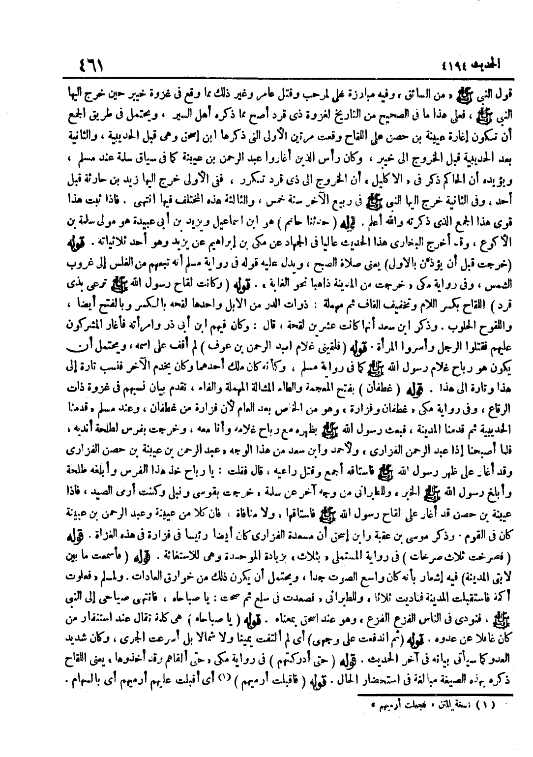[4194] قَوْله حَدثنَا حَاتِم هُوَ بن إِسْمَاعِيلَ وَيَزِيدُ بْنُ أَبِي عُبَيْدَةَ هُوَ مَوْلَى سَلَمَةَ بْنِ الْأَكْوَعِ وَقَدْ أَخْرَجَ الْبُخَارِيُّ هَذَا الْحَدِيثَ عَالِيًا فِي الْجِهَادِ عَنْ مَكِّيِّ بْنِ إِبْرَاهِيمَ عَنْ يَزِيدَ وَهُوَ أَحَدُ ثُلَاثِيَّاتِهِ قَوْلُهُ خَرَجْتُ قَبْلَ أَنْ يُؤَذَّنَ بِالْأُولَى يَعْنِي صَلَاةَ الصُّبْح وَيدل عَلَيْهِ قَوْله فِي رِوَايَةِ مُسْلِمٍ أَنَّهُ تَبِعَهُمْ مِنَ الْغَلَسِ إِلَى غُرُوبِ الشَّمْسِ وَفِي رِوَايَةِ مَكِّيٍّ خَرَجْتُ مِنَ الْمَدِينَةِ ذَاهِبًا نَحْوَ الْغَابَةِ قَوْلُهُ وَكَانَتْ لقاح رَسُول الله صلى الله عَلَيْهِ وَسلم تَرْعَى بِذِي قَرَدٍ اللِّقَاحُ بِكَسْرِ اللَّامِ وَتَخْفِيفِ الْقَافِ ثُمَّ مُهْمَلَةٍ ذَوَاتُ الدَّرِّ مِنَ الْإِبِلِ وَاحِدُهَا لِقْحَةٌ بِالْكَسْرِ وَبِالْفَتْحِ أَيْضًا وَاللَّقُوحُ الْحَلُوبُ وَذكر بن سَعْدٍ أَنَّهَا كَانَتْ عِشْرِينَ لِقْحَةً قَالَ وَكَانَ فيهم بن أَبِي ذَرٍّ وَامْرَأَتُهُ فَأَغَارَ الْمُشْرِكُونَ عَلَيْهِمْ فَقَتَلُوا الرَّجُلَ وَأَسَرُوا الْمَرْأَةَ قَوْلُهُ فَلَقِيَنِي غُلَامٌ لِعَبْدِ الرَّحْمَنِ بْنِ عَوْفٍ لَمْ أَقِفْ عَلَى اسْمِهِ وَيُحْتَمَلُ أَنْ يَكُونَ هُوَ رَبَاحَ غُلَامَ رَسُولَ اللَّهِ صَلَّى اللَّهُ عَلَيْهِ وَسَلَّمَ كَمَا فِي رِوَايَةِ مُسْلِمٍ وَكَأَنَّهُ كَانَ مِلْكَ أَحَدِهِمَا وَكَانَ يَخْدُمُ الْآخَرَ فَنُسِبَ تَارَةً إِلَى هَذَا وَتَارَةً إِلَى هَذَا قَوْلُهُ غَطَفَانَ بِفَتْحِ الْمُعْجَمَةِ وَالطَّاءِ الْمُشَالَةِ الْمُهْمَلَةِ وَالْفَاءِ تَقَدَّمَ بَيَانُ نَسَبِهِمْ فِي غَزْوَةِ ذَاتِ الرِّقَاعِ وَفِي رِوَايَةِ مَكِّيٍّ غَطَفَانَ وَفَزَارَةَ وَهُوَ مِنَ الْخَاصِّ بَعْدَ الْعَامِّ لِأَنَّ فَزَارَةَ مِنْ غَطَفَانَ وَعِنْدَ مُسْلِمٍ قَدِمْنَا الْحُدَيْبِيَةَ ثُمَّ قَدِمْنَا الْمَدِينَةَ فَبَعَثَ رَسُولُ اللَّهِ صَلَّى اللَّهُ عَلَيْهِ وَسَلَّمَ بِظَهْرِهِ مَعَ رَبَاحٍ غُلَامِهِ وَأَنَا مَعَهُ وَخَرَجْتُ بِفَرَسٍ لِطَلْحَةَ أَنْدُبُهُ فَلَمَّا أَصْبَحْنَا إِذا عبد الرَّحْمَن الْفَزارِيّ وَلأَحْمَد وبن سَعْدٍ مِنْ هَذَا الْوَجْهِ عَبْدُ الرَّحْمَنِ بْنِ عُيَيْنَةَ بْنِ حِصْنٍ الْفَزَارِيُّ وَقَدْ أَغَارَ عَلَى ظَهْرِ رَسُولِ اللَّهِ صَلَّى اللَّهُ عَلَيْهِ وَسَلَّمَ فَاسْتَاقَهُ أَجْمَعَ وَقَتَلَ رَاعِيَهُ قَالَ فَقُلْتُ يَا رَبَاحُ خُذْ هَذَا الْفَرَسَ وَأَبْلِغْهُ طَلْحَةَ وَأَبْلِغْ رَسُولَ اللَّهِ صَلَّى اللَّهُ عَلَيْهِ وَسَلَّمَ الْخَبَرَ وَلِلطَّبَرَانِيِّ مِنْ وَجْهٍ آخَرَ عَنْ سَلَمَةَ خَرَجْتُ بِقَوْسِي وَنَبْلِي وَكُنْتُ أَرْمِي الصَّيْدَ فَإِذَا عُيَيْنَةُ بْنُ حِصْنٍ قَدْ أَغَارَ عَلَى لِقَاحِ رَسُولِ اللَّهِ صَلَّى اللَّهُ عَلَيْهِ وَسَلَّمَ فَاسْتَاقَهَا وَلَا مُنَافَاة فَإِنَّ كُلًّا مِنْ عُيَيْنَةَ وَعَبْدِ الرَّحْمَنِ بْنِ عُيَيْنَةَ كَانَ فِي الْقَوْمِ وَذَكَرَ مُوسَى بْنُ عقبَة وبن إِسْحَاقَ أَنَّ مَسْعَدَةَ الْفَزَارِيَّ كَانَ أَيْضًا رَئِيسًا فِي فَزَارَةَ فِي هَذِهِ الْغُزَاةِ قَوْلُهُ فَصَرَخْتُ ثَلَاثَ صَرَخَاتٍ فِي رِوَايَةِ الْمُسْتَمْلِي بِثَلَاثِ بِزِيَادَةِ الْمُوَحَّدَةِ وَهِيَ لِلِاسْتِغَاثَةِ قَوْلُهُ فَأَسْمَعْتُ مَا بَيْنَ لَابَتَيْ الْمَدِينَةِ فِيهِ إِشْعَارٌ بِأَنَّهُ كَانَ وَاسِعَ الصَّوْتِ جِدًّا وَيُحْتَمَلُ أَنْ يَكُونَ ذَلِكَ مِنْ خَوَارِقِ الْعَادَاتِ وَلِمُسْلِمٍ فَعَلَوْتُ أَكْمَةً فَاسْتَقْبَلْتُ الْمَدِينَةَ فَنَادَيْتُ ثَلَاثًا وَلِلطَّبَرَانِيِّ فَصَعِدْتُ فِي سَلَعٍ ثُمَّ صِحْتُ يَا صَبَاحَاهُ فَانْتَهَى صِيَاحِي إِلَى النَّبِيِّ صَلَّى اللَّهُ عَلَيْهِ وَسَلَّمَ