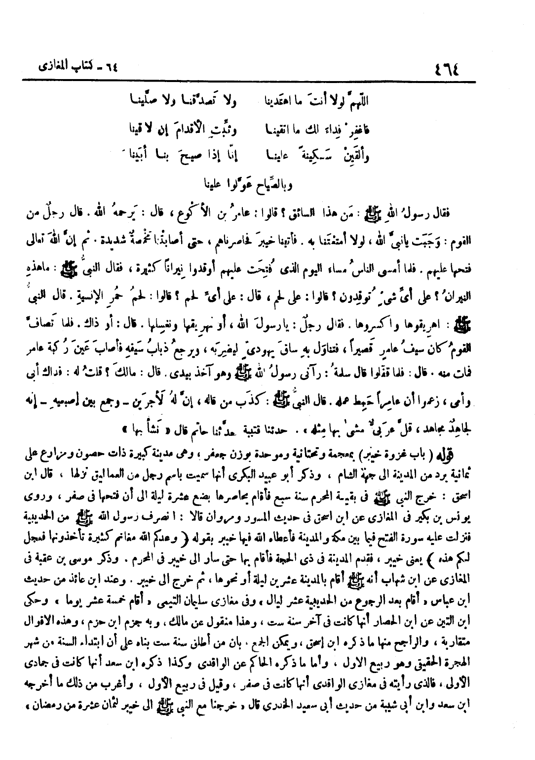 بِمُعْجَمَةٍ وَتَحْتَانِيَّةٍ وَمُوَحَّدَةٍ بِوَزْنِ جَعْفَرٍ وَهِيَ مَدِينَةٌ كَبِيرَةٌ ذَاتُ حُصُونٍ وَمَزَارِعَ عَلَى ثَمَانِيَةِ بُرُدٍ مِنَ الْمَدِينَةِ إِلَى جِهَة الشَّام وَذكر أَبُو عبيد الْبَكْرِيُّ أَنَّهَا سُمِّيَتْ بِاسْمِ رَجُلٍ مِنَ الْعَمَالِيقِ نزلها قَالَ بن إِسْحَاقَ خَرَجَ النَّبِيُّ صَلَّى اللَّهُ عَلَيْهِ وَسَلَّمَ فِي بَقِيَّةِ الْمُحَرَّمِ سَنَةَ سَبْعٍ فَأَقَامَ يُحَاصِرُهَا بِضْعَ عَشْرَةَ لَيْلَةً إِلَى أَنْ فَتَحَهَا فِي صَفَرٍ وَرَوَى يُونُسُ بْنُ بُكَيْرٍ فِي الْمَغَازِي عَن بن إِسْحَاقَ فِي حَدِيثِ الْمِسْوَرِ وَمَرْوَانَ قَالَا انْصَرَفَ رَسُولُ اللَّهِ صَلَّى اللَّهُ عَلَيْهِ وَسَلَّمَ مَنْ الْحُدَيْبِيَةِ فَنَزَلَتْ عَلَيْهِ سُورَةُ الْفَتْحِ فِيمَا بَيْنَ مَكَّةَ وَالْمَدِينَةِ فَأَعْطَاهُ اللَّهُ فِيهَا خَيْبَرَ بِقَوْلِهِ وَعَدَكُمُ اللَّهُ مَغَانِمَ كَثِيرَةً تَأْخُذُونَهَا فَعَجَّلَ لَكُمْ هَذِه يَعْنِي خَيْبَرَ فَقَدِمَ الْمَدِينَةَ فِي ذِي الْحَجَّةِ فَأَقَامَ بِهَا حَتَّى سَارَ إِلَى خَيْبَرَ فِي الْمُحَرَّمِ وَذَكَرَ مُوسَى بْنُ عُقْبَةَ فِي الْمَغَازِي عَنِ بن شِهَابٍ أَنَّهُ صَلَّى اللَّهُ عَلَيْهِ وَسَلَّمَ أَقَامَ بِالْمَدِينَةِ عِشْرِينَ لَيْلَةً أَوْ نَحْوَهَا ثُمَّ خَرَجَ إِلَى خَيْبَر وَعند بن عَائِذ من حَدِيث بن عَبَّاسٍ أَقَامَ بَعْدَ الرُّجُوعِ مِنَ الْحُدَيْبِيَةِ عَشْرَ لَيَالٍ وَفِي مَغَازِي سُلَيْمَانَ التَّيْمِيِّ أَقَامَ خَمْسَةَ عشر يَوْمًا وَحكى بن التِّين عَن بن الْحَصَّارِ أَنَّهَا كَانَتْ فِي آخِرِ سَنَةِ سِتٍّ وَهَذَا مَنْقُول عَن مَالك وَبِه جزم بن حَزْمٍ وَهَذِهِ الْأَقْوَالُ مُتَقَارِبَةٌ وَالرَّاجِحُ مِنْهَا مَا ذكره بن إِسْحَاقَ وَيُمْكِنُ الْجَمْعُ بِأَنَّ مَنْ أَطْلَقَ سَنَةَ سِتٍّ بَنَاهُ عَلَى أَنَّ ابْتِدَاءَ السَّنَةِ مِنْ شَهْرِ الْهِجْرَةِ الْحَقِيقِيِّ وَهُوَ رَبِيعٌ الْأَوَّلُ وَأَمَّا مَا ذَكَرَهُ الْحَاكِمُ عَنِ الْوَاقِدِيِّ وَكَذَا ذَكَرَهُ بن سَعْدٍ أَنَّهَا كَانَتْ فِي جُمَادَى الْأُولَى فَالَّذِي رَأَيْتُهُ فِي مَغَازِي الْوَاقِدِيِّ أَنَّهَا كَانَتْ فِي صَفَرٍ وَقِيلَ فِي رَبِيعٍ الْأَوَّلِ وَأَغْرَبُ مِنْ ذَلِك مَا أخرجه بن سعد وبن أَبِي شَيْبَةَ مِنْ حَدِيثِ أَبِي سَعِيدٍ الْخُدْرِيِّ قَالَ خَرَجْنَا مَعَ النَّبِيِّ صَلَّى اللَّهُ عَلَيْهِ وَسَلَّمَ إِلَى خَيْبَر لثمان عَشْرَةَ مِنْ رَمَضَانَ
