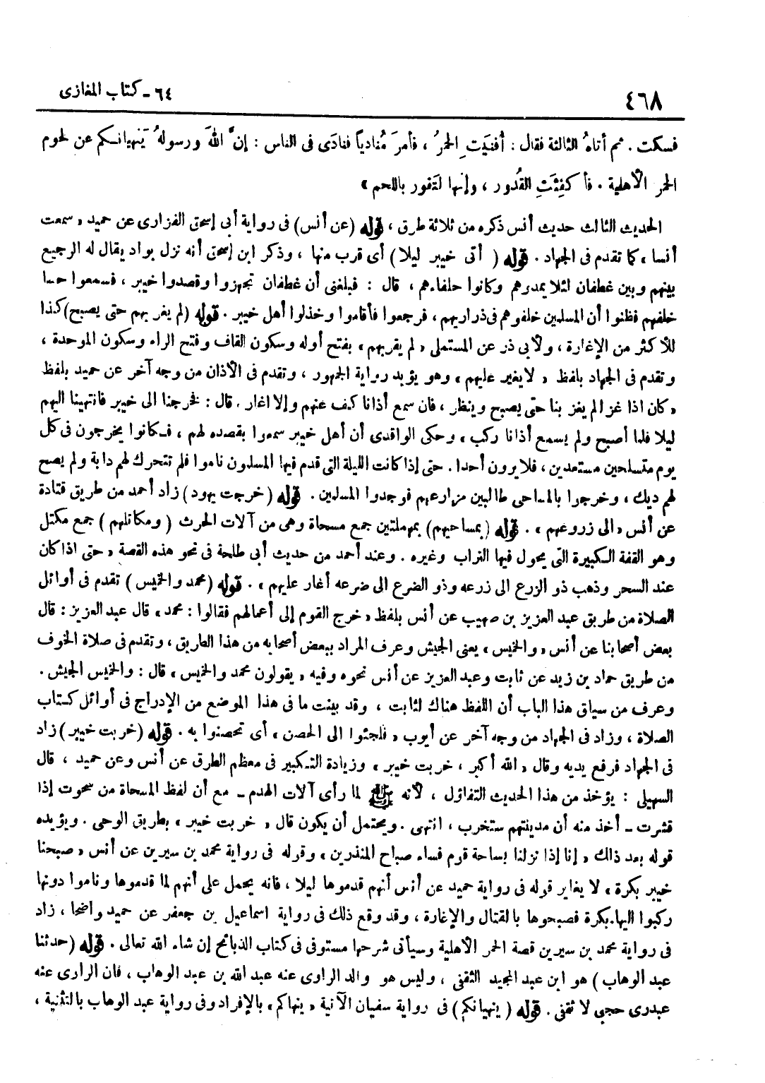 [4198] فِي رِوَايَةِ مُحَمَّدِ بْنِ سِيرِينَ عَنْ أَنَسٍ صَبَّحْنَا خَيْبَرَ بُكْرَةً لَا يُغَايِرُ قَوْلَهُ فِي رِوَايَةِ حُمَيْدٍ عَنْ أَنَسٍ أَنَّهُمْ قَدِمُوهَا لَيْلًا فَإِنَّهُ يُحْمَلُ عَلَى أَنَّهُمْ لَمَّا قَدِمُوهَا وَنَامُوا دُونَهَا رَكِبُوا إِلَيْهَا بُكْرَةً فَصَبَّحُوهَا بِالْقِتَالِ وَالْإِغَارَةِ وَقَدْ وَقَعَ ذَلِكَ فِي رِوَايَةِ إِسْمَاعِيلَ بْنِ جَعْفَرٍ عَنْ حُمَيْدٍ وَاضِحًا زَادَ فِي رِوَايَةِ مُحَمَّدِ بْنِ سِيرِينَ قِصَّةَ الْحُمُرِ الْأَهْلِيَّةِ وَسَيَأْتِي شَرْحُهَا مُسْتَوْفًى فِي كِتَابِ الذَّبَائِحِ إِنْ شَاءَ اللَّهُ تَعَالَى