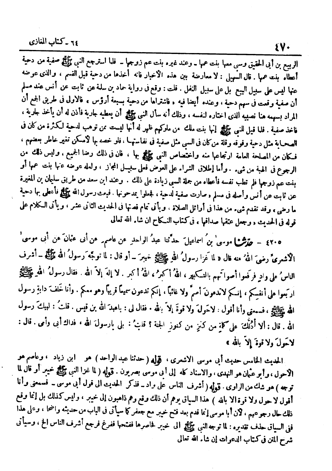 [4205] قَوْله حَدثنَا عبد الْوَاحِد هُوَ بن أبي زِيَادٍ وَعَاصِمٌ هُوَ الْأَحْوَلُ وَأَبُو عُثْمَانَ هُوَ النَّهْدِيُّ وَالْإِسْنَادُ كُلُّهُ إِلَى أَبِي مُوسَى بَصْرِيُّونَ قَوْلُهُ لَمَّا غَزَا النَّبِيُّ صَلَّى اللَّهُ عَلَيْهِ وَسَلَّمَ خَيْبَرَ أَوْ قَالَ لَمَّا تَوَجَّهَ هُوَ شَكٌّ مِنَ الرَّاوِي قَوْلُهُ أَشْرَفَ النَّاسُ عَلَى وَادٍ فَذَكَرَ الْحَدِيثَ إِلَى قَوْلِ أَبِي مُوسَى فَسَمِعَنِي وَأَنَا أَقُولُ لَا حَوْلَ وَلَا قُوَّةَ إِلَّا بِاللَّهِ هَذَا السِّيَاقُ يُوهِمُ أَنَّ ذَلِكَ وَقَعَ وَهُمْ ذَاهِبُونَ إِلَى خَيْبَرَ وَلَيْسَ كَذَلِكَ بَلْ إِنَّمَا وَقَعَ ذَلِكَ حَالَ رُجُوعِهِمْ لِأَنَّ أَبَا مُوسَى إِنَّمَا قَدِمَ بَعْدَ فَتْحِ خَيْبَرَ مَعَ جَعْفَرٍ كَمَا سَيَأْتِي فِي الْبَابِ مِنْ حَدِيثِهِ وَاضِحًا وَعَلَى هَذَا فَفِي السِّيَاقِ حَذْفٌ تَقْدِيرُهُ لَمَّا تَوَجُّهِ النَّبِيِّ صَلَّى اللَّهُ عَلَيْهِ وَسَلَّمَ إِلَى خَيْبَرَ فحاصرها فَفَتحهَا ففرغ فَرَجَعَ أَشْرَفَ النَّاسُ إِلَخْ وَسَيَأْتِي شَرْحُ الْمَتْنِ فِي كِتَابِ الدَّعَوَاتِ إِنْ شَاءَ اللَّهُ تَعَالَى
