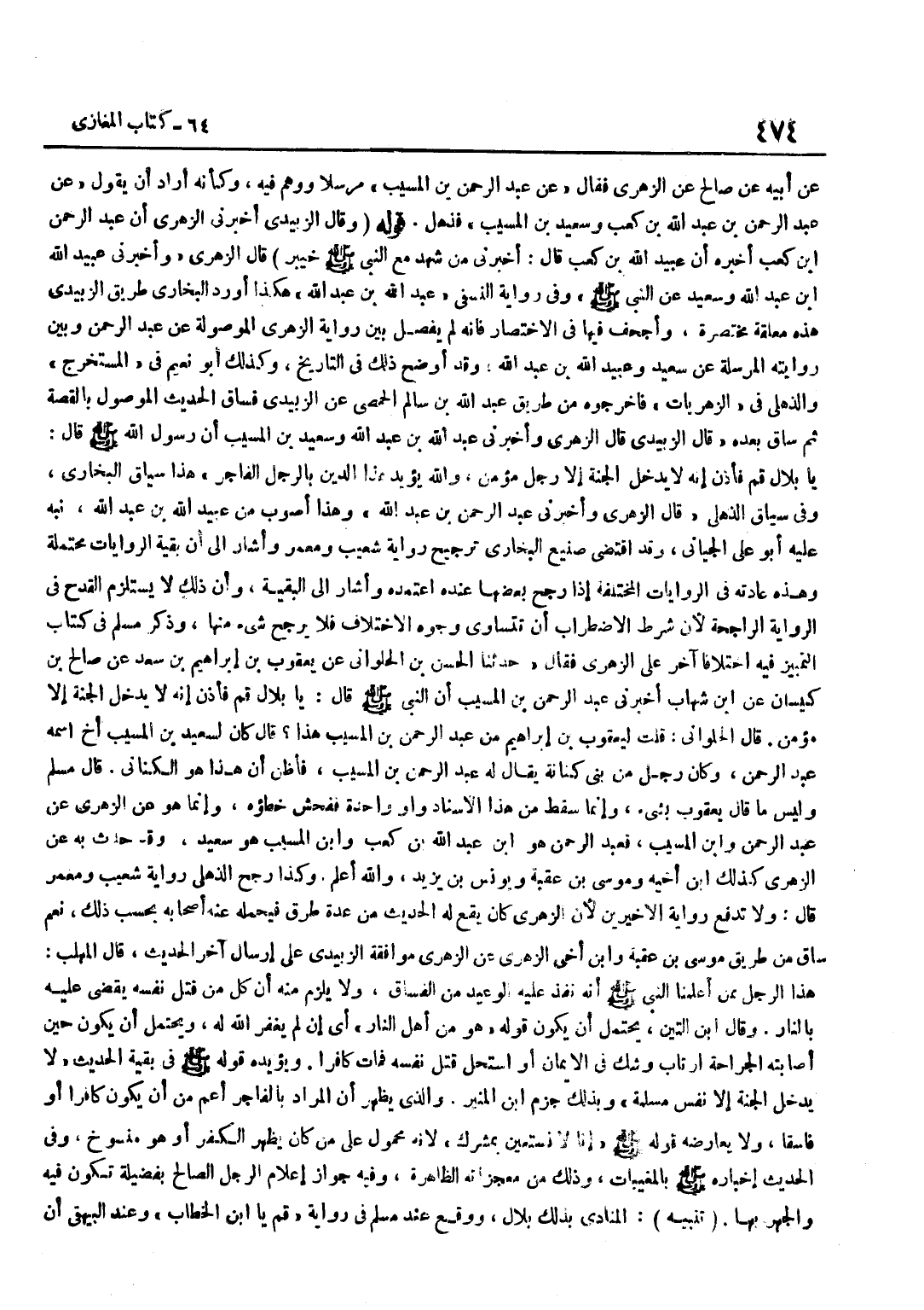 عَنْ أَبِيهِ عَنْ صَالِحٍ عَنِ الزُّهْرِيِّ فَقَالَ عَنْ عَبْدِ الرَّحْمَنِ بْنِ الْمُسَيَّبِ مُرْسَلًا وَوَهَمَ فِيهِ وَكَأَنَّهُ أَرَادَ أَنْ يَقُولَ عَنْ عَبْدِ الرَّحْمَنِ بْنِ عَبْدِ اللَّهِ بْنِ كَعْبٍ وَسَعِيدِ بْنِ الْمُسَيَّبِ فَذَهَلَ قَوْلُهُ وَقَالَ الزُّبَيْدِيُّ أَخْبَرَنِي الزُّهْرِيُّ أَنَّ عَبْدَ الرَّحْمَنِ بْنَ كَعْبٍ أَخْبَرَهُ أَن عبيد الله بن عكب قَالَ أَخْبَرَنِي مَنْ شَهِدَ مَعَ النَّبِيِّ صَلَّى اللَّهُ عَلَيْهِ وَسَلَّمَ خَيْبَرَ قَالَ الزُّهْرِيُّ وَأَخْبَرَنِي عُبَيْدُ اللَّهِ بْنُ عَبْدِ اللَّهِ وَسَعِيدٌ عَنِ النَّبِيَّ صَلَّى اللَّهُ عَلَيْهِ وَسَلَّمَ وَفِي رِوَايَةِ النَّسَفِيِّ عَبْدُ اللَّهِ بْنُ عَبْدِ اللَّهِ هَكَذَا أَوْرَدَ الْبُخَارِيُّ طَرِيقَ الزُّبَيْدِيِّ هَذِهِ مُعَلَّقَةً مُخْتَصَرَةً وَأَجْحَفَ فِيهَا فِي الِاخْتِصَارِ فَإِنَّهُ لَمْ يَفْصِلْ بَيْنَ رِوَايَةِ الزُّهْرِيِّ الْمَوْصُولَةِ عَنْ عَبْدِ الرَّحْمَنِ وَبَيْنَ رِوَايَتِهِ الْمُرْسَلَةِ عَنْ سَعِيدٍ وَعُبَيْدِ اللَّهِ بْنِ عَبْدِ اللَّهِ وَقَدْ أَوْضَحَ ذَلِكَ فِي التَّارِيخِ وَكَذَلِكَ أَبُو نُعَيْمٍ فِي الْمُسْتَخْرَجِ وَالذُّهْلِيُّ فِي الزُّهْرِيَّاتِ فَأَخْرَجُوهُ مِنْ طَرِيقِ عَبْدِ اللَّهِ بْنِ سَالِمٍ الْحِمْصِيِّ عَنِ الزُّبَيْدِيِّ فَسَاقَ الْحَدِيثَ الْمَوْصُولَ بِالْقِصَّةِ ثُمَّ سَاقَ بَعْدَهُ قَالَ الزُّبَيْدِيُّ قَالَ الزُّهْرِيُّ وَأَخْبَرَنِي عَبْدُ اللَّهِ بْنُ عَبْدِ اللَّهِ وَسَعِيدُ بْنُ الْمُسَيَّبِ أَنَّ رَسُولَ اللَّهِ صَلَّى اللَّهُ عَلَيْهِ وَسَلَّمَ قَالَ يَا بِلَالُ قُمْ فَأَذِّنْ إِنَّهُ لَا يَدْخُلُ الْجَنَّةَ إِلَّا رَجُلٌ مُؤْمِنٌ وَاللَّهُ يُؤَيِّدُ هَذَا الدِّينَ بِالرَّجُلِ الْفَاجِرِ هَذَا سِيَاقُ الْبُخَارِيِّ وَفِي سِيَاقِ الذُّهْلِيِّ قَالَ الزُّهْرِيُّ وَأَخْبَرَنِي عَبْدُ الرَّحْمَنِ بْنُ عَبْدِ اللَّهِ وَهَذَا أَصْوَبُ مِنْ عُبَيْدِ اللَّهِ بْنِ عَبْدِ اللَّهِ نَبَّهَ عَلَيْهِ أَبُو عَلِيٍّ الْجَيَّانِيُّ وَقَدِ اقْتَضَى صَنِيعُ الْبُخَارِيِّ تَرْجِيحَ رِوَايَةِ شُعَيْبٍ وَمَعْمَرٍ وَأَشَارَ إِلَى أَنَّ بَقِيَّةَ الرِّوَايَاتِ مُحْتَمَلَةٌ وَهَذِهِ عَادَتُهُ فِي الرِّوَايَاتِ الْمُخْتَلِفَةِ إِذَا رَجَحَ بَعْضُهَا عِنْدَهُ اعْتَمَدَهُ وَأَشَارَ إِلَى الْبَقِيَّةِ وَأَنَّ ذَلِكَ لَا يَسْتَلْزِمُ الْقَدْحَ فِي الرِّوَايَةِ الرَّاجِحَةِ لِأَنَّ شَرْطَ الِاضْطِرَابِ أَنْ تَتَسَاوَى وُجُوهُ الِاخْتِلَافِ فَلَا يَرْجَحُ شَيْءٌ مِنْهَا وَذَكَرَ مُسْلِمٌ فِي كِتَابِ التَّمْيِيزِ فِيهِ اخْتِلَافًا آخَرَ عَلَى الزُّهْرِيِّ فَقَالَ حَدَّثَنَا الْحَسَنُ بْنُ الْحَلْوَانِيِّ عَنْ يَعْقُوبَ بْنِ إِبْرَاهِيمَ بْنِ سَعْدٍ عَنْ صَالِحِ بْنِ كَيْسَانَ عَن بن شِهَابٍ أَخْبَرَنِي عَبْدُ الرَّحْمَنِ بْنُ الْمُسَيَّبِ أَنَّ النَّبِيَّ صَلَّى اللَّهُ عَلَيْهِ وَسَلَّمَ قَالَ يَا بِلَالُ قُمْ فَأَذِّنْ إِنَّهُ لَا يَدْخُلُ الْجَنَّةَ إِلَّا مُؤْمِنٌ قَالَ الْحَلْوَانِيُّ قُلْتُ لِيَعْقُوبَ بْنِ إِبْرَاهِيمَ مَنْ عَبْدُ الرَّحْمَنِ بْنُ الْمُسَيَّبِ هَذَا قَالَ كَانَ لِسَعِيدِ بْنِ الْمُسَيَّبِ أَخٌ اسْمُهُ عَبْدُ الرَّحْمَنِ وَكَانَ رَجُلٌ مِنْ بَنِي كِنَانَةَ يُقَال لَهُ عبد الرَّحْمَن بن الْمسيب فأظنه أَنَّ هَذَا هُوَ الْكِنَانِيُّ قَالَ مُسْلِمٌ وَلَيْسَ مَا قَالَ يَعْقُوبُ بِشَيْءٍ وَإِنَّمَا سَقَطَ مِنْ هَذَا الْإِسْنَادِ وَاوٌ وَاحِدَةٌ فَفَحُشَ خَطَؤُهُ وَإِنَّمَا هُوَ عَن الزُّهْرِيّ عَن عبد الرَّحْمَن وبن الْمسيب فعبد الرَّحْمَن هُوَ بن عبد الله بن كَعْب وبن الْمُسَيَّبِ هُوَ سَعِيدٌ وَقَدْ حَدَّثَ بِه