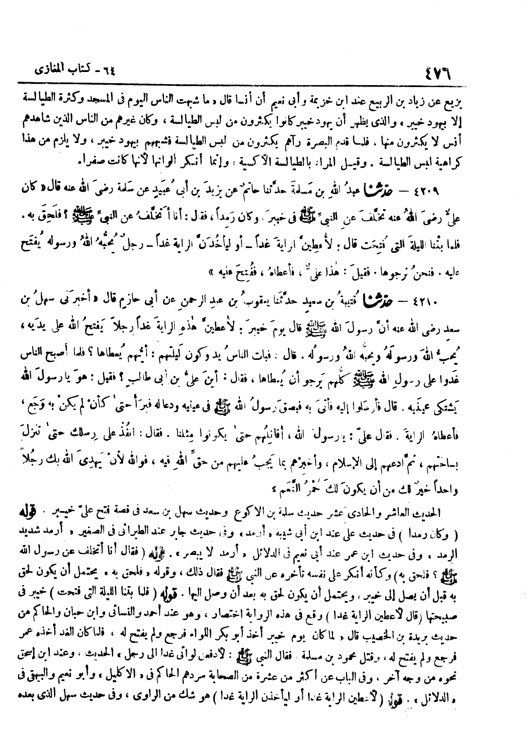 [4209] قَوْلُهُ وَكَانَ رمدا فِي حَدِيث عَليّ عِنْد بن أَبِي شَيْبَةَ أَرْمَدُ وَفِي حَدِيثِ جَابِرٍ عِنْدَ الطَّبَرَانِيِّ فِي الصَّغِيرِ أَرْمَدَ شَدِيدَ الرَّمَدِ وَفِي حَدِيث بن عُمَرَ عِنْدَ أَبِي نُعَيْمٍ فِي الدَّلَائِلِ أَرْمَدَ لَا يُبْصِرُ قَوْلُهُ فَقَالَ أَنَا أَتَخَلَّفُ عَنْ رَسُولِ اللَّهِ صَلَّى اللَّهُ عَلَيْهِ وَسَلَّمَ فَلَحِقَ بِهِ وَكَأَنَّهُ أَنْكَرَ عَلَى نَفْسِهِ تَأَخُّرَهُ عَنِ النَّبِيِّ صَلَّى اللَّهُ عَلَيْهِ وَسَلَّمَ فَقَالَ ذَلِكَ وَقَوْلُهُ فَلَحِقَ بِهِ يُحْتَمَلُ أَنْ يَكُونَ لَحِقَ بِهِ قَبْلَ أَنْ يَصِلَ إِلَى خَيْبَرَ وَيُحْتَمَلُ أَنْ يَكُونَ لَحِقَ بِهِ بَعْدَ أَنْ وَصَلَ إِلَيْهَا قَوْلُهُ فَلَمَّا بِتْنَا اللَّيْلَةَ الَّتِي فُتِحَتْ خَيْبَرُ فِي صَبِيحَتِهَا قَالَ لَأُعْطِيَنَّ الرَّايَةَ غَدًا وَقَعَ فِي هَذِهِ الرِّوَايَةِ اخْتِصَارٌ وَهُوَ عِنْدَ أَحْمد وَالنَّسَائِيّ وبن حبَان وَالْحَاكِم من حَدِيث بُرَيْدَة بن الخصيب قَالَ لَمَّا كَانَ يَوْمُ خَيْبَرَ أَخَذَ أَبُو بَكْرٍ اللِّوَاءَ فَرَجَعَ وَلَمْ يُفْتَحْ لَهُ فَلَمَّا كَانَ الْغَدُ أَخَذَهُ عُمَرُ فَرَجَعَ وَلَمْ يُفْتَحْ لَهُ وَقُتِلَ مَحْمُودُ بْنُ مَسْلَمَةَ فَقَالَ النَّبِيُّ صَلَّى اللَّهُ عَلَيْهِ وَسَلَّمَ لَأَدْفَعَنَّ لِوَائِي غَدًا إِلَى رجل الحَدِيث وَعند بن إِسْحَاقَ نَحْوَهُ مِنْ وَجْهٍ آخَرَ وَفِي الْبَابِ عَنْ أَكْثَرَ مِنْ عَشَرَةٍ مِنَ الصَّحَابَةِ سَرَدَهُمُ الْحَاكِمُ فِي الْإِكْلِيلِ وَأَبُو نُعَيْمٍ وَالْبَيْهَقِيُّ فِي الدَّلَائِلِ قَوْلُهُ لَأُعْطِيَنَّ الرَّايَةَ غَدًا أَوْ لَيَأْخُذَنَّ الرَّايَةَ غَدًا هُوَ شَكٌّ مِنَ الرَّاوِي وَفِي حَدِيثِ سَهْلٍ الَّذِي بَعْدَهُ