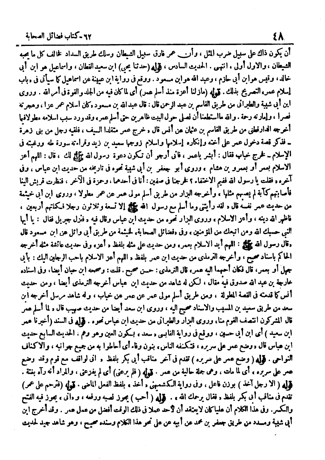 [3684] قَوْلُهُ حَدَّثَنَا يَحْيَى بن سعيد الْقطَّان وَإِسْمَاعِيل هُوَ بن أبي خَالِد وَقيس هُوَ بن أبي حَازِم وَعبد الله هُوَ بن مَسْعُود وَوَقع فِي رِوَايَة بن عُيَيْنَةَ عَنْ إِسْمَاعِيلَ كَمَا سَيَأْتِي فِي بَابِ إِسْلَامِ عُمَرَ التَّصْرِيحُ بِذَلِكَ قَوْلُهُ مَا زِلْنَا أَعِزَّةً مُنْذُ أَسْلَمَ عُمَرُ أَيْ لِمَا كَانَ فِيهِ مِنَ الْجَلَدِ وَالْقُوَّةِ فِي أَمْرِ اللَّهِ وروى بن أَبِي شَيْبَةَ وَالطَّبَرَانِيُّ مِنْ طَرِيقِ الْقَاسِمِ بْنِ عَبْدِ الرَّحْمَنِ قَالَ قَالَ عَبْدُ اللَّهِ بْنُ مَسْعُودٍ كَانَ إِسْلَامُ عُمَرَ عِزًّا وَهِجْرَتُهُ نَصْرًا وَإِمَارَتُهُ رَحْمَةً وَاللَّهِ مَا اسْتَطَعْنَا أَنْ نُصَلِّيَ حَوْلَ الْبَيْتِ ظَاهِرِينَ حَتَّى أَسْلَمَ عُمَرُ وَقَدْ وَرَدَ سَبَبُ إِسْلَامِهِ مُطَوَّلًا فِيمَا أَخْرَجَهُ الدَّارَقُطْنِيُّ مِنْ طَرِيقِ الْقَاسِمِ بْنِ عُثْمَانَ عَنْ أَنَسٍ قَالَ خَرَجَ عُمَرُ مُتَقَلِّدًا السَّيْفَ فَلَقِيَهُ رَجُلٌ مِنْ بَنِي زُهْرَةَ فَذَكَرَ قِصَّةَ دُخُولِ عُمَرَ عَلَى أُخْتِهِ وَإِنْكَارِهِ إِسْلَامَهَا وَإِسْلَامَ زَوْجِهَا سَعِيدِ بْنِ زَيْدٍ وَقِرَاءَتِهِ سُورَةَ طَهَ وَرَغْبَتَهَ فِي الْإِسْلَامِ فَخَرَجَ خَبَّابٌ فَقَالَ أَبْشِرْ يَا عُمَرُ فَإِنِّي أَرْجُو أَنْ تَكُونَ دَعْوَةِ رَسُولِ اللَّهِ صَلَّى اللَّهُ عَلَيْهِ وَسَلَّمَ لَكَ قَالَ اللَّهُمَّ أَعِزَّ الْإِسْلَامَ بِعُمَرَ أَوْ بِعَمْرِو بْنِ هِشَامٍ وَرَوَى أَبُو جَعْفَرِ بْنِ أَبِي شَيْبَةَ نَحْوَهُ فِي تَارِيخه من حَدِيث بن عَبَّاسٍ وَفِي آخِرِهِ فَقُلْتُ يَا رَسُولَ اللَّهِ فَفِيمَ الِاخْتِفَاءُ فَخَرَجْنَا فِي صَفَّيْنِ أَنَا فِي أَحَدِهِمَا وَحَمْزَةُ فِي الْآخَرِ فَنَظَرَتْ قُرَيْشٌ إِلَيْنَا فَأَصَابَتْهُمْ كَآبَةٌ لَمْ يُصِبْهُمْ مِثْلُهَا وَأَخْرَجَهُ الْبَزَّارُ مِنْ طَرِيقِ أَسْلَمَ مَوْلَى عُمَرَ عَنْ عُمَرَ مطولا وروى بن أَبِي خَيْثَمَةَ مِنْ حَدِيثِ عُمَرَ نَفْسِهِ قَالَ لَقَدْ رَأَيْتُنِي وَمَا أَسْلَمَ مَعَ رَسُولِ اللَّهِ صَلَّى اللَّهُ عَلَيْهِ وَسَلَّمَ إِلَّا تِسْعَةٌ وَثَلَاثُونَ رَجُلًا فَكَمَّلْتُهُمْ أَرْبَعِينَ فَأَظْهَرَ اللَّهُ دِينَهُ وَأَعَزَّ الْإِسْلَام وروى الْبَزَّار نَحوه من حَدِيث بن عَبَّاس وَقَالَ فِيهِ فَنزل جِبْرِيل فَقَالَ يَا أَيهَا النَّبِيُّ حَسْبُكَ اللَّهُ وَمَنِ اتَّبَعَكَ مِنَ الْمُؤْمِنِينَ وَفِي فَضَائِلِ الصَّحَابَةِ لِخَيْثَمَةَ مِنْ طَرِيقِ أَبِي وَائِل عَن بن مَسْعُودٍ قَالَ قَالَ رَسُولُ اللَّهِ صَلَّى اللَّهُ عَلَيْهِ وَسَلَّمَ اللَّهُمَّ أَيِّدِ الْإِسْلَامَ بِعُمَرَ وَمِنْ حَدِيثِ عَلِيٍّ مِثْلُهُ بِلَفْظِ أَعِزَّ وَفِي حَدِيثِ عَائِشَةَ مِثْلُهُ أَخْرَجَهُ الْحَاكِمُ بِإِسْنَادٍ صَحِيحٍ وَأَخْرَجَهُ التِّرْمِذِيّ من حَدِيث بن عُمَرَ بِلَفْظِ اللَّهُمَّ أَعِزَّ الْإِسْلَامَ بِأَحَبِّ الرَّجُلَيْنِ إِلَيْكَ بِأَبِي جَهْلٍ أَوْ بِعُمَرَ قَالَ فَكَانَ أَحَبُّهُمَا إِلَيْهِ عُمَرُ قَالَ التِّرْمِذِيُّ حَسَنٌ صَحِيحٌ قلت وَصَححهُ بن حِبَّانَ أَيْضًا وَفِي إِسْنَادِهِ خَارِجَةُ بْنُ عَبْدِ اللَّهِ صَدُوقٌ فِيهِ مَقَالٌ لَكِنْ لَهُ شَاهِدٌ من حَدِيث بن عَبَّاسٍ أَخْرَجَهُ التِّرْمِذِيُّ أَيْضًا وَمِنْ حَدِيثِ أَنَسٍ كَمَا قَدَّمْتُهُ فِي الْقِصَّةِ الْمُطَوَّلَةِ وَمِنْ طَرِيقِ أَسْلَمَ مَوْلَى عُمَرَ عَنْ عُمَرَ عَنْ خَبَّابٍ وَله شَاهد مُرْسل أخرجه بن سَعْدٍ مِنْ طَرِيقِ سَعِيدِ بْنِ الْمُسَيَّبِ وَالْإِسْنَادُ صَحِيح إِلَيْهِ وروى بن سَعْدٍ أَيْضًا مِنْ حَدِيثِ صُهَيْبٍ قَالَ لَمَّا أَسْلَمَ عُمَرُ قَالَ الْمُشْرِكُونَ انْتَصَفَ الْقَوْمُ مِنَّا وروى الْبَزَّار وَالطَّبَرَانِيّ من حَد