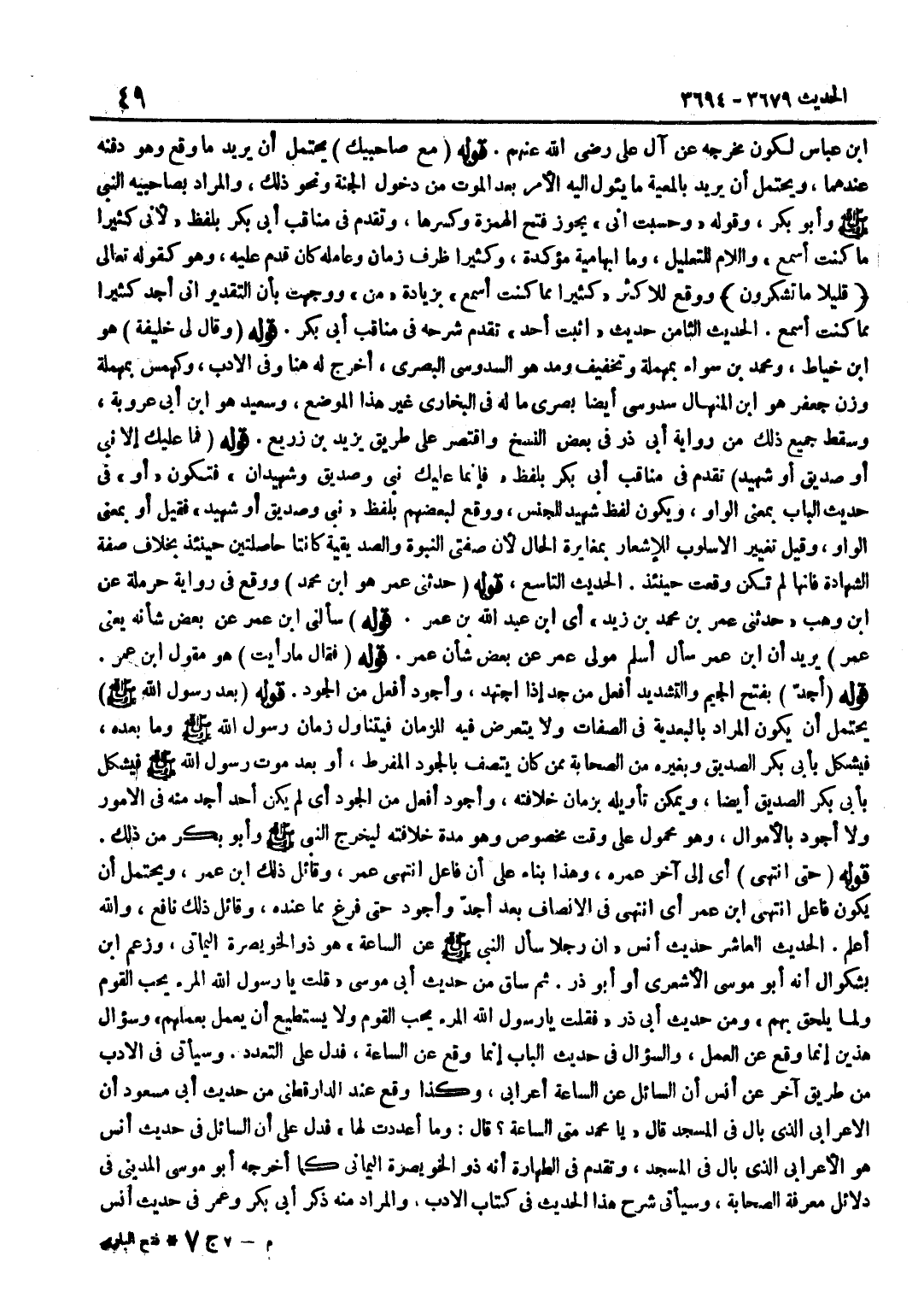 [3687] قَوْلُهُ حَدثنِي عمر هُوَ بن مُحَمَّد وَوَقع فِي رِوَايَة حَرْمَلَة عَن بن وَهْبٍ حَدَّثَنِي عُمَرُ بْنُ مُحَمَّدِ بْنِ زَيْدٍ أَي بن عبد الله بن عمر قَوْله سالني بن عُمَرَ عَنْ بَعْضِ شَأْنِهِ يَعْنِي عُمَرَ يُرِيدُ ان بن عُمَرَ سَأَلَ أَسْلَمَ مَوْلَى عُمَرَ عَنْ بَعْضِ شَأْنِ عُمَرَ قَوْلُهُ فَقَالَ مَا رَأَيْتُ هُوَ مقول بن عُمَرَ قَوْلُهُ أَجَدُّ بِفَتْحِ الْجِيمِ وَالتَّشْدِيدِ أَفْعَلُ مِنْ جَدَّ إِذَا اجْتَهَدَ وَأَجْوَدُ أَفْعَلُ مِنَ الْجُودِ قَوْلُهُ بَعْدَ رَسُولِ اللَّهِ صَلَّى اللَّهُ عَلَيْهِ وَسَلَّمَ يَحْتَمِلُ أَنْ يَكُونَ الْمُرَادُ بِالْبَعْدِيَّةِ فِي الصِّفَاتِ وَلَا يَتَعَرَّضُ فِيهِ لِلزَّمَانِ فَيَتَنَاوَلُ زَمَانِ رَسُولِ اللَّهِ صَلَّى اللَّهُ عَلَيْهِ وَسَلَّمَ وَمَا بَعْدَهُ فَيُشْكِلُ بِأَبِي بَكْرٍ الصِّدِّيقِ وَبِغَيْرِهِ مِنَ الصَّحَابَةِ مِمَّنْ كَانَ يَتَّصِفُ بِالْجُودِ الْمُفْرِطِ أَوْ بَعْدَ مَوْتِ رَسُولِ اللَّهِ صَلَّى اللَّهُ عَلَيْهِ وَسَلَّمَ فَيُشْكِلُ بِأَبِي بَكْرٍ الصِّدِّيقِ أَيْضًا وَيُمْكِنُ تَأْوِيلُهُ بِزَمَانِ خِلَافَتِهِ وَأَجْوَدُ أَفْعَلُ مِنَ الْجُودِ أَيْ لَمْ يَكُنْ أَحَدٌ أَجَدَّ مِنْهُ فِي الْأُمُورِ وَلَا أَجْوَدَ بِالْأَمْوَالِ وَهُوَ مَحْمُولٌ عَلَى وَقْتٍ مَخْصُوصٍ وَهُوَ مُدَّةُ خِلَافَتِهِ لِيَخْرُجَ النَّبِيِّ صَلَّى اللَّهُ عَلَيْهِ وَسَلَّمَ وَأَبُو بَكْرٍ مِنْ ذَلِكَ قَوْلُهُ حَتَّى انْتَهَى أَيْ إِلَى آخِرَ عُمْرَهُ وَهَذَا بِنَاءً عَلَى أَنَّ فَاعِلَ انْتهى عمر وَقَائِل ذَلِك بن عمر وَيحْتَمل ان يكون فَاعل انْتهى بن عُمَرَ أَيِ انْتَهَى فِي الْإِنْصَافِ بَعْدَ أَجَدَّ وَأَجْوَدَ حَتَّى فَرَغَ مِمَّا عِنْدَهُ وَقَائِلُ ذَلِكَ نَافِعٌ وَاللَّهُ أَعْلَمُ الْحَدِيثُ الْعَاشِرُ حَدِيثُ أَنَسٍ أَنَّ رَجُلًا سَأَلَ النَّبِيَّ صَلَّى اللَّهُ عَلَيْهِ وَسَلَّمَ عَنِ السَّاعَةِ هُوَ ذُو الْخُوَيْصِرَةِ الْيَمَانِيُّ وَزعم بن بَشْكُوَالَ أَنَّهُ أَبُو مُوسَى الْأَشْعَرِيُّ أَوْ أَبُو ذَرٍّ ثُمَّ سَاقَ مِنْ حَدِيثِ أَبِي مُوسَى قُلْتُ يَا رَسُولَ اللَّهِ الْمَرْءُ يُحِبُّ الْقَوْمَ وَلَمَّا يَلْحَقْ بِهِمْ وَمِنْ حَدِيثِ أَبِي ذَرٍّ فَقُلْتُ يَا رَسُولَ اللَّهِ الْمَرْءُ يُحِبُّ الْقَوْمَ وَلَا يَسْتَطِيعُ أَنْ يَعْمَلَ بِعَمَلِهِمْ وَسُؤَالُ هَذَيْنِ إِنَّمَا وَقَعَ عَنِ الْعَمَلِ وَالسُّؤَالُ فِي حَدِيثِ الْبَابِ إِنَّمَا وَقَعَ عَنِ السَّاعَةِ فَدَلَّ عَلَى التَّعَدُّدِ وَسَيَأْتِي فِي الْأَدَبِ مِنْ طَرِيقٍ آخَرَ عَنْ أَنَسٍ أَنَّ السَّائِلَ عَنِ السَّاعَةِ أَعْرَابِيٌّ وَكَذَا وَقَعَ عِنْدَ الدَّارَقُطْنِيِّ مِنْ حَدِيثِ أَبِي مَسْعُودٍ أَنَّ الْأَعْرَابِيَّ الَّذِي بَالَ فِي الْمَسْجِدِ قَالَ يَا مُحَمَّدُ مَتَى السَّاعَةُ قَالَ وَمَا أَعَدَدْتَ لَهَا فَدَلَّ عَلَى أَنَّ السَّائِلَ فِي حَدِيثِ أَنَسٍ هُوَ الْأَعْرَابِيُّ الَّذِي بَالَ فِي الْمَسْجِدِ وَتَقَدَّمَ فِي الطَّهَارَةِ أَنَّهُ ذُو الْخُوَيْصِرَةِ الْيَمَانِيُّ كَمَا أَخْرَجَهُ أَبُو مُوسَى الْمَدِينِيُّ فِي دَلَائِلِ مَعْرِفَةِ الصَّحَابَةِ وَسَيَأْتِي شَرْحُ هَذَا الْحَدِيثِ فِي كِتَابِ الْأَدَبِ وَالْمُرَادُ مِنْهُ ذِكْرُ أَبِي بَكْرٍ وَعُمَرَ فِي حَدِيثِ أَنَسٍ