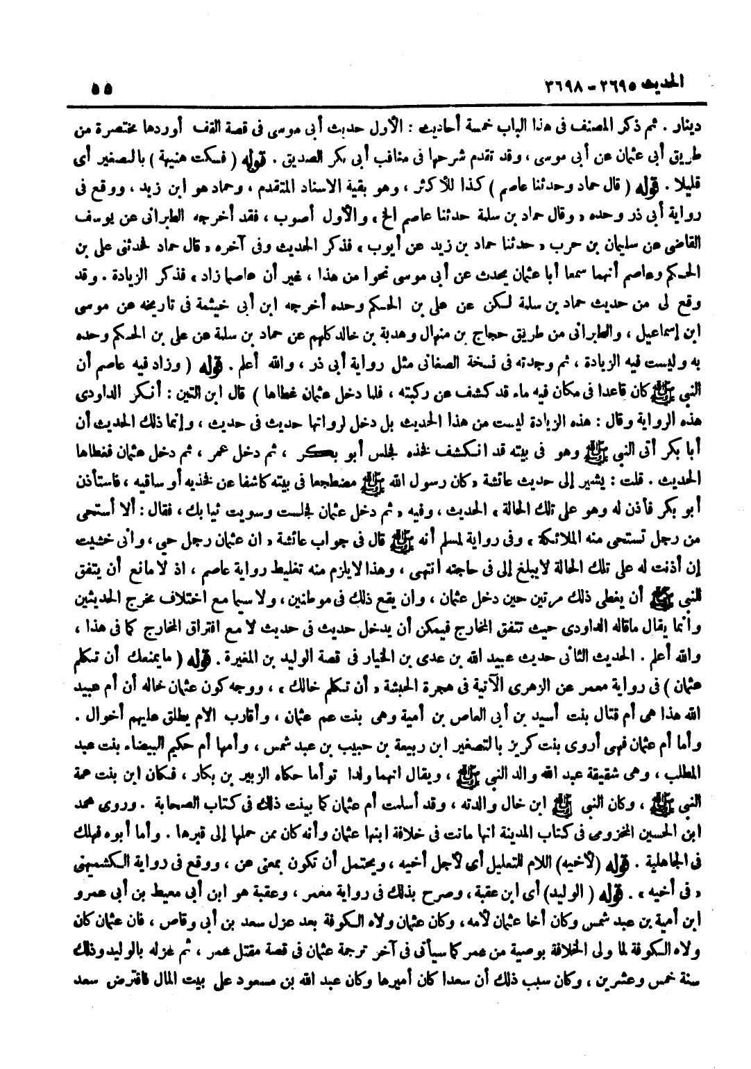 [3695] قَوْلُهُ فَسَكَتَ هُنَيْهَةً بِالتَّصْغِيرِ أَيْ قَلِيلًا قَوْلُهُ قَالَ حَمَّادٌ وَحَدَّثَنَا عَاصِمٌ كَذَا لِلْأَكْثَرِ وَهُوَ بَقِيَّةُ الْإِسْنَادِ الْمُتَقَدّم وَحَمَّاد هُوَ بن زَيْدٍ وَوَقَعَ فِي رِوَايَةِ أَبِي ذَرٍّ وَحْدَهُ وَقَالَ حَمَّادُ بْنُ سَلَمَةَ حَدَّثَنَا عَاصِمٌ إِلَخْ وَالْأَوَّلُ أَصْوَبُ فَقَدْ أَخْرَجَهُ الطَّبَرَانِيُّ عَنْ يُوسُفَ الْقَاضِي عَنْ سُلَيْمَانَ بْنِ حَرْبٍ حَدَّثَنَا حَمَّادُ بْنُ زَيْدٍ عَنْ أَيُّوبَ فَذَكَرَ الْحَدِيثَ وَفِي آخِرِهِ قَالَ حَمَّادٌ فَحَدَّثَنِي عَلِيُّ بْنُ الْحَكَمِ وَعَاصِمٌ أَنَّهُمَا سَمِعَا أَبَا عُثْمَانَ يُحَدِّثُ عَنْ أَبِي مُوسَى نَحْوًا مِنْ هَذَا غَيْرَ أَنَّ عَاصِمًا زَادَ فَذَكَرَ الزِّيَادَةَ وَقَدْ وَقَعَ لِي مِنْ حَدِيثِ حَمَّادِ بْنِ سَلَمَةَ لَكِنْ عَنْ عَليّ بن الحكم وَحده أخرجه بن أَبِي خَيْثَمَةَ فِي تَارِيخِهِ عَنْ مُوسَى بْنِ إِسْمَاعِيلَ وَالطَّبَرَانِيُّ مِنْ طَرِيقِ حَجَّاجِ بْنِ مِنْهَالَ وَهُدْبَةَ بْنِ خَالِدٍ كُلُّهُمْ عَنْ حَمَّادِ بْنِ سَلَمَةَ عَنْ عَلِيِّ بْنِ الْحَكَمِ وَحْدَهُ بِهِ وَلَيْسَتْ فِيهِ الزِّيَادَةُ ثُمَّ وَجَدْتُهُ فِي نُسْخَةِ الصَّغَانِيِّ مِثْلَ رِوَايَةِ أَبِي ذَرٍّ وَاللَّهُ أَعْلَمُ قَوْلُهُ وَزَادَ فِيهِ عَاصِمٌ أَنَّ النَّبِيَّ صَلَّى اللَّهُ عَلَيْهِ وَسَلَّمَ كَانَ قَاعِدًا فِي مَكَانٍ فِيهِ مَاءٌ قَدْ كَشَفَ عَنْ رُكْبَتِهِ فَلَمَّا دخل عُثْمَان غطاها قَالَ بن التِّينِ أَنْكَرَ الدَّاوُدِيُّ هَذِهِ الرِّوَايَةَ وَقَالَ هَذِهِ الزِّيَادَةُ لَيْسَتْ مِنْ هَذَا الْحَدِيثِ بَلْ دَخَلَ لِرُوَاتِهَا حَدِيثٌ فِي حَدِيثٍ وَإِنَّمَا ذَلِكَ الْحَدِيثُ أَنَّ أَبَا بَكْرٍ أَتَى النَّبِيَّ صَلَّى اللَّهُ عَلَيْهِ وَسَلَّمَ وَهُوَ فِي بَيْتِهِ قَدِ انْكَشَفَ فَخِذُهُ فَجَلَسَ أَبُو بَكْرٍ ثُمَّ دَخَلَ عُمَرُ ثُمَّ دَخَلَ عُثْمَانُ فَغَطَّاهَا الْحَدِيثُ قُلْتُ يُشِيرُ إِلَى حَدِيثِ عَائِشَةَ كَانَ رَسُولُ اللَّهِ صَلَّى اللَّهُ عَلَيْهِ وَسَلَّمَ مُضْطَجِعًا فِي بَيْتِهِ كَاشِفًا عَنْ فَخِذَيْهِ أَوْ سَاقَيْهِ فَاسْتَأْذَنَ أَبُو بَكْرٍ فَأَذِنَ لَهُ وَهُوَ عَلَى تِلْكَ الْحَالَةِ الْحَدِيثُ وَفِيهِ ثُمَّ دَخَلَ عُثْمَانُ فَجَلَسْتَ وَسَوَّيْتَ ثِيَابَكَ فَقَالَ أَلَا أَسْتَحِي مِنْ رَجُلٍ تَسْتَحِي مِنْهُ الْمَلَائِكَةُ وَفِي رِوَايَةٍ لِمُسْلِمٍ أَنَّهُ صَلَّى اللَّهُ عَلَيْهِ وَسَلَّمَ قَالَ فِي جَوَابِ عَائِشَةَ إِنَّ عُثْمَانَ رَجُلٌ حَيِيٌّ وَإِنِّي خَشِيتُ إِنْ أَذِنْتُ لَهُ على تِلْكَ الْحَالة لايبلغ إِلَيَّ فِي حَاجَتِهِ انْتَهَى وَهَذَا لَا يَلْزَمُ مِنْهُ تَغْلِيطُ رِوَايَةِ عَاصِمٍ إِذْ لَا مَانِعَ أَنْ يَتَّفِقَ لِلنَّبِيِّ صَلَّى اللَّهُ عَلَيْهِ وَسَلَّمَ أَنْ يُغَطِّيَ ذَلِكَ مَرَّتَيْنِ حِينَ دَخَلَ عُثْمَانُ وَأَنْ يَقَعَ ذَلِكَ فِي مَوْطِنَيْنِ وَلَا سِيَّمَا مَعَ اخْتِلَافِ مَخْرَجِ الْحَدِيثَيْنِ وَإِنَّمَا يُقَالُ مَا قَالَهُ الدَّاوُدِيُّ حَيْثُ تَتَّفِقُ الْمَخَارِجُ فَيُمْكِنُ أَنْ يَدْخُلَ حَدِيثٌ فِي حَدِيثٍ لَا مَعَ افْتِرَاقِ المخارج كَمَا فِي هَذَا وَالله اعْلَم الحَدِيث الثَّانِي حَدِيث عبيد الله بن عدي بن الْخِيَار فِي قصَّة الْوَلِيد بن الْمُغيرَة