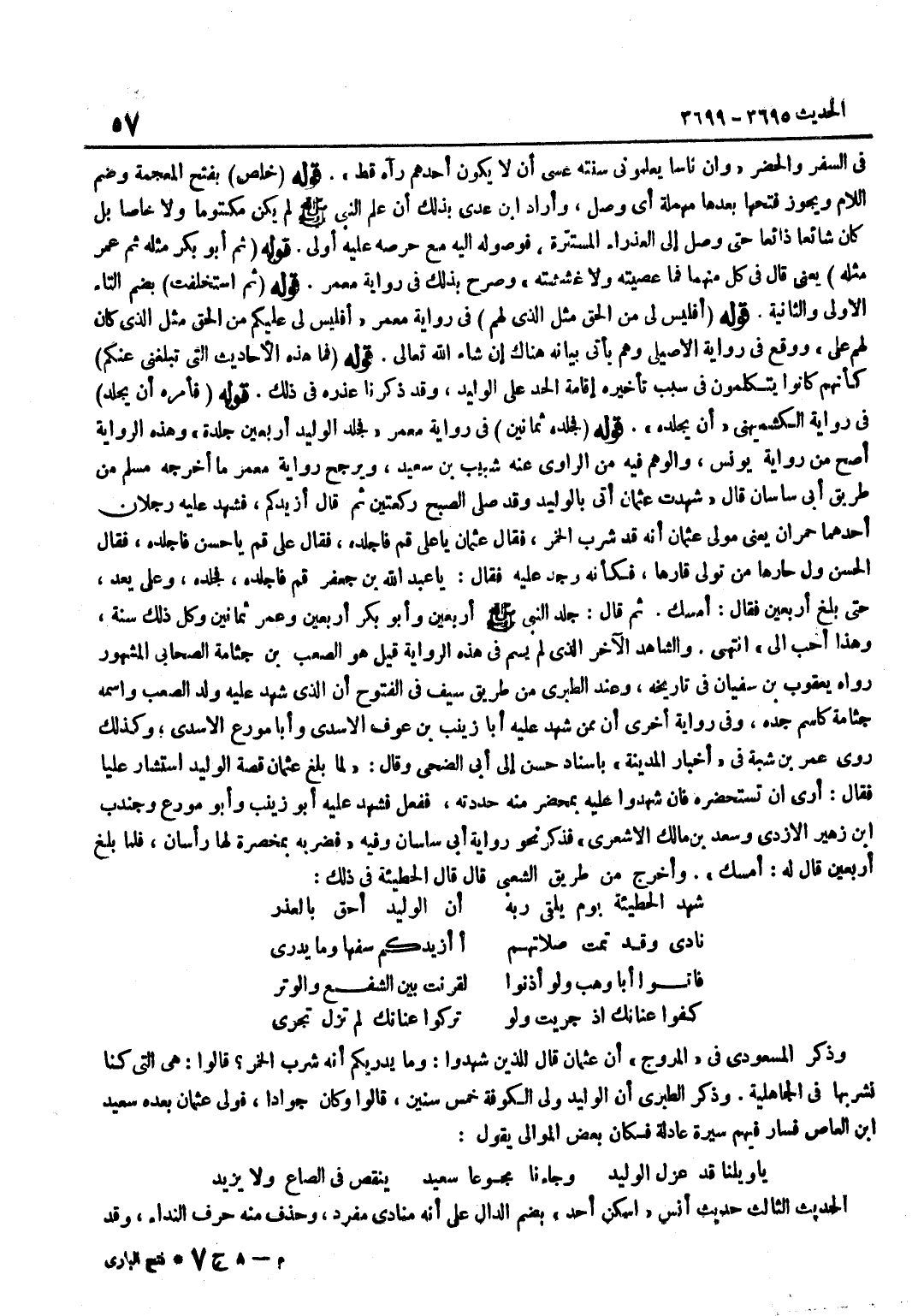 فِي السّفر والحضر وان نَاسا يعلموني سُنَّتَهُ عَسَى أَنْ لَا يَكُونَ أَحَدُهُمْ رَآهُ قَطُّ قَوْلُهُ خَلُصَ بِفَتْحِ الْمُعْجَمَةِ وَضَمِّ اللَّامِ وَيَجُوزُ فَتْحُهَا بَعْدَهَا مُهْمَلَةٌ أَيْ وَصَلَ وَأَرَادَ بن عَدِيٍّ بِذَلِكَ أَنَّ عِلْمِ النَّبِيَّ صَلَّى اللَّهُ عَلَيْهِ وَسَلَّمَ لَمْ يَكُنْ مَكْتُومًا وَلَا خَاصًّا بل كَانَ شَائِعا ذائعا حَتَّى وَصَلَ إِلَى الْعَذْرَاءِ الْمُسْتَتِرَةِ فَوُصُولُهُ إِلَيْهِ مَعَ حِرْصِهِ عَلَيْهِ أَوْلَى قَوْلُهُ ثُمَّ أَبُو بَكْرٍ مِثْلُهُ ثُمَّ عُمَرُ مِثْلُهُ يَعْنِي قَالَ فِي كُلٍّ مِنْهُمَا فَمَا عَصَيْتُهُ وَلَا غَشَشْتُهُ وَصَرَّحَ بِذَلِكَ فِي رِوَايَةِ مَعْمَرٍ قَوْلُهُ ثُمَّ اسْتُخْلِفْتُ بِضَمِّ التَّاءِ الْأُولَى وَالثَّانِيَةِ قَوْلُهُ أَفَلَيْسَ لِي مِنَ الْحَقِّ مِثْلُ الَّذِي لَهُمْ فِي رِوَايَةِ مَعْمَرٍ أَفَلَيْسَ لِي عَلَيْكُمْ مِنَ الْحَقِّ مِثْلُ الَّذِي كَانَ لَهُمْ عَلَيَّ وَوَقَعَ فِي رِوَايَةِ الْأَصِيلِيِّ وَهَمٌ يَأْتِي بَيَانُهُ هُنَاكَ إِنْ شَاءَ اللَّهُ تَعَالَى قَوْلُهُ فَمَا هَذِهِ الْأَحَادِيثُ الَّتِي تَبْلُغُنِي عَنْكُمْ كَأَنَّهُمْ كَانُوا يَتَكَلَّمُونَ فِي سَبَبِ تَأْخِيرِهِ إِقَامَةَ الْحَدِّ عَلَى الْوَلِيدِ وَقَدْ ذَكَرْنَا عُذْرَهُ فِي ذَلِكَ قَوْلُهُ فَأَمَرَهُ أَنْ يَجْلِدَ فِي رِوَايَةِ الْكُشْمِيهَنِيِّ أَنْ يَجْلِدَهُ قَوْلُهُ فَجَلَدَهُ ثَمَانِينَ فِي رِوَايَةِ مَعْمَرٍ فَجَلَدَ الْوَلِيدَ أَرْبَعِينَ جَلْدَةً وَهَذِهِ الرِّوَايَةُ أَصَحُّ مِنْ رِوَايَةِ يُونُسَ وَالْوَهَمُ فِيهِ مِنَ الرَّاوِي عَنْهُ شُبَيْبُ بْنُ سَعِيدٍ وَيُرَجِّحُ رِوَايَةَ مَعْمَرٍ مَا أَخْرَجَهُ مُسْلِمٌ مِنْ طَرِيقِ أَبِي سَاسَانِ قَالَ شَهِدْتُ عُثْمَانَ أَتَى بِالْوَلِيدِ وَقَدْ صَلَّى الصُّبْحَ رَكْعَتَيْنِ ثُمَّ قَالَ أَزِيدُكُمْ فَشَهِدَ عَلَيْهِ رَجُلَانِ أَحَدُهُمَا حُمْرَانَ يَعْنِي مَوْلَى عُثْمَانَ أَنَّهُ قَدْ شَرِبَ الْخَمْرَ فَقَالَ عُثْمَانُ يَا عَلِيُّ قُمْ فَاجْلِدْهُ فَقَالَ عَلِيٌّ قُمْ يَا حَسَنُ فَاجْلِدْهُ فَقَالَ الْحَسَنُ وَلِّ حَارَّهَا مَنْ تَوَلَّى قَارَّهَا فَكَأَنَّهُ وَجَدَ عَلَيْهِ فَقَالَ يَا عَبْدَ اللَّهِ بْنَ جَعْفَرٍ قُمْ فَاجْلِدْهُ فَجَلَدَهُ وَعَلِيٌّ يَعُدُّ حَتَّى بَلَغَ أَرْبَعِينَ فَقَالَ أَمْسِكْ ثُمَّ قَالَ جَلَدَ النَّبِيُّ صَلَّى اللَّهُ عَلَيْهِ وَسَلَّمَ أَرْبَعِينَ وَأَبُو بَكْرٍ أَرْبَعِينَ وَعُمَرُ ثَمَانِينَ وَكُلُّ ذَلِكَ سُنَّةٌ وَهَذَا أَحَبُّ إِلَيَّ انْتَهَى وَالشَّاهِدُ الْآخَرُ الَّذِي لَمْ يُسَمَّ فِي هَذِهِ الرِّوَايَةِ قِيلَ هُوَ الصَّعْبُ بْنُ جُثَامَةَ الصَّحَابِيُّ الْمَشْهُورُ رَوَاهُ يَعْقُوبُ بْنُ سُفْيَانَ فِي تَارِيخِهِ وَعِنْدَ الطَّبَرِيِّ مِنْ طَرِيقِ سَيْفٍ فِي الْفُتُوحِ أَنَّ الَّذِي شَهِدَ عَلَيْهِ وَلَدُ الصَّعْبِ وَاسْمُهُ جُثَامَةُ كَاسْمِ جَدِّهِ وَفِي رِوَايَةٍ أُخْرَى أَنَّ مِمَّنْ شَهِدَ عَلَيْهِ أَبَا زَيْنَب بن عَوْفٍ الْأَسَدِيَّ وَأَبَا مُوَرِّعٍ الْأَسَدِيَّ وَكَذَلِكَ رَوَى عُمَرُ بْنُ شَبَّةَ فِي أَخْبَارِ الْمَدِينَةِ بِإِسْنَادٍ حَسَنٍ إِلَى أَبِي الضُّحَى وَقَالَ لَمَّا بَلَغَ عُثْمَانَ قِصَّةُ الْوَلِيدِ اسْتَشَارَ عَلِيًّا فَقَالَ أَرَى أَنْ تَسْتَحْضِرَهُ فَإِنْ شَهِدُوا عَلَيْهِ بِمَحْضَرٍ مِنْهُ حَدَدْتَهُ فَفَعَلَ فَشَهِدَ عَلَيْهِ أَبُو زَيْنَبَ وَأَبُو مُوَرِّعٍ وَجُنْدَبُ بْنُ زُهَيْرٍ الْأَزْدِيُّ وَسَعْدُ بْنُ مَالِكٍ الْأَشْعَرِيُّ فَذَكَرَ نَحْوَ رِوَايَةِ أَبِي سَاسَانَ وَفِيهِ فَضَرَبَهُ بِمِخْصَرَةٍ لَهَا رَأْسَانِ فَلَمَّا بَلَغَ أَرْبَعِينَ قَالَ لَهُ أَمْسِكْ و
