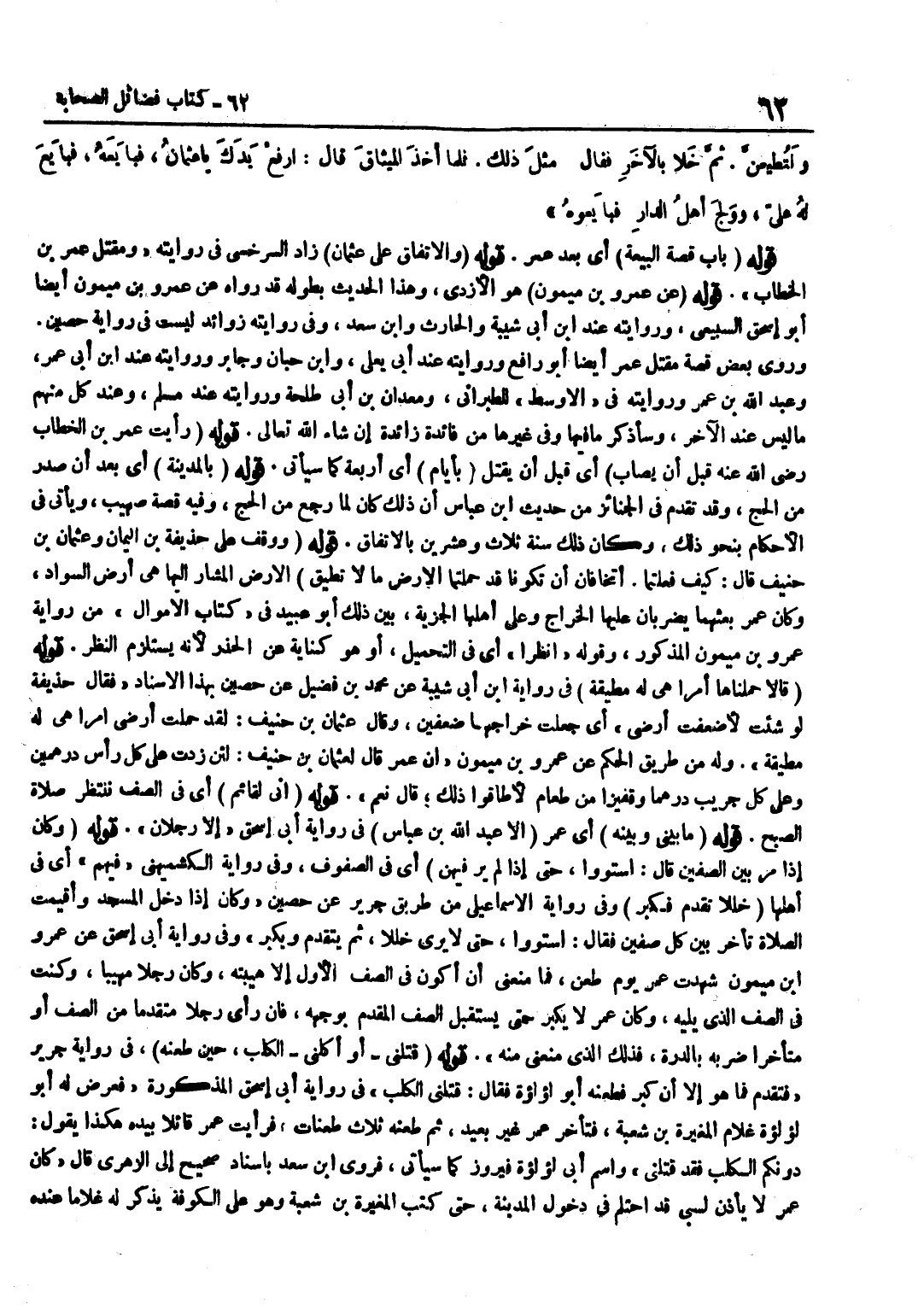 [3700] قَوْلُهُ عَنْ عَمْرِو بْنِ مَيْمُونٍ هُوَ الْأَزْدِيُّ وَهَذَا الْحَدِيثُ بِطُولِهِ قَدْ رَوَاهُ عَنْ عَمْرِو بْنِ مَيْمُونٍ أَيْضا أَبُو إِسْحَاق السبيعِي وَرِوَايَته عِنْد بن أبي شيبَة والْحَارث وبن سَعْدٍ وَفِي رِوَايَتِهِ زَوَائِدُ لَيْسَتْ فِي رِوَايَةِ حُصَيْنٍ وَرَوَى بَعْضَ قِصَّةِ مَقْتَلِ عُمَرَ أَيْضًا أَبُو رَافع وَرِوَايَته عِنْد أبي يعلى وبن حبَان وَجَابِر وَرِوَايَته عِنْد بن أَبِي عُمَرَ وَعَبْدِ اللَّهِ بْنِ عُمَرَ وَرِوَايَتُهُ فِي الْأَوْسَطِ لِلطَّبَرَانِيِّ وَمَعْدَانَ بْنِ أَبِي طَلْحَةَ وَرِوَايَتُهُ عِنْدَ مُسْلِمٍ وَعِنْدَ كُلٍّ مِنْهُمْ مَا لَيْسَ عِنْدَ الْآخَرِ وَسَأَذْكُرُ مَا فِيهَا وَفِي غَيْرِهَا مِنْ فَائِدَةٍ زَائِدَةٍ إِنْ شَاءَ اللَّهُ تَعَالَى قَوْلُهُ رَأَيْتُ عُمَرَ بْنَ الْخَطَّابِ رَضِيَ اللَّهُ عَنْهُ قَبْلَ أَنْ يُصَابَ أَيْ قَبْلَ أَنْ يُقْتَلَ بِأَيَّامٍ أَيْ أَرْبَعَةٍ كَمَا سَيَأْتِي قَوْلُهُ بِالْمَدِينَةِ أَيْ بَعْدَ أَنْ صَدَرَ مِنَ الْحَجِّ وَقَدْ تَقَدَّمَ فِي الْجَنَائِزِ مِنْ حَدِيثِ بن عَبَّاسٍ أَنَّ ذَلِكَ كَانَ لَمَّا رَجَعَ مِنَ الْحَجِّ وَفِيهِ قِصَّةُ صُهَيْبٍ وَيَأْتِي فِي الْأَحْكَامِ بِنَحْوِ ذَلِكَ وَكَانَ ذَلِكَ سَنَةَ ثَلَاثٍ وَعِشْرِينَ بِالِاتِّفَاقِ قَوْلُهُ وَوَقَفَ عَلَى حُذَيْفَةَ بْنِ الْيَمَانِ وَعُثْمَانَ بْنِ حُنَيْفٍ قَالَ كَيْفَ فَعَلْتُمَا أَتَخَافَانِ أَنْ تَكُونَا قَدْ حَمَّلْتُمَا الْأَرْضَ مَا لَا تُطِيقُ الْأَرْضُ الْمُشَارُ إِلَيْهَا هِيَ أَرْضُ السَّوَادِ وَكَانَ عُمَرُ بَعَثَهُمَا يَضْرِبَانِ عَلَيْهَا الْخَرَاجَ وَعَلَى أَهْلِهَا الْجِزْيَةُ بَيَّنَ ذَلِكَ أَبُو عُبَيْدٍ فِي كِتَابِ الْأَمْوَالِ مِنْ رِوَايَةِ عَمْرِو بْنِ مَيْمُونٍ الْمَذْكُورِ وَقَوْلُهُ انْظُرَا أَيْ فِي التَّحْمِيلِ أَوْ هُوَ كِنَايَةٌ عَنِ الْحَذَرِ لِأَنَّهُ يَسْتَلْزِمُ النَّظَرَ قَوْلُهُ قَالَا حَمَّلْنَاهَا أَمْرًا هِيَ لَهُ مُطِيقَةٌ فِي رِوَايَة بن أَبِي شَيْبَةَ عَنْ مُحَمَّدِ بْنِ فُضَيْلٍ عَنْ حُصَيْنٍ بِهَذَا الْإِسْنَادِ فَقَالَ حُذَيْفَةُ لَوْ شِئْتُ لَأَضْعَفْتُ أَرْضِي أَيْ جَعَلْتُ خَرَاجَهَا ضِعْفَيْنِ وَقَالَ عُثْمَانُ بْنُ حُنَيْفٍ لَقَدْ حَمَّلْتُ أَرْضِي أَمْرًا هِيَ لَهُ مُطِيقَةٌ وَلَهُ مِنْ طَرِيقِ الْحَكَمِ عَنْ عَمْرِو بْنِ مَيْمُونٍ أَنَّ عُمَرَ قَالَ لِعُثْمَانَ بْنِ حُنَيْفٍ لَئِنْ زِدْتُ عَلَى كُلِّ رَأْسٍ دِرْهَمَيْنِ وَعَلَى كُلِّ جَرِيبٍ دِرْهَمًا وَقَفِيزًا مِنْ طَعَامٍ لَأَطَاقُوا ذَلِكَ قَالَ نَعَمْ قَوْلُهُ إِنِّي لَقَائِمٌ أَيْ فِي الصَّفِّ نَنْتَظِرُ صَلَاةَ الصُّبْح قَوْله مابيني وَبَيْنَهُ أَيْ عُمَرَ إِلَّا عَبْدُ اللَّهِ بْنُ عَبَّاسٍ فِي رِوَايَةِ أَبِي إِسْحَاقَ إِلَّا رَجُلَانِ قَوْلُهُ وَكَانَ إِذَا مَرَّ بَيْنَ الصَّفَّيْنِ قَالَ اسْتَوُوا حَتَّى إِذَا لَمْ يَرَ فِيهِنَّ أَيْ فِي الصُّفُوفِ وَفِي رِوَايَةِ الْكُشْمِيهَنِيِّ فِيهِمْ أَيْ فِي أَهْلِهَا خَلَلًا تَقَدَّمَ فَكَبَّرَ وَفِي رِوَايَةِ الْإِسْمَاعِيلِيِّ مِنْ طَرِيقِ جَرِيرٍ عَنْ حُصَيْنٍ وَكَانَ إِذَا دَخَلَ الْمَسْجِدَ وَأُقِيمَتِ الصَّلَاةُ تَأَخَّرَ بَيْنَ كُلِّ صَفَّيْنِ فَقَالَ اسْتَوُوا حَتَّى لَا يَرَى خَلَلًا ثُمَّ يَتَقَدَّمُ وَيُكَبِّرُ وَفِي رِوَايَةِ أَبِي إِسْحَاقَ عَنْ عَمْرِو بْنِ مَيْمُونٍ شَهِدْتُ عُمَرَ يَوْمَ طُعِنَ فَمَا مَنَعَنِي أَنْ أَكُونَ فِي الصَّفِّ الْأَوَّلِ إِلَّا هَيْبَتُهُ وَكَانَ رَجُلًا مَهِيبًا وَكُنْتُ فِي الصَّفِّ الَّذِي يَلِيهِ وَكَانَ عُمَرُ لَا يُكَبِّرُ حَتَّى يَسْتَقْبِلَ الصَّفَّ الْمُقَدَّمَ بِوَجْهِهِ فَإِنْ رَأَى رَجُلًا مُتَقَدِ