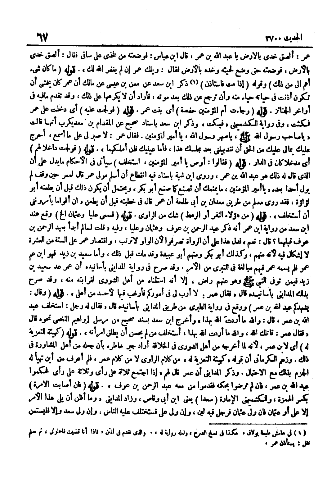 عُمَرُ أَلْصِقْ خَدِّي بِالْأَرْضِ يَا عَبْدَ اللَّهِ بن عمر قَالَ بن عَبَّاسٍ فَوَضَعْتُهُ مِنْ فَخِذِي عَلَى سَاقِي فَقَالَ أَلْصِقْ خَدِّي بِالْأَرْضِ فَوَضَعْتُهُ حَتَّى وَضَعَ لِحْيَتَهُ وَخَدَّهُ بِالْأَرْضِ فَقَالَ وَيْلَكَ عُمَرُ إِنْ لَمْ يَغْفِرِ اللَّهُ لَكَ قَوْلُهُ مَا كَانَ شَيْءٌ أَهَمَّ إِلَيَّ مِنْ ذَلِكَ وَقَوْلُهُ إِذَا مُتُّ فَاسْتَأْذن ذكر بن سَعْدٍ عَنْ مَعْنِ بْنِ عِيسَى عَنْ مَالِكٍ أَنَّ عُمَرَ كَانَ يَخْشَى أَنْ تَكُونَ أَذِنَتْ فِي حَيَاتِهِ حَيَاءً مِنْهُ وَأَنْ تَرْجِعَ عَنْ ذَلِكَ بَعْدَ مَوْتِهِ فَأَرَادَ أَنْ لَا يُكْرِهَهَا عَلَى ذَلِكَ وَقَدْ تَقَدَّمَ مَا فِيهِ فِي أَوَاخِرِ الْجَنَائِزِ قَوْلُهُ وَجَاءَتْ أُمُّ الْمُؤْمِنِينَ حَفْصَةُ أَيْ بِنْتُ عُمَرَ قَوْلُهُ فَوَلَجَتْ عَلَيْهِ أَيْ دَخَلَتْ عَلَى عُمَرَ فَمَكَثَتْ وَفِي رِوَايَةِ الْكُشْمِيهَنِيِّ فَبَكَتْ وَذكر بن سَعْدٍ بِإِسْنَادٍ صَحِيحٍ عَنِ الْمِقْدَامِ بْنِ مَعْدِيكَرِبَ أَنَّهَا قَالَتْ يَا صَاحِبَ رَسُولِ اللَّهِ صَلَّى اللَّهُ عَلَيْهِ وَسَلَّمَ يَا صِهْرَ رَسُولِ اللَّهِ يَا أَمِيرَ الْمُؤْمِنِينَ فَقَالَ عُمَرُ لَا صَبْرَ لي على مَا اسْمَع احرج عَلَيْك بِمَالي عَلَيْكِ مِنَ الْحَقِّ أَنْ تَنْدُبِينَنِي بَعْدَ مَجْلِسِكِ هَذَا فَأَمَّا عَيْنَيْكِ فَلَنْ أَمْلِكَهُمَا قَوْلُهُ فَوَلَجْتُ دَاخِلًا لَهُمْ أَيْ مَدْخَلًا كَانَ فِي الدَّارِ قَوْلُهُ فَقَالُوا أَوْصِ يَا أَمِيرَ الْمُؤْمِنِينَ اسْتَخْلِفْ سَيَأْتِي فِي الْأَحْكَامِ مَا يَدُلُّ عَلَى أَنَّ الَّذِي قَالَ لَهُ ذَلِكَ هُوَ عَبْدُ اللَّهِ بن عمر وروى بن شَبَّةَ بِإِسْنَادٍ فِيهِ انْقِطَاعٌ أَنَّ أَسْلَمَ مَوْلَى عُمَرَ قَالَ لِعُمَرَ حِينَ وَقَفَ لَمْ يُوَلِّ أحدا بعده يَا أَمِير الْمُؤمنِينَ مايمنعك أَنْ تَصْنَعَ كَمَا صَنَعَ أَبُو بَكْرٍ وَيَحْتَمِلُ أَنْ يَكُونَ ذَلِكَ قَبْلَ أَنْ يَطْعَنَهُ أَبُو لُؤْلُؤَةَ فَقَدْ رَوَى مُسْلِمٌ مِنْ طَرِيقِ مَعْدَانَ بْنِ أَبِي طَلْحَةَ أَنَّ عُمَرَ قَالَ فِي خُطْبَتِهِ قَبْلَ أَنْ يُطْعَنَ إِنَّ أَقْوَامًا يَأْمُرُونَنِي أَنْ أَسْتَخْلِفَ قَوْلُهُ مِنْ هَؤُلَاءِ النَّفَرِ أَوِ الرَّهْطِ شَكٌّ مِنَ الرَّاوِي قَوْلُهُ فَسَمَّى عَلِيًّا وَعُثْمَان الخ وَقع عِنْد بن سعد من رِوَايَة بن عُمَرَ أَنَّهُ ذَكَرَ عَبْدَ الرَّحْمَنِ بْنَ عَوْفٍ وَعُثْمَانَ وَعَلِيًّا وَفِيهِ قُلْتُ لِسَالِمٍ أَبَدَأُ بِعَبْدِ الرَّحْمَنِ بْنِ عَوْفٍ قَبْلَهُمَا قَالَ نَعَمْ فَدَلَّ هَذَا عَلَى أَنَّ الرُّوَاةَ تَصَرَّفُوا لِأَنَّ الْوَاوَ لَا تُرَتِّبُ وَاقْتِصَارُ عُمَرَ عَلَى السِّتَّةِ مِنَ الْعَشَرَةِ لَا إِشْكَالَ فِيهِ لِأَنَّهُ مِنْهُمْ وَكَذَلِكَ أَبُو بَكْرٍ وَمِنْهُمْ أَبُو عُبَيْدَةَ وَقَدْ مَاتَ قبل ذَلِك واما سعيد بن زيد فَهُوَ بن عَمِّ عُمَرَ فَلَمْ يُسَمِّهِ عُمَرُ فِيهِمْ مُبَالَغَةً فِي التَّبَرِّي مِنَ الْأَمْرِ وَقَدْ صَرَّحَ فِي رِوَايَة الْمَدَائِنِي بِأَسَانِيدِهِ أَنَّ عُمَرَ عَدَّ سَعِيدَ بْنَ زَيْدٍ فِيمَنْ تُوُفِّيَ النَّبِيُّ صَلَّى اللَّهُ عَلَيْهِ وَسَلَّمَ وَهُوَ عَنْهُمْ رَاضٍ إِلَّا أَنَّهُ اسْتَثْنَاهُ مِنْ أَهْلِ الشُّورَى لِقَرَابَتِهِ مِنْهُ وَقَدْ صَرَّحَ بِذَلِكَ الْمَدَائِنِي بِأَسَانِيدِهِ قَالَ فَقَالَ عُمَرُ لَا أَرَبَ لِي فِي أُمُورِكُمْ فَأَرْغَبَ فِيهَا لِأَحَدٍ مِنْ أَهْلِي قَوْلُهُ وَقَالَ يَشْهَدُكُمْ عَبْدِ اللَّهِ بْنِ عُمَرَ وَوَقَعَ فِي رِوَايَةِ الطَّبَرِيّ من طَرِيق الْمَدَائِنِي بِأَسَانِيدِهِ قَالَ فَقَالَ لَهُ رَجُلٌ اسْتَخْلِفْ عَبْدَ اللَّهِ بْنَ عُمَرَ قَالَ وَاللَّهِ مَا أَرَدْتُ الله بِهَذَا وَأخرج بن سَعْدٍ بِسَنَدٍ صَحِ