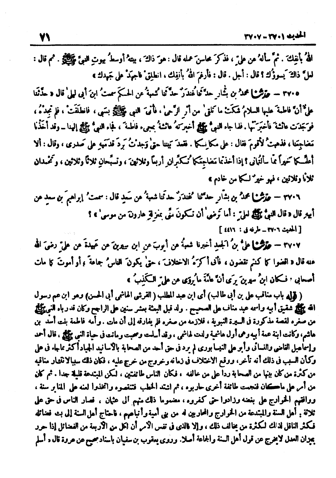أَي بن عَبْدِ الْمُطَّلِبِ الْقُرَشِيِّ الْهَاشِمِيِّ أَبِي الْحَسَنِ وَهُوَ بن عَمِّ رَسُولِ اللَّهِ صَلَّى اللَّهُ عَلَيْهِ وَسَلَّمَ شَقِيقُ أَبِيهِ وَاسْمُهُ عَبْدُ مَنَافٍ عَلَى الصَّحِيحِ وُلِدَ قَبْلَ الْبَعْثَةِ بِعَشْرِ سِنِينَ عَلَى الرَّاجِحِ وَكَانَ قَدْ رَبَّاهُ النَّبِيُّ صَلَّى اللَّهُ عَلَيْهِ وَسَلَّمَ مِنْ صِغَرِهِ لِقِصَّةٍ مَذْكُورَةٍ فِي السِّيرَةِ النَّبَوِيَّةِ فَلَازَمَهُ مِنْ صِغَرِهِ فَلَمْ يُفَارِقْهُ إِلَى أَنْ مَاتَ وَأُمُّهُ فَاطِمَةُ بِنْتُ أَسَدِ بْنِ هَاشِمٍ وَكَانَتِ ابْنَةَ عَمَّةِ أَبِيهِ وَهِيَ أَوَّلُ هَاشِمِيَّةٍ وَلَدَتْ لِهَاشِمِيٍّ وَقَدْ أَسْلَمَتْ وَصَحِبَتْ وَمَاتَتْ فِي حَيَاةِ النَّبِيِّ صَلَّى اللَّهُ عَلَيْهِ وَسَلَّمَ قَالَ أَحْمَدُ وَإِسْمَاعِيلُ الْقَاضِي وَالنَّسَائِيُّ وَأَبُو عَلِيٍّ النَّيْسَابُورِيُّ لَمْ يَرِدْ فِي حَقِّ أَحَدٍ مِنَ الصَّحَابَةِ بِالْأَسَانِيدِ الْجِيَادِ أَكْثَرُ مِمَّا جَاءَ فِي عَلِيٍّ وَكَأَنَّ السَّبَبَ فِي ذَلِكَ أَنَّهُ تَأَخَّرَ وَوَقَعَ الِاخْتِلَافُ فِي زَمَانِهِ وَخُرُوجِ مَنْ خَرَجَ عَلَيْهِ فَكَانَ ذَلِكَ سَبَبًا لِانْتِشَارِ مَنَاقِبِهِ مِنْ كَثْرَةِ مَنْ كَانَ بَيْنَهَا مِنَ الصَّحَابَةِ رَدًّا عَلَى مَنْ خَالَفَهُ فَكَانَ النَّاسُ طَائِفَتَيْنِ لَكِنِ الْمُبْتَدَعَةُ قَلِيلَةٌ جِدًّا ثُمَّ كَانَ مِنْ أَمْرِ عَلِيٍّ مَا كَانَ فَنَجَمَتْ طَائِفَةٌ أُخْرَى حَارَبُوهُ ثُمَّ اشْتَدَّ الْخَطْبُ فَتَنَقَّصُوهُ وَاتَّخَذُوا لَعْنَهُ عَلَى الْمَنَابِرِ سُنَّةً وَوَافَقَهُمُ الْخَوَارِجُ عَلَى بُغْضِهِ وَزَادُوا حَتَّى كَفَّرُوهُ مَضْمُومًا ذَلِكَ مِنْهُمْ إِلَى عُثْمَانَ فَصَارَ النَّاسُ فِي حَقِّ عَلِيٍّ ثَلَاثَةً أَهْلَ السُّنَّةِ وَالْمُبْتَدِعَةَ مِنَ الْخَوَارِجِ وَالْمُحَارِبِينَ لَهُ مِنْ بَنِي أُمَيَّةَ وَأَتْبَاعِهِمْ فَاحْتَاجَ أَهْلُ السُّنَّةِ إِلَى بَثِّ فَضَائِلِهِ فَكَثُرَ النَّاقِلُ لِذَلِكَ لِكَثْرَةِ مَنْ يُخَالِفُ ذَلِكَ وَإِلَّا فَالَّذِي فِي نَفْسِ الْأَمْرِ أَنَّ لِكُلٍّ مِنَ الْأَرْبَعَةِ مِنَ الْفَضَائِلِ إِذَا حُرِّرَ بِمِيزَانِ الْعَدْلِ لَا يَخْرُجُ عَنْ قَوْلِ أَهْلِ السُّنَّةِ وَالْجَمَاعَةِ أَصْلًا وَرَوَى يَعْقُوبُ بْنُ سُفْيَانَ بِإِسْنَادٍ صَحِيحٍ عَنْ عُرْوَةَ قَالَ أَسْلَمَ