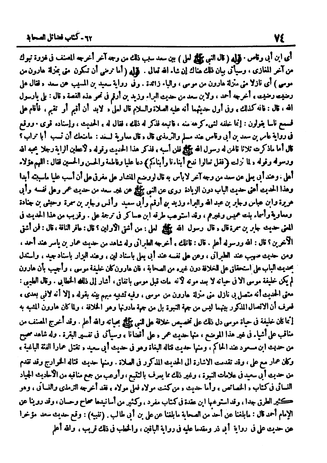 أَي بن أَبِي وَقَّاصٍ قَوْلُهُ قَالَ النَّبِيُّ صَلَّى اللَّهُ عَلَيْهِ وَسَلَّمَ لِعِلِّيٍّ بَيَّنَ سَعْدٌ سَبَبَ ذَلِكَ مِنْ وَجْهٍ آخَرَ أَخْرَجَهُ الْمُصَنِّفُ فِي غَزْوَةِ تَبُوكَ مِنْ آخِرِ الْمَغَازِي وَسَيَأْتِي بَيَانُ ذَلِكَ هُنَاكَ إِنْ شَاءَ اللَّهُ تَعَالَى قَوْلُهُ أَمَا تَرْضَى أَنْ تَكُونَ مِنِّي بِمَنْزِلَةِ هَارُونَ مِنْ مُوسَى أَيْ نَازِلًا مِنِّي مَنْزِلَةَ هَارُونَ مِنْ مُوسَى وَالْبَاءُ زَائِدَةٌ وَفِي رِوَايَةِ سَعِيدِ بْنِ الْمُسَيَّبِ عَنْ سَعْدٍ فَقَالَ عَلِيٌّ رَضِيتُ رَضِيتُ أَخْرَجَهُ أَحْمَدُ وَلِابْنِ سَعْدٍ مِنْ حَدِيثِ الْبَرَاءِ بْنِ أَرْقَمَ فِي نَحْوِ هَذِهِ الْقِصَّةِ قَالَ بَلَى يَا رَسُولَ اللَّهِ قَالَ فَإِنَّهُ كَذَلِكَ وَفِي أَوَّلِ حَدِيثِهِمَا أَنَّهُ عَلَيْهِ الصَّلَاةُ وَالسَّلَامُ قَالَ لعَلي لابد أَنْ أُقِيمَ أَوْ تُقِيمَ فَأَقَامَ عَلِيٌّ فَسَمِعَ نَاسًا يَقُولُونَ إِنَّمَا خَلَّفَهُ لِشَيْءٍ كَرِهَهُ مِنْهُ فَاتَّبَعَهُ فَذَكَرَ لَهُ ذَلِكَ فَقَالَ لَهُ الْحَدِيثَ وَإِسْنَادُهُ قَوِيٌّ وَوَقَعَ فِي رِوَايَةِ عَامِرِ بْنِ سَعْدِ بْنِ أَبِي وَقَّاصٍ عِنْدَ مُسْلِمٍ وَالتِّرْمِذِيِّ قَالَ قَالَ مُعَاوِيَةُ لِسَعْدٍ مَا مَنَعَكَ أَنْ تَسُبَّ أَبَا تُرَابٍ قَالَ أَمَّا مَا ذَكَرْتَ ثَلَاثًا قَالَهُنَّ لَهُ رَسُولُ اللَّهِ صَلَّى اللَّهُ عَلَيْهِ وَسَلَّمَ فَلَنْ أَسُبَّهُ فَذَكَرَ هَذَا الْحَدِيثَ وَقَوْلَهُ لَأُعْطِيَنَّ الرَّايَةَ رَجُلًا يُحِبُّهُ اللَّهُ وَرَسُولُهُ وَقَوْلَهُ لَمَّا نَزَلَتْ فَقُلْ تَعَالَوْا نَدْعُ أَبْنَاءَنَا وابناءكم دَعَا عَلِيًّا وَفَاطِمَةَ وَالْحَسَنَ وَالْحُسَيْنَ فَقَالَ اللَّهُمَّ هَؤُلَاءِ أَهْلِي وَعِنْدَ أَبِي يَعْلَى عَنْ سَعْدٍ مِنْ وَجْهٍ آخَرَ لَا بَأْسَ بِهِ قَالَ لَوْ وُضِعَ الْمِنْشَارُ عَلَى مَفْرِقِي عَلَى أَنْ أَسُبَّ عَلِيًّا مَا سَبَبْتُهُ أَبَدًا وَهَذَا الْحَدِيثُ أَعْنِي حَدِيثَ الْبَابِ دُونَ الزِّيَادَةِ رُوِيَ عَنِ النَّبِيِّ صَلَّى اللَّهُ عَلَيْهِ وَسَلَّمَ عَنْ غَيْرِ سَعْدٍ مِنْ حَدِيثِ عُمَرَ وَعَلِيٍّ نَفْسِهِ وَأَبِي هُرَيْرَة وبن عَبَّاسٍ وَجَابِرِ بْنِ عَبْدِ اللَّهِ وَالْبَرَاءِ وَزَيْدِ بْنِ أَرْقَمَ وَأَبِي سَعِيدٍ وَأَنَسٍ وَجَابِرِ بْنِ سَمُرَةَ وَحُبْشِيِّ بْنِ جُنَادَةَ وَمُعَاوِيَةَ وَأَسْمَاءَ بِنْتِ عُمَيْس وَغَيرهم وَقد استوعب طرقه بن عَسَاكِرَ فِي تَرْجَمَةِ عَلِيٍّ وَقَرِيبٌ مِنْ هَذَا الْحَدِيثِ فِي الْمَعْنَى حَدِيثُ جَابِرِ بْنِ سَمُرَةَ قَالَ صَلَّى اللَّهُ عَلَيْهِ وَسَلَّمَ لِعَلِيٍّ مَنْ أَشْقَى الْأَوَّلِينَ قَالَ عَاقِرُ النَّاقَةِ قَالَ فَمَنْ أَشْقَى الْآخِرِينَ قَالَ اللَّهُ وَرَسُولُهُ أَعْلَمُ قَالَ قَاتِلُكَ أَخْرَجَهُ الطَّبَرَانِيُّ وَلَهُ شَاهِدٌ مِنْ حَدِيثِ عَمَّارِ بْنِ يَاسِرٍ عِنْدَ أَحْمَدَ وَمِنْ حَدِيثِ صُهَيْبٍ عِنْدَ الطَّبَرَانِيِّ وَعَنْ عَلِيٍّ نَفْسِهِ عِنْدَ أَبِي يَعْلَى بِإِسْنَادٍ لَيِّنٍ وَعِنْدَ الْبَزَّارِ بِإِسْنَادٍ جَيِّدٍ وَاسْتُدِلَّ بِحَدِيثِ الْبَابِ عَلَى اسْتِحْقَاقِ عَلِيٍّ لِلْخِلَافَةِ دُونَ غَيْرِهِ مِنَ الصَّحَابَةِ فَإِنَّ هَارُونَ كَانَ خَلِيفَةَ مُوسَى وَأُجِيبَ بِأَنَّ هَارُونَ لَمْ يَكُنْ خَلِيفَةَ مُوسَى إِلَّا فِي حَيَاتِهِ لَا بَعْدَ مَوْتِهِ لِأَنَّهُ مَاتَ قَبْلَ مُوسَى بِاتِّفَاقٍ أَشَارَ إِلَى ذَلِكَ الْخَطَّابِيُّ وَقَالَ الطِّيبِيُّ مَعْنَى الْحَدِيثِ أَنَّهُ مُتَّصِلٌ بِي نَازِلٌ مِنِّي مَنْزِلَةَ هَارُونَ مِنْ مُوسَى وَفِيهِ تَشْبِيهٌ مُبْهَمٌ بَيَّنَهُ بِقَوْلِهِ إِلَّا أَنَّهُ لَا نَبِيَّ بَعْدِي فَعُرِفَ أَنَّ الِاتِّصَالَ الْمَذْكُورَ بَيْنَهُمَا