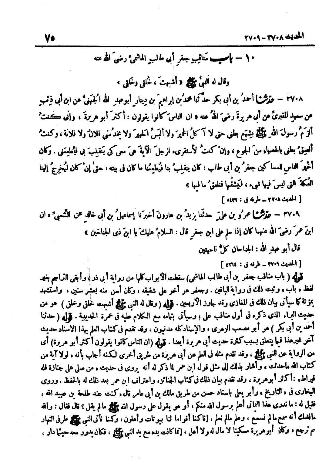 سَقَطَتِ الْأَبْوَابُ كُلُّهَا مِنْ رِوَايَةِ أَبِي ذَرٍّ وَأَبْقَى التَّرَاجِمَ بِغَيْرِ لَفْظِ بَابُ وَثَبَتَ ذَلِكَ فِي رِوَايَةِ الْبَاقِينَ وَجَعْفَرٌ هُوَ أَخُو عَلِيٍّ شَقِيقُهُ وَكَانَ أَسَنَّ مِنْهُ بِعَشْرِ سِنِينَ وَاسْتُشْهِدَ بِمُؤْتَةَ كَمَا سَيَأْتِي بَيَانُ ذَلِكَ فِي الْمَغَازِي وَقَدْ جَاوَزَ الْأَرْبَعِينَ قَوْلُهُ وَقَالَ لَهُ النَّبِيُّ صَلَّى اللَّهُ عَلَيْهِ وَسَلَّمَ أَشْبَهْتَ خَلْقِي وَخُلُقِي هُوَ مِنْ حَدِيثِ الْبَرَاءِ الَّذِي ذَكَرَهُ فِي أَوَّلِ مَنَاقِبِ عَلِيٍّ وَسَيَأْتِي بِتَمَامِهِ مَعَ الْكَلَامِ عَلَيْهِ فِي عُمْرَةِ الْحُدَيْبِيَةِ