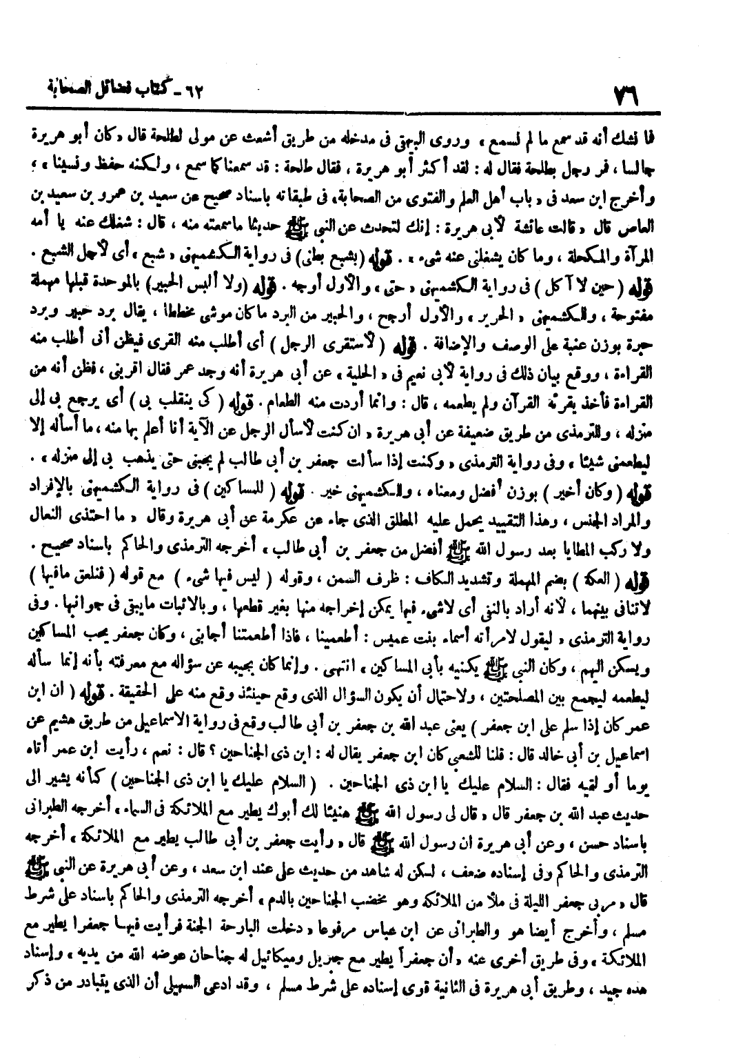 فَمَا نَشُكُّ أَنَّهُ قَدْ سَمِعَ مَا لَمْ نَسْمَعْ وَرَوَى الْبَيْهَقِيُّ فِي مَدْخَلِهِ مِنْ طَرِيقِ أَشْعَثَ عَنْ مَوْلًى لِطَلْحَةَ قَالَ كَانَ أَبُو هُرَيْرَةَ جَالِسًا فَمَرَّ رَجُلٌ بِطَلْحَةَ فَقَالَ لَهُ لَقَدْ أَكْثَرَ أَبُو هُرَيْرَةَ فَقَالَ طَلْحَةُ قَدْ سَمِعْنَا كَمَا سَمِعَ وَلَكِنَّهُ حَفِظَ وَنَسِينَا وَأَخْرَجَ بن سَعْدٍ فِي بَابِ أَهْلِ الْعِلْمِ وَالْفَتْوَى مِنَ الصَّحَابَةِ فِي طَبَقَاتِهِ بِإِسْنَادٍ صَحِيحٍ عَنْ سَعِيدُ بْنُ عَمْرِو بْنِ سَعِيدِ بْنِ الْعَاصِ قَالَ قَالَتْ عَائِشَةُ لِأَبِي هُرَيْرَةَ إِنَّكَ لَتُحَدِّثُ عَنِ النَّبِيِّ صَلَّى اللَّهُ عَلَيْهِ وَسَلَّمَ حَدِيثًا ماسمعته مِنْهُ قَالَ شَغَلَكِ عَنْهُ يَا أُمَّهْ الْمِرْآةُ وَالْمُكْحُلَةُ وَمَا كَانَ يَشْغَلُنِي عَنْهُ شَيْءٌ قَوْلُهُ بِشَبَعِ بَطْنِي فِي رِوَايَةِ الْكُشْمِيهَنِيِّ شَبَعَ أَيْ لِأَجْلِ الشَّبَعِ قَوْلُهُ حِينَ لَا آكُلُ فِي رِوَايَةِ الْكُشْمِيهَنِيِّ حَتَّى وَالْأَوَّلُ أَوْجَهُ قَوْلُهُ وَلَا أَلْبَسُ الْحَبِيرَ بِالْمُوَحَّدَةِ قَبْلَهَا مُهْمَلَةٌ مَفْتُوحَةٌ وَلِلْكُشْمِيهَنِيِّ الْحَرِيرَ وَالْأَوَّلُ أَرْجَحُ وَالْحَبِيرُ مِنَ الْبُرْدِ مَا كَانَ مُوَشًّى مُخَطَّطًا يُقَالُ بُرْدٌ حَبِيرٌ وَبُرْدٌ حِبَرَةٌ بِوَزْنِ عِنَبَةٍ عَلَى الْوَصْفِ وَالْإِضَافَةِ قَوْلُهُ لَأَسْتَقْرِي الرَّجُلَ أَيْ أَطْلُبُ مِنْهُ الْقِرَى فَيَظُنُّ أَنِّي أَطْلُبُ مِنْهُ الْقِرَاءَةَ وَوَقَعَ بَيَانُ ذَلِكَ فِي رِوَايَةٍ لِأَبِي نُعَيْمٍ فِي الْحِلْيَةِ عَنْ أَبِي هُرَيْرَةَ أَنَّهُ وَجَدَ عُمَرَ فَقَالَ أَقْرِينِي فَظَنَّ أَنَّهُ مِنَ الْقِرَاءَةِ فَأَخَذَ يُقْرِئُهُ الْقُرْآنَ وَلَمْ يُطْعِمْهُ قَالَ وَإِنَّمَا أَرَدْتُ مِنْهُ الطَّعَامَ قَوْلُهُ كَيْ يَنْقَلِبَ بِي أَيْ يَرْجِعَ بِي إِلَى مَنْزِلِهِ وَلِلتِّرْمِذِيِّ مِنْ طَرِيقٍ ضَعِيفَةٍ عَنْ أَبِي هُرَيْرَةَ إِنْ كُنْتُ لَأَسْأَلُ الرَّجُلَ عَنِ الْآيَةِ أَنَا أَعْلَمُ بِهَا مِنْهُ مَا أَسْأَلُهُ إِلَّا لِيُطْعِمَنِي شَيْئًا وَفِي رِوَايَةِ التِّرْمِذِيِّ وَكُنْتُ إِذَا سَأَلْتُ جَعْفَرَ بْنَ أَبِي طَالِبٍ لَمْ يُجِبْنِي حَتَّى يَذْهَبَ بِي إِلَى مَنْزِلِهِ قَوْلُهُ وَكَانَ أَخْيَرَ بِوَزْنِ أَفْضَلَ وَمَعْنَاهُ وَلِلْكُشْمِيهَنِيِّ خَيْرَ قَوْلُهُ لِلْمَسَاكِينِ فِي رِوَايَةِ الْكُشْمِيهَنِيِّ بِالْإِفْرَادِ وَالْمُرَادُ الْجِنْسُ وَهَذَا التَّقْيِيدُ يُحْمَلُ عَلَيْهِ الْمُطْلَقُ الَّذِي جَاءَ عَنْ عِكْرِمَةَ عَنْ أَبِي هُرَيْرَةَ وَقَالَ مَا احْتَذَى النِّعَالَ وَلَا رَكِبَ الْمَطَايَا بَعْدَ رَسُولِ اللَّهِ صَلَّى اللَّهُ عَلَيْهِ وَسَلَّمَ أَفْضَلُ مِنَ جَعْفَرِ بْنِ أَبِي طَالِبٍ أَخْرَجَهُ التِّرْمِذِيُّ وَالْحَاكِمُ بِإِسْنَادٍ صَحِيحٍ قَوْلُهُ الْعُكَّةَ بِضَمِّ الْمُهْمَلَةِ وَتَشْدِيدِ الْكَافِ ظَرْفُ السَّمْنِ وَقَوْلُهُ لَيْسَ فِيهَا شَيْء مَعَ قَوْله فنلعق مَا فِيهَا لاتنافي بَيْنَهُمَا لِأَنَّهُ أَرَادَ بِالنَّفْيِ أَيْ لَا شَيْءَ فِيهَا يُمْكِنُ إِخْرَاجُهُ مِنْهَا بِغَيْرِ قَطْعِهَا وَبِالْإِثْبَاتِ مَا يَبْقَى فِي جَوَانِبِهَا وَفِي رِوَايَةِ التِّرْمِذِيِّ لَيَقُولُ لِامْرَأَتِهِ أَسْمَاءَ بِنْتِ عُمَيْسٍ أَطْعِمِينَا فَإِذَا أَطْعَمَتْنَا أَجَابَنِي وَكَانَ جَعْفَرٌ يُحِبُّ الْمَسَاكِينَ وَيَسْكُنُ إِلَيْهِمْ وَكَانَ النَّبِيُّ صَلَّى اللَّهُ عَلَيْهِ وَسَلَّمَ يُكَنِّيهِ بِأَبِي الْمَسَاكِينِ انْتَهَى وَإِنَّمَا كَانَ يُجِيبُهُ عَنْ سُؤَالِهِ مَعَ مَعْرِفَتِهِ بِأَنَّهُ إِنَّمَا سَأَلَهُ لِيُطْعِمَهُ لِيَجْمَعَ بَيْنَ الْمَصْلَحَتَيْنِ وَلِاحْتِمَالِ أَنْ ي