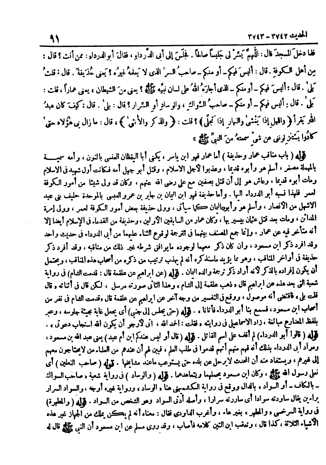 [3742] قَوْلُهُ عَنْ إِبْرَاهِيمَ عَنْ عَلْقَمَةَ قَالَ قَدِمْتُ الشَّامَ فِي رِوَايَةِ شُعْبَةَ الَّتِي بَعْدَ هَذِهِ عَنْ إِبْرَاهِيمَ قَالَ ذَهَبَ عَلْقَمَةُ إِلَى الشَّامِ وَهَذَا الثَّانِي صُورَتُهُ مُرْسَلٌ لَكِنْ قَالَ فِي أَثْنَائِهِ قَالَ قُلْتُ بَلَى فَاقْتَضَى أَنَّهُ مَوْصُولٌ وَوَقَعَ فِي التَّفْسِيرِ مِنْ وَجْهٍ آخَرَ عَنْ إِبْرَاهِيمَ عَنْ عَلْقَمَةَ قَالَ قدمت الشَّام فِي نفر من أَصْحَاب بن مَسْعُودٍ فَسَمِعَ بِنَا أَبُو الدَّرْدَاءِ فَأَتَانَا قَوْلُهُ حَتَّى يَجْلِسَ إِلَى جَنْبِي أَيْ يَجْعَلَ غَايَةَ مَجِيئِهِ جُلُوسَهُ وَعَبَّرَ بِلَفْظِ الْمُضَارِعِ مُبَالَغَةً زَادَ الْإِسْمَاعِيلِيُّ فِي رِوَايَتِهِ فَقُلْتُ الْحَمْدُ لِلَّهِ إِنِّي لَأَرْجُو أَنْ يَكُونَ اللَّهُ اسْتَجَابَ دَعْوَتِي قَوْلُهُ قَالُوا أَبُو الدَّرْدَاءِ لَمْ أَقِفْ عَلَى اسْمِ الْقَائِل قَوْله قَالَ أَو لَيْسَ عنْدكُمْ بن أُمِّ عَبْدٍ يَعْنِي عَبْدَ اللَّهِ بْنَ مَسْعُودٍ وَمُرَادُ أَبِي الدَّرْدَاءِ بِذَلِكَ أَنَّهُ فَهِمَ مِنْهُمْ أَنَّهُمْ قَدِمُوا فِي طَلَبِ الْعِلْمِ فَبَيَّنَ لَهُمْ أَنَّ عِنْدَهُمْ مِنَ الْعُلَمَاءِ مِنْ لَا يَحْتَاجُونَ مَعَهُمْ إِلَى غَيْرِهِمْ وَيُسْتَفَادُ مِنْهُ أَنَّ الْمُحَدِّثَ لَا يرحل عَن بَلَده حَتَّى يستوعب ماعند مَشَايِخِهَا قَوْلُهُ صَاحِبُ النَّعْلَيْنِ أَيْ نَعْلَيْ رَسُولِ اللَّهِ صَلَّى اللَّهُ عَلَيْهِ وَسَلَّمَ وَكَانَ بن مَسْعُودٍ يَحْمِلُهُمَا وَيَتَعَاهَدُهُمَا قَوْلُهُ وَالْوِسَادُ فِي رِوَايَةِ شُعْبَةَ صَاحِبُ السِّوَاكِ بِالْكَافِ أَوِ السَّوَادِ بِالدَّالِ وَوَقَعَ فِي رِوَايَةِ الْكُشْمِيهَنِيِّ هُنَا الْوِسَادُ وَرِوَايَةُ غَيْرِهِ أَوْجَهُ وَالسَّوَادُ السِّرَارُ بِرَاءَيْنِ يُقَالُ سَاوَدْتُهُ سَوَادًا أَيْ سَارَرْتُهُ سِرَارًا وَأَصْلُهُ أَدْنَى السَّوَادِ وَهُوَ الشَّخْصُ مِنَ السَّوَادِ قَوْلُهُ وَالْمِطْهَرَةُ فِي رِوَايَةِ السَّرَخْسِيِّ وَالْمِطْهَرُ بِغَيْرِ هَاءٍ وَأَغْرَبَ الدَّاوُدِيُّ فَقَالَ مَعْنَاهُ أَنَّهُ لَمْ يَكُنْ يَمْلِكُ مِنَ الْجِهَازِ غَيْرَ هَذِهِ الْأَشْيَاءِ الثَّلَاثَةِ كَذَا قَالَ وَتعقب بن التِّينِ كَلَامَهُ فَأَصَابَ وَقَدْ رَوَى مُسْلِمٌ عَنِ بن مَسْعُودٍ أَنَّ النَّبِيَّ صَلَّى اللَّهُ عَلَيْهِ وَسَلَّمَ قَالَ لَهُ