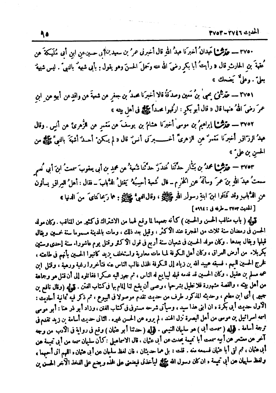 كَأَنَّهُ جَمَعَهُمَا لِمَا وَقَعَ لَهُمَا مِنَ الِاشْتِرَاكِ فِي كَثِيرٍ مِنَ الْمَنَاقِبِ وَكَانَ مَوْلِدُ الْحَسَنِ فِي رَمَضَانَ سَنَةَ ثَلَاثٍ مِنَ الْهِجْرَةِ عِنْدَ الْأَكْثَرِ وَقِيلَ بَعْدَ ذَلِكَ وَمَاتَ بِالْمَدِينَةِ مَسْمُومًا سَنَةَ خَمْسِينَ وَيُقَالُ قَبْلَهَا وَيُقَالُ بَعْدَهَا وَكَانَ مَوْلِدُ الْحُسَيْنِ فِي شَعْبَانَ سَنَةَ أَرْبَعٍ فِي قَوْلِ الْأَكْثَرِ وَقُتِلَ يَوْمَ عَاشُورَاءَ سَنَةَ إِحْدَى وَسِتِّينَ بِكَرْبَلَاءَ مِنْ أَرْضِ الْعِرَاقِ وَكَانَ أَهْلُ الْكُوفَةِ لَمَّا مَاتَ مُعَاوِيَةُ وَاسْتَخْلَفَ يَزِيدَ كَاتَبُوا الْحُسَيْنَ بِأَنَّهُمْ فِي طَاعَتِهِ فَخَرَجَ الْحُسَيْنُ إِلَيْهِمْ فَسَبَقَهُ عُبَيْدُ اللَّهِ بْنُ زِيَادٍ إِلَى الْكُوفَةِ فَخَذَّلَ غَالِبَ النَّاس عَنهُ فتأخروا رَغْبَة وَرَهْبَة وَقتل بن عَمِّهِ مُسْلِمُ بْنُ عَقِيلٍ وَكَانَ الْحُسَيْنُ قَدْ قَدَّمَهُ قَبْلَهُ لِيُبَايِعَ لَهُ النَّاسَ ثُمَّ جَهَّزَ إِلَيْهِ عَسْكَرًا فَقَاتَلُوهُ إِلَى أَنْ قُتِلَ هُوَ وَجَمَاعَةٌ مِنْ أَهْلِ بَيْتِهِ وَالْقِصَّةُ مَشْهُورَةٌ فَلَا نُطِيلُ بِشَرْحِهَا وَعَسَى أَنْ يَقَعَ لَنَا إِلْمَامٌ بِهَا فِي كِتَابِ الْفِتَنِ قَوْلُهُ وَقَالَ نَافِعُ بن جُبَير أَي بن مُطْعِمٍ وَحَدِيثُهُ الْمَذْكُورُ طَرَفٌ مِنْ حَدِيثٍ تَقَدَّمَ مَوْصُولًا فِي الْبُيُوعِ ثُمَّ ذَكَرَ فِيهِ ثَمَانِيَةَ أَحَادِيثَ الْأَوَّلُ حَدِيثُ أَبِي بَكْرَةَ إِنَّ ابْنِي هَذَا سَيِّدٌ وَسَيَأْتِي شَرْحُهُ مُسْتَوْفًى فِي كِتَابِ الْفِتَنِ وَزَادَ أَبُو ذَرٍّ هُنَا أَبُو مُوسَى اسْمُهُ إِسْرَائِيلُ بْنُ مُوسَى مِنْ أَهْلِ الْبَصْرَةِ نَزَلَ الْهِنْدَ لَمْ يَرْوِهِ عَنِ الْحَسَنِ غَيْرُهُ الثَّانِي حَدِيثُ أُسَامَةَ بْنِ زَيْدٍ تَقَدَّمَ فِي تَرْجَمَةِ أُسَامَةَ