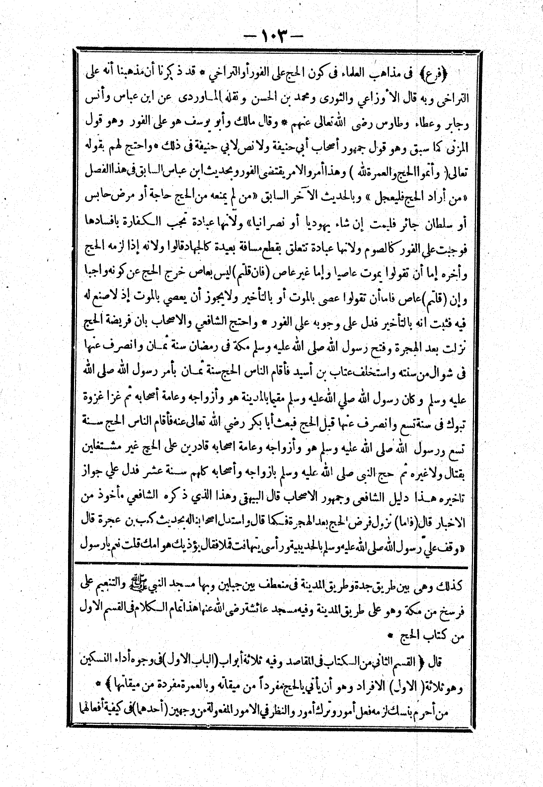 كذلك وهى بين طريق جدة وطريق المدينة في منعطف بين جبلين وبها مسجد النبي صلى الله عليه وسلم التنعيم على فرسخ من مكة وهو على طريق المدينة وفيه مسجد عائشة رضى الله عنها هذا تمام الكلام في القسم الاول من كتاب الحج * قال (القسم الثاني من الكتاب في المقاصد وفيه ثلاثة أبواب (الباب الاول) في وجوه أداء النسكين
