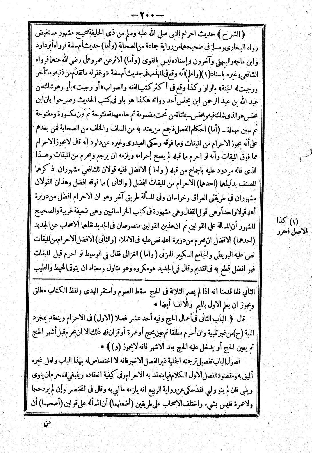 الثاني فلما قدمنا انه إذا لم يصم الثلاثة في الحج سقط الصوم واستقر الهدى ولفظ الكتاب مطلق ويجوز ان يعلم الاول بالميم والالف أيضا * قال (الباب الثاني في أعمال الحج وفيه أحد عشر فصلا (الاول) في الاحرام وينعقد بمجرد النية (ح) من غير تلبية وان أحرم مطلقا ثم عين بحج أو عمرة أو قران فله ذلك الا ان يحرم قبل أشهر الحج ثم يعين الحج أو يدخل عليه الحج بعد الاشهر فانه لا يجوز (و)) * فصول الباب تفصيل ترجمته الجميلة غير الفصل الاخير فانه لا اختصاص له بهذا الباب ولعل غيره أليق به ومقصود الفصل الاول الكلام فيما ينعقد به الاحرام وفى كيفية انعقاده وينبغى للمحرم ان ينوى ويلبى فان لم ينو ولبي فقد حكى عن رواية الربيع انه يلزمه ما لبي به وقال في المختصر وإن لم يرد حجا ولا عمرة فليس بشئ واختلف الاصحاب على طريقين (أضعفهما) أن المسألة على قولين (أصحهما) أن
