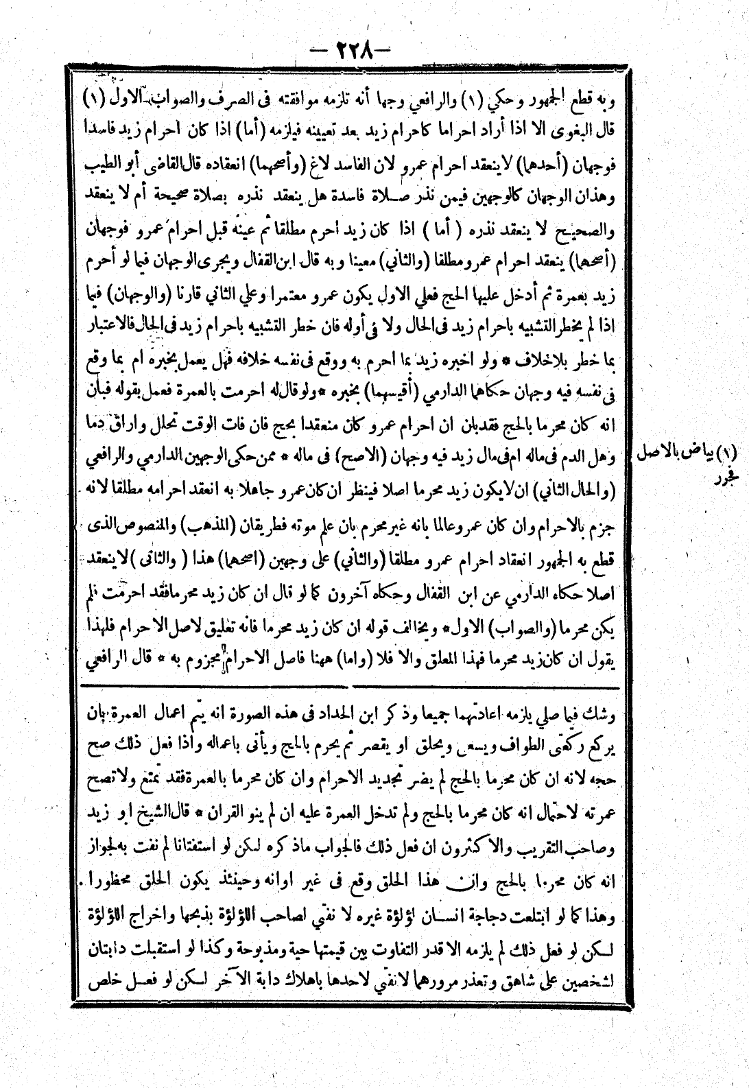 وشك فيما صلي يلزمه اعادتهما جميعا وذكر ابن الحداد في هذه الصورة انه يتم اعمال العمرة بان يركع ركعتي الطواف ويسعى ويحلق أو يقصر ثم يحرم بالحج ويأتى باعماله وإذا فعل ذلك صح حجه لانه ان كان محرما بالحج لم يضر تجديد الاحرام وان كان محرما بالعمرة فقد تمتع ولا تصح عمرته لاحتمال انه كان محرما بالحج ولم تدخل العمرة عليه ان لم ينو القران * قال الشيخ أبو زيد وصاحب التقريب والاكثرون ان فعل ذلك فالجواب ما ذكره لكن لو استفتانا لم نفت به لجواز انه كان محرما بالحج وان هذا الحلق وقع في غير اوانه وحينئذ يكون الحلق محظورا وهذا كما لو ابتلعت دجاجة انسان لؤلؤة غيره لا نفتي لصاحب اللؤلؤة بذبحها واخراج اللؤلؤة لكن لو فعل ذلك لم يلزمه الا قدر التفاوت بين قيمتها حية ومذبوحة وكذا لو استقبلت دابتان لشخصين على شاهق وتعذر مرورهما لا نفتي لاحدها باهلاك دابة الآخر لكن لو فعل خلص