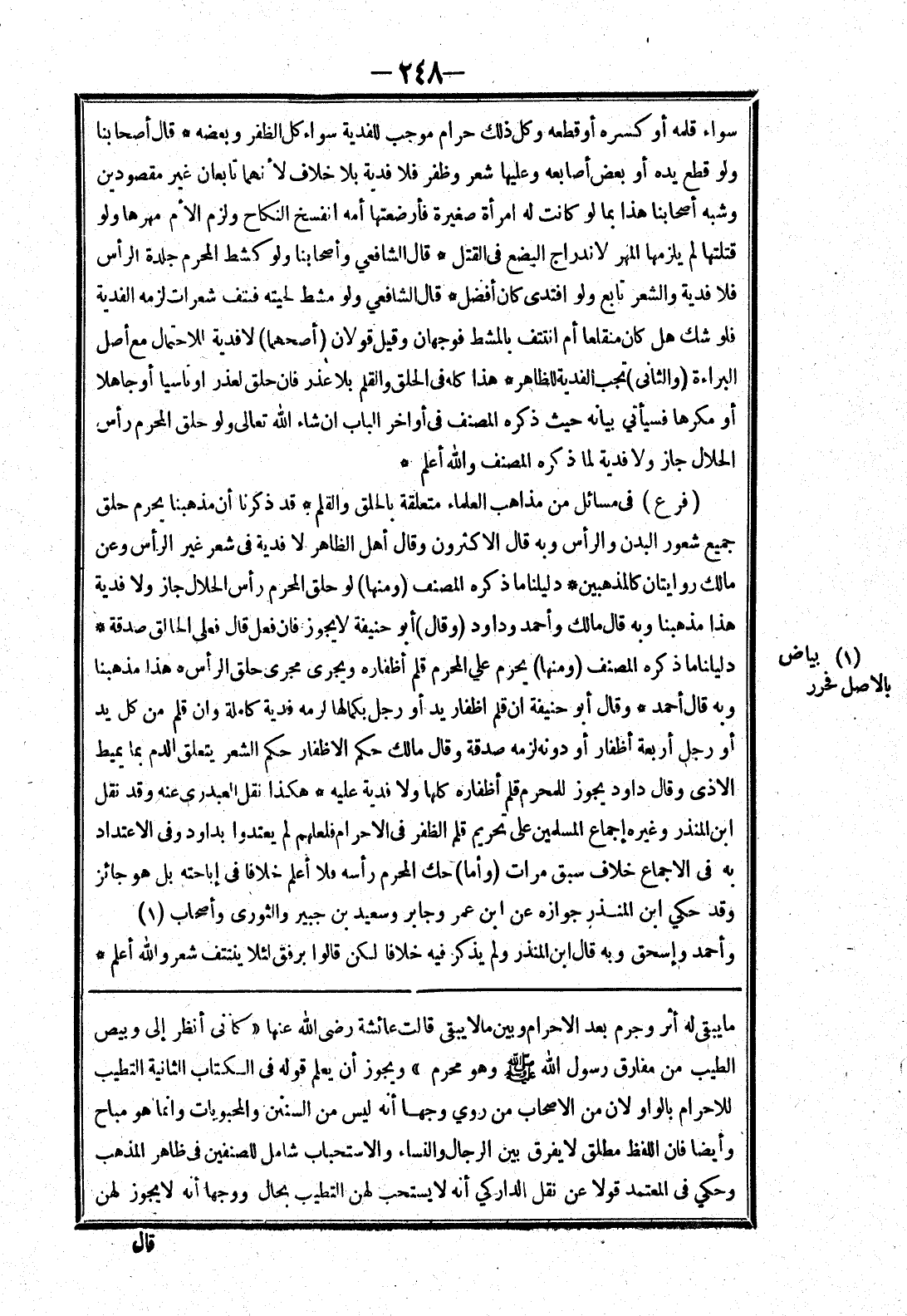 ما يبقى له أثر وجرم بعد الاحرام وبين ما لا يبقى قالت عائشة رضى الله عنها " كأنى أنظر إلى وبيص الطيب من مفارق رسول الله صلى الله عليه وسلم وهو محرم " ويجوز أن يعلم قوله في الكتاب الثانية التطيب للاحرام بالواو لان من الاصحاب من روي وجها أنه ليس من السنن والمحبوبات وانما هو مباح وأيضا فان اللفظ مطلق لا يفرق بين الرجال والنساء والاستحباب شامل للصنفين في ظاهر المذهب وحكي في المعتمد قولان عن نقل الداركي أنه لا يستحب لهن التطيب بحال ووجها أنه لا يجوز لهن