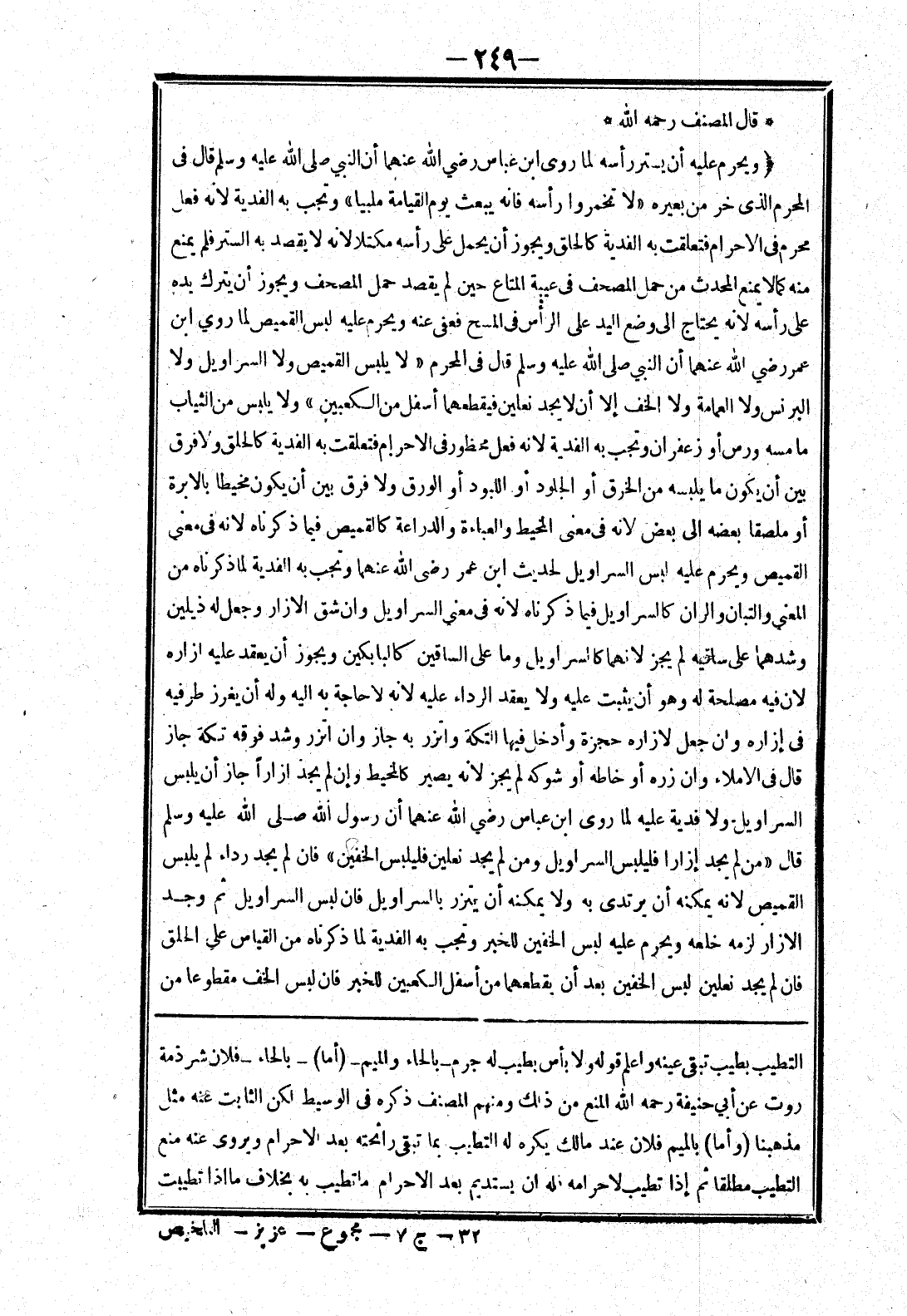 التطيب بطيب تبقى عينه واعلم قوله ولا بأس بطيب له جرم - بالحاء الميم - (أما) - بالحاء - فلان شرذمة روت عن أبي حنيفة رحمه الله المنع من ذلك ومنهم المصنف ذكره في الوسيط لكن الثابت عنه مثل مذهبنا (وأما) بالميم فلان عند مالك يكره له التطيب بما تبقى رائحته بعد الاحرام ويروى عنه منع التطيب مطلقا ثم إذا تطيب لاحرامه فله ان يستديم بعد الاحرام ما تطيب به بخلاف ما إذا تطيبت