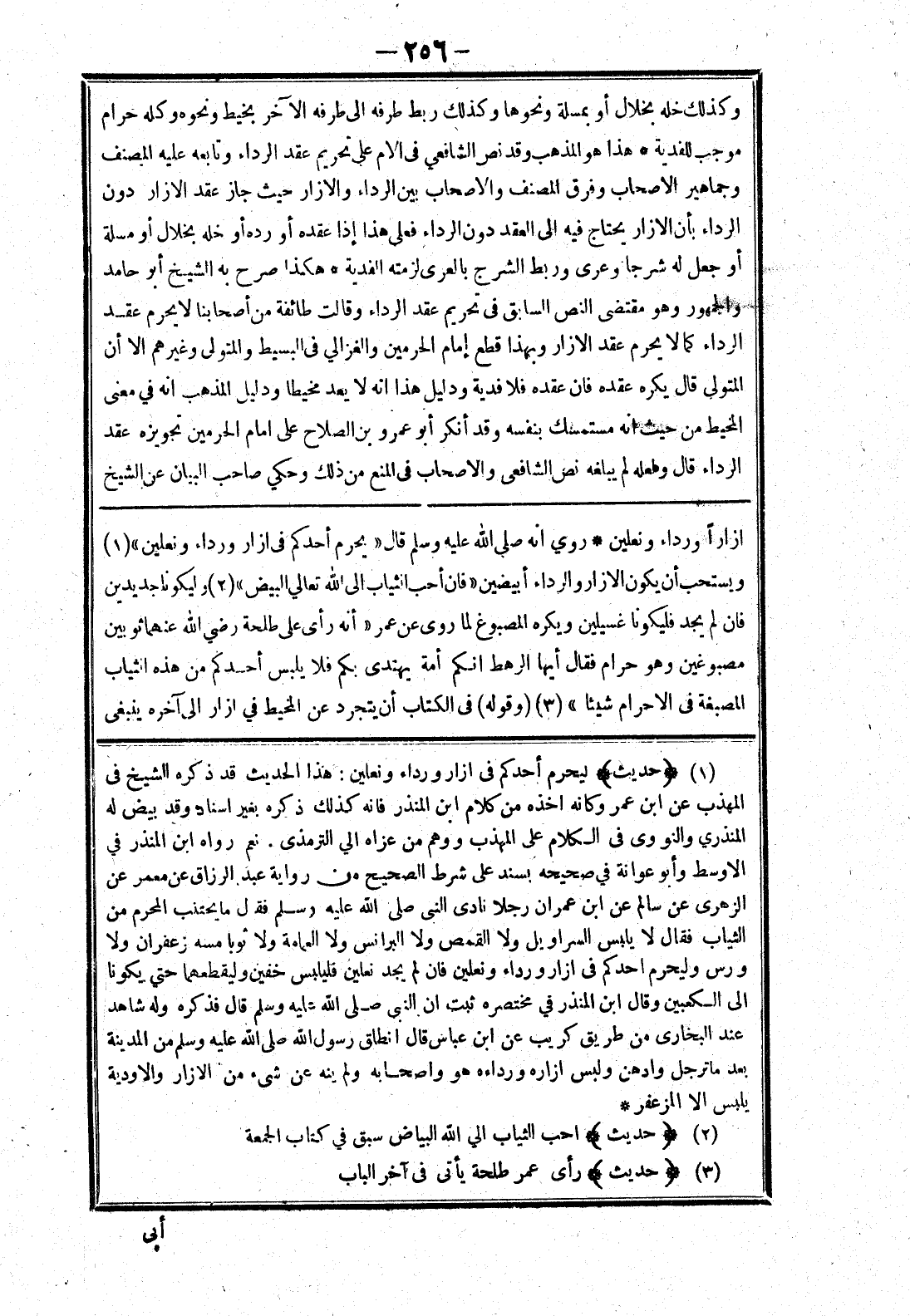 ازارا ورداء ونعلين * روي انه صلي الله عليه وسلم قال " يحرم أحدكم في ازار ورداء ونعلين " ويستحب أن يكون الازار والرداء أبيضين " فان أحب الثياب إلى الله تعالي البيض " وليكونا جديدين فان لم يجد فليكونا غسيلين ويكره المصبوغ لما روى عن عمر " أنه رأى على طلحة رضي الله عنهما ثوبين مصبوغين وهو حرام فقال أيها الرهط انكم أمة يهتدى بكم فلا يلبس أحدكم من هذه الثياب المصبغة في الاحرام شيئا " (وقوله) في الكتاب أن يتجرد عن المخيط في ازار إلى آخره ينبغى