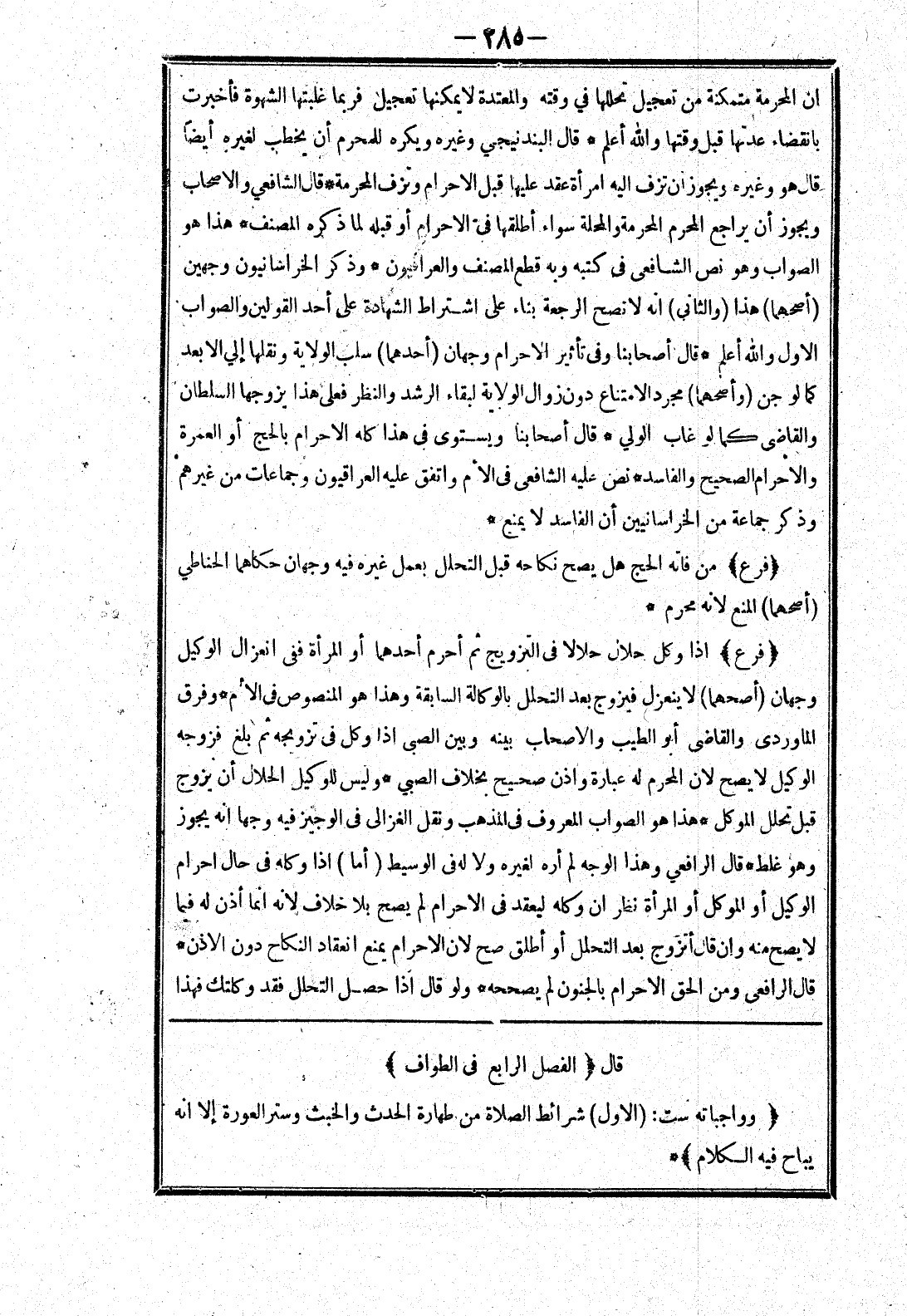قال (الفصل الرابع في الطواف) (وواجباته ست: (الاول) شرائط الصلاة من طهارة الحدث والخبث وستر العورة إلا انه يباح فيه الكلام) *