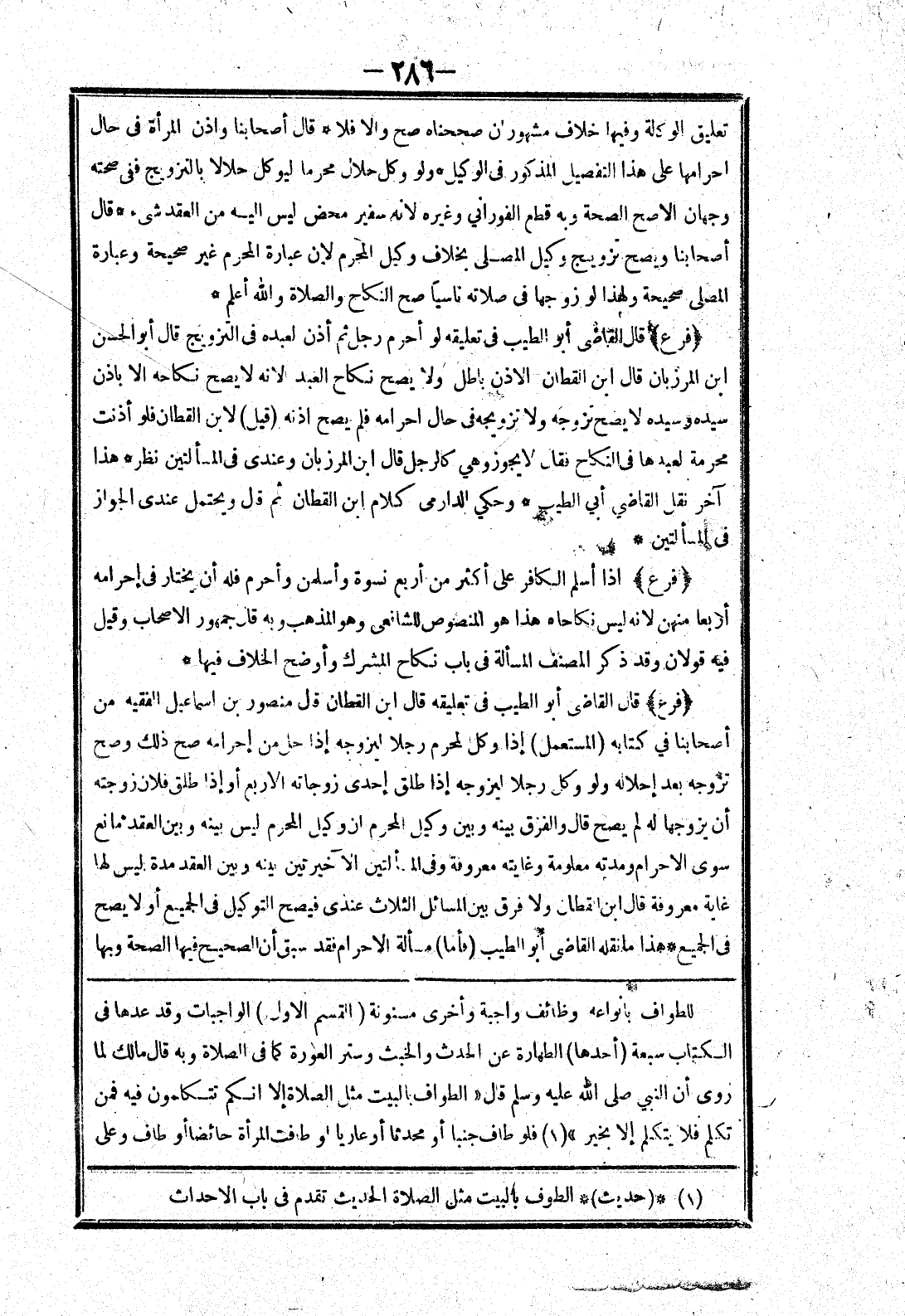 للطواف بانواعه وظائف واجبة وأخرى مسنونة (القسم الاول) الواجبات وقد عدها في الكتاب سبعة (أحدها) الطهارة عن الحدث والخبث وستر العورة كما في الصلاة وبه قال مالك لما روى أن النبي صلى الله عليه وسلم قال " الطواف بالبيت مثل الصلاة إلا انكم تتكلمون فيه فمن تكلم فلا يتكلم إلا بخير " فلو طاف جنبا أو محدثا أو عاريا أو طافت المرأة حائضا أو طاف وعلى