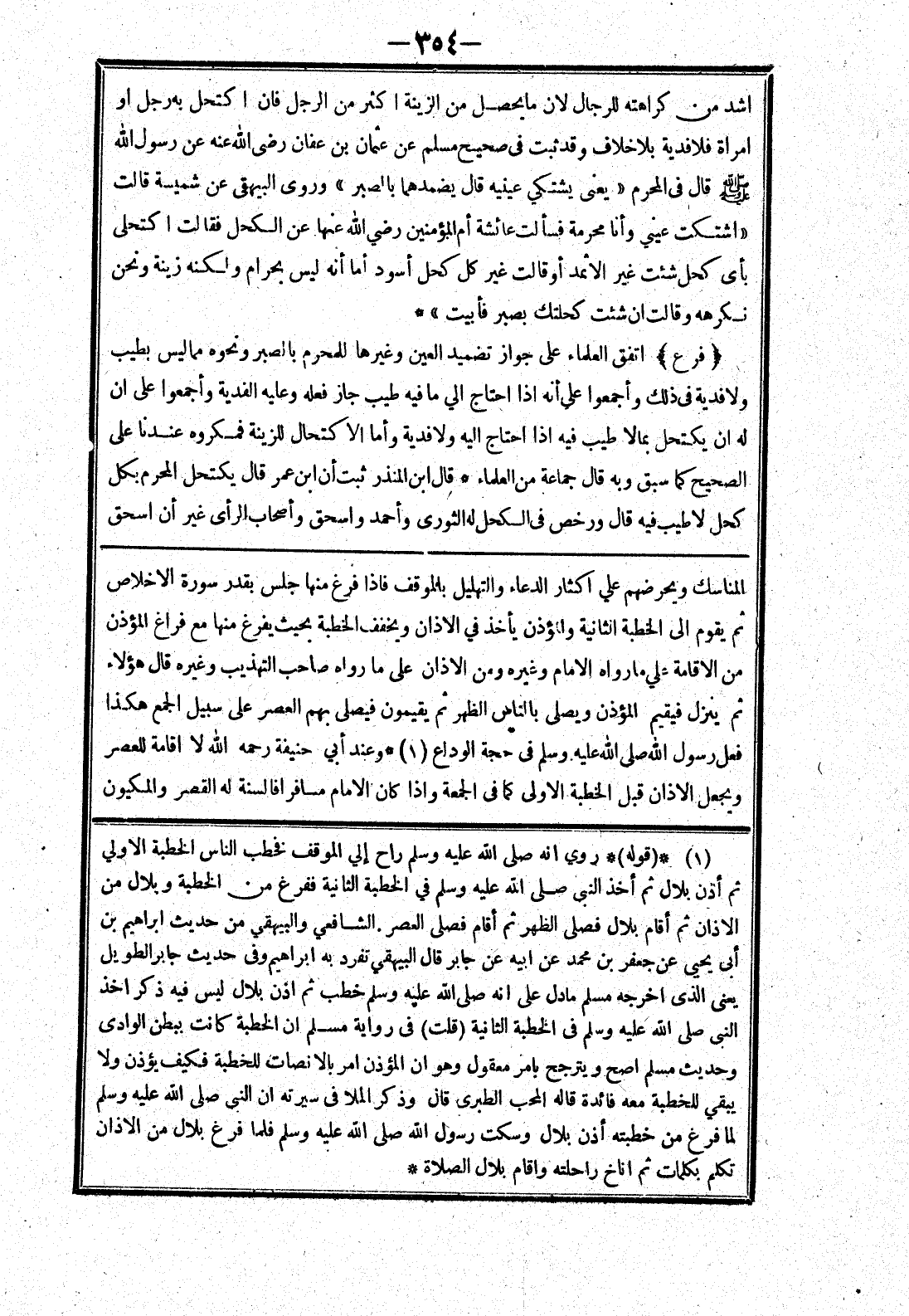المناسك ويحرضهم علي اكثار الدعاء والتهليل بالموقف فإذا فرغ منها جلس بقدر سورة الاخلاص ثم يقوم إلى الخطبة الثانية والمؤذن يأخذ في الاذان ويخفف الخطبة بحيث يفرغ منها مع فراغ المؤذن من الاقامة علي ما رواه الامام وغيره ومن الاذان على ما رواه صاحب التهذيب وغيره قال هؤلاء ثم ينزل فيقيم المؤذن ويصلى بالناس الظهر ثم يقيمون فيصلى بهم العصر على سبيل الجمع هكذا فعل رسول الله صلى الله عليه وسلم في حجة الوداع * وعند أبي حنيفة رحمه الله لا اقامة للعصر ويجعل الاذان قبل الخطبة الاولى كما في الجمعة وإذا كان الامام مسافرا فالسنة له القصر والمكيون