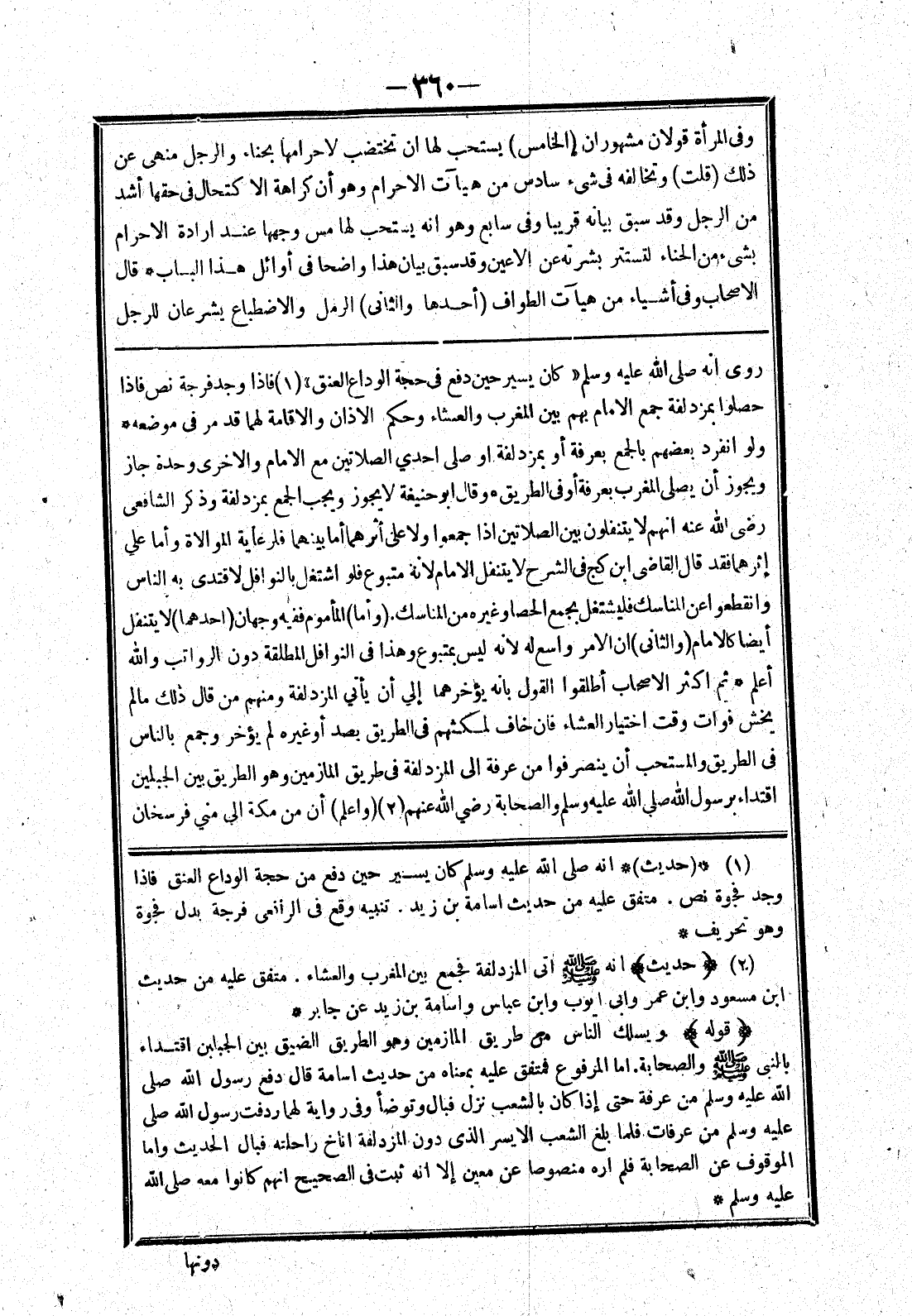 (وأما) المأموم ففيه وجهان (احدهما) لا يتنفل أيضا كالامام (والثانى) ان الامر واسع له لانه ليس بمتبوع وهذا في النوافل المطلقة دون الرواتب والله أعلم * ثم اكثر الاصحاب أطلقوا القول بانه يؤخرها إلي أن يأتي المزدلفة ومنهم من قال ذلك ما لم يخش فوات وقت اختيار العشاء فان خاف لمكثهم في الطريق بصد أو غيره لم يؤخر وجمع بالناس في الطريق والمستحب أن ينصرفوا من عرفة إلى المزدلفة في طريق المازمين وهو الطريق بين الجبلين اقتداء برسول الله صلى الله عليه وسلم والصحابة رضي الله عنهم (واعلم) أن من مكة إلى مني فرسخان