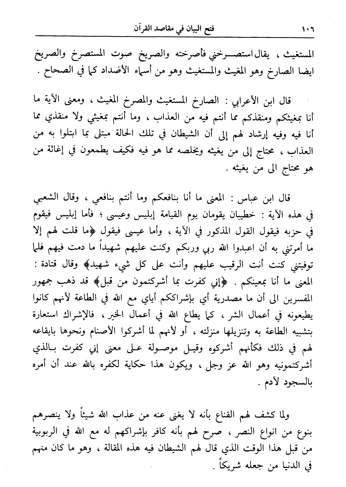 قال ابن الأعرابي: الصارخ المستغيث والمصرخ المغيث، ومعنى الآية ما أنا بمغيثكم ومنقذكم مما أنتم فيه من العذاب، وما أنتم بمغيثي ولا منقذي مما أنا فيه وفيه إرشاد لهم إلى أن الشيطان في تلك الحالة مبتلى بما ابتلوا به من العذاب، محتاج إلى من يغيثه ويخلصه مما هو فيه فكيف يطمعون في إغاثة من هو محتاج إلى من يغيثه.
