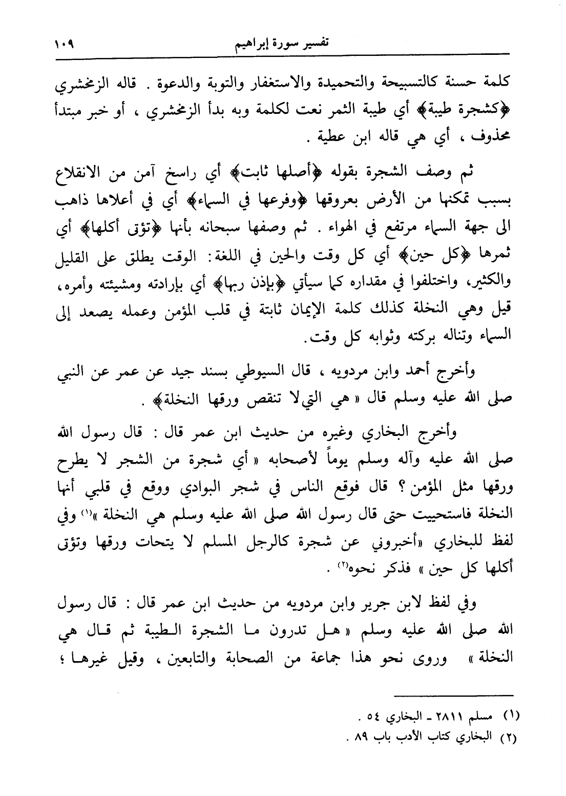 وفي لفظ لابن جرير وابن مردويه من حديث ابن عمر قال: قال رسول الله صلى الله عليه وسلم " هل تدرون ما الشجرة الطيبة ثم قال هي النخلة " وروى نحو هذا جماعة من الصحابة والتابعين، وقيل غيرها؛