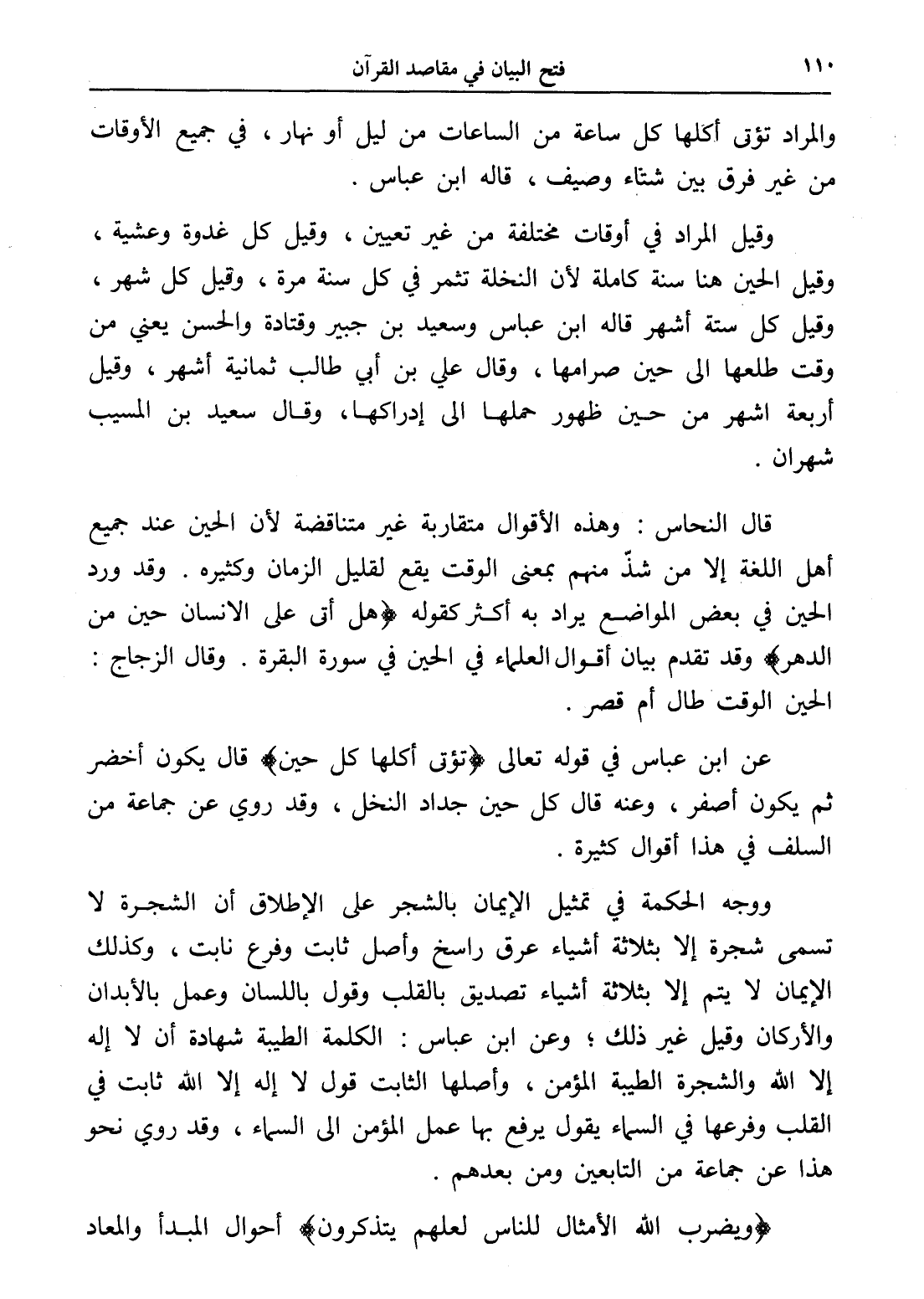 عن ابن عباس في قوله تعالى (تؤتي أكلها كل حين) قال يكون أخضر ثم يكون أصفر، وعنه قال كل حين جداد النخل، وقد روي عن جماعة من السلف في هذا أقوال كثيرة.