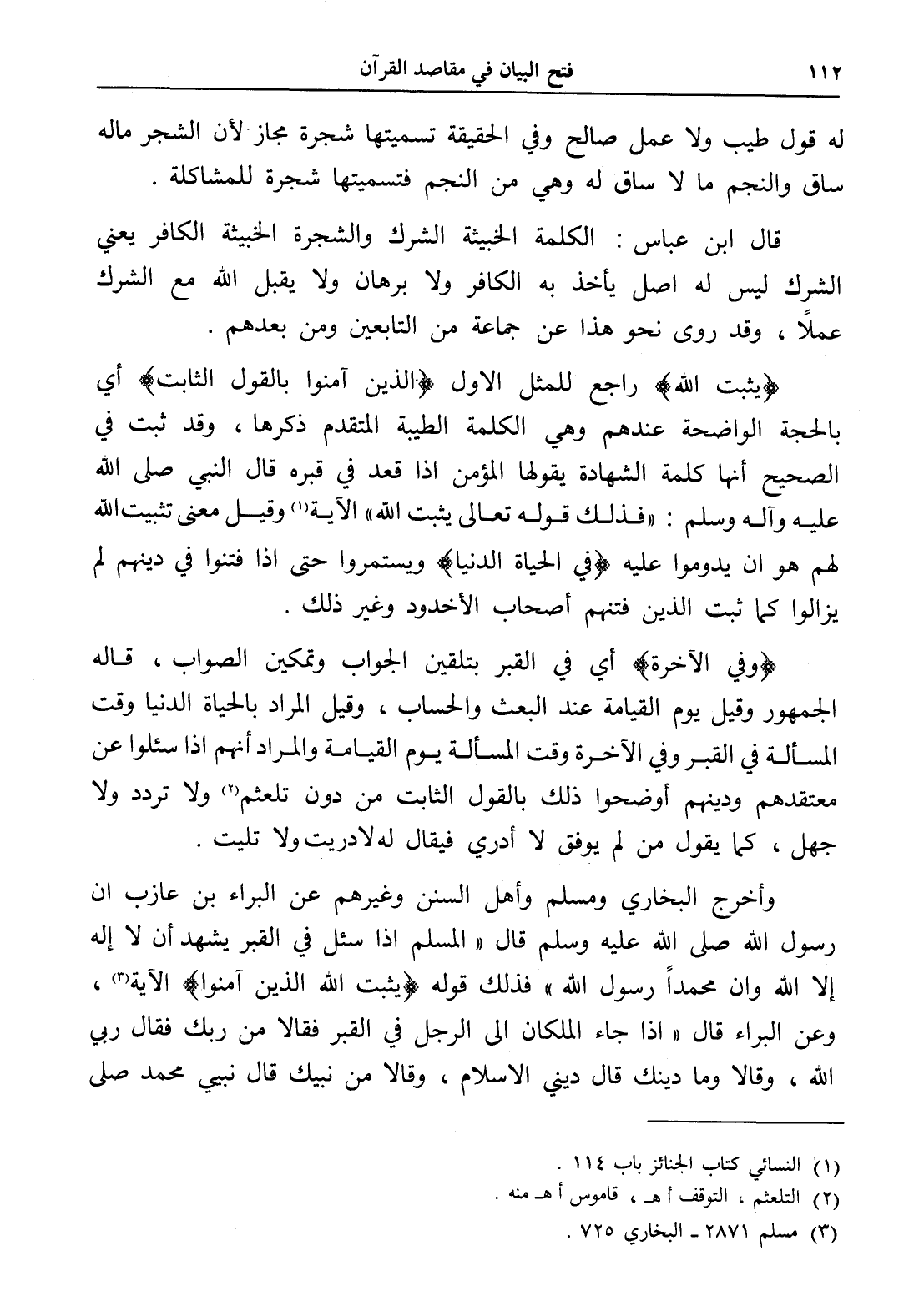 وأخرج البخاري ومسلم وأهل السنن وغيرهم عن البراء بن عازب أن رسول الله صلى الله عليه وسلم قال " المسلم إذا سئل في القبر يشهد أن لا إله إلا الله وأن محمداً رسول الله " فذلك قوله (يثبت الله الذين آمنوا) الآية (¬3)، وعن البراء قال " إذا جاء الملكان إلى الرجل في القبر فقالا من ربك فقال ربي الله، وقالا وما دينك قال ديني الإسلام، وقالا من نبيك قال نبي محمد صلى