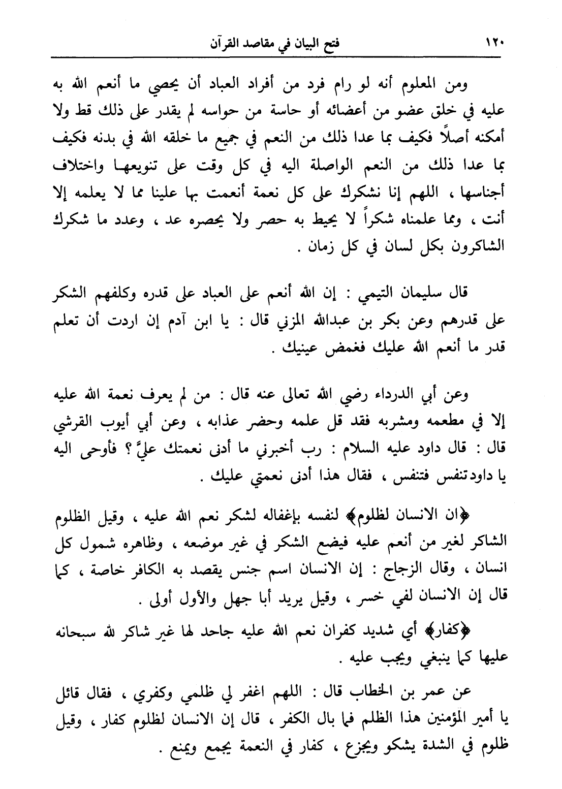 ومن المعلوم أنه لو رام فرد من أفراد العباد أن يحصي ما أنعم الله به عليه في خلق عضو من أعضائه أو حاسة من حواسه لم يقدر على ذلك قط ولا أمكنه أصلاً فكيف بما عدا ذلك من النعم في جميع ما خلقه الله في بدنه فكيف بما عدا ذلك من النعم الواصلة إليه في كل وقت على تنويعها واختلاف أجناسها، اللهم إنا نشكرك على كل نعمة أنعمت بها علينا مما لا يعلمه إلا أنت، ومما علمناه شكراً لا يحيط به حصر ولا يحصره عد، وعدد ما شكرك الشاكرون بكل لسان في كل زمان.