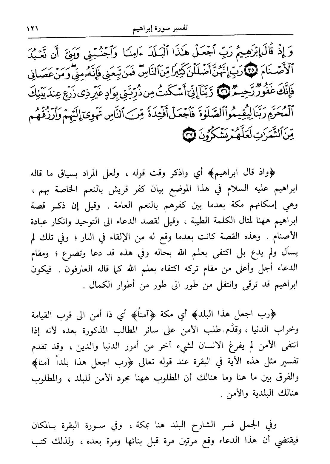 وَإِذْ قَالَ إِبْرَاهِيمُ رَبِّ اجْعَلْ هَذَا الْبَلَدَ آمِنًا وَاجْنُبْنِي وَبَنِيَّ أَنْ نَعْبُدَ الْأَصْنَامَ (35) رَبِّ إِنَّهُنَّ أَضْلَلْنَ كَثِيرًا مِنَ النَّاسِ فَمَنْ تَبِعَنِي فَإِنَّهُ مِنِّي وَمَنْ عَصَانِي فَإِنَّكَ غَفُورٌ رَحِيمٌ (36) رَبَّنَا إِنِّي أَسْكَنْتُ مِنْ ذُرِّيَّتِي بِوَادٍ غَيْرِ ذِي زَرْعٍ عِنْدَ بَيْتِكَ الْمُحَرَّمِ رَبَّنَا لِيُقِيمُوا الصَّلَاةَ فَاجْعَلْ أَفْئِدَةً مِنَ النَّاسِ تَهْوِي إِلَيْهِمْ وَارْزُقْهُمْ مِنَ الثَّمَرَاتِ لَعَلَّهُمْ يَشْكُرُونَ (37)