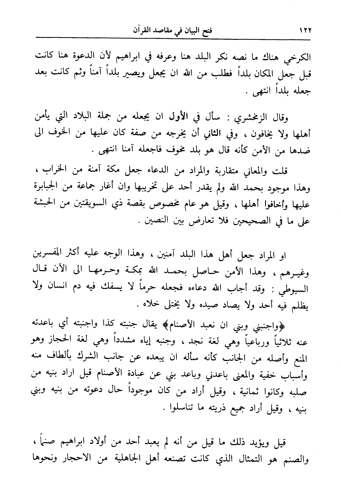 (واجنبني وبني أن نعبد الأصنام) يقال جنبته كذا وأجنبته أي باعدته عنه ثلاثياً ورباعياً وهي لغة نجد، وجنبه إياه مشدداً وهي لغة الحجاز وهو المنع وأصله من الجانب كأنه سأله أن يبعده عن جانب الشرك بألطاف منه وأسباب خفية والمعنى باعدني وباعد بني عن عبادة الأصنام قيل أراد بنيه من صلبه وكانوا ثمانية، وقيل أراد من كان موجوداً حال دعوته من بنيه وبني بنيه، وقيل أراد جميع ذريته ما تناسلوا.