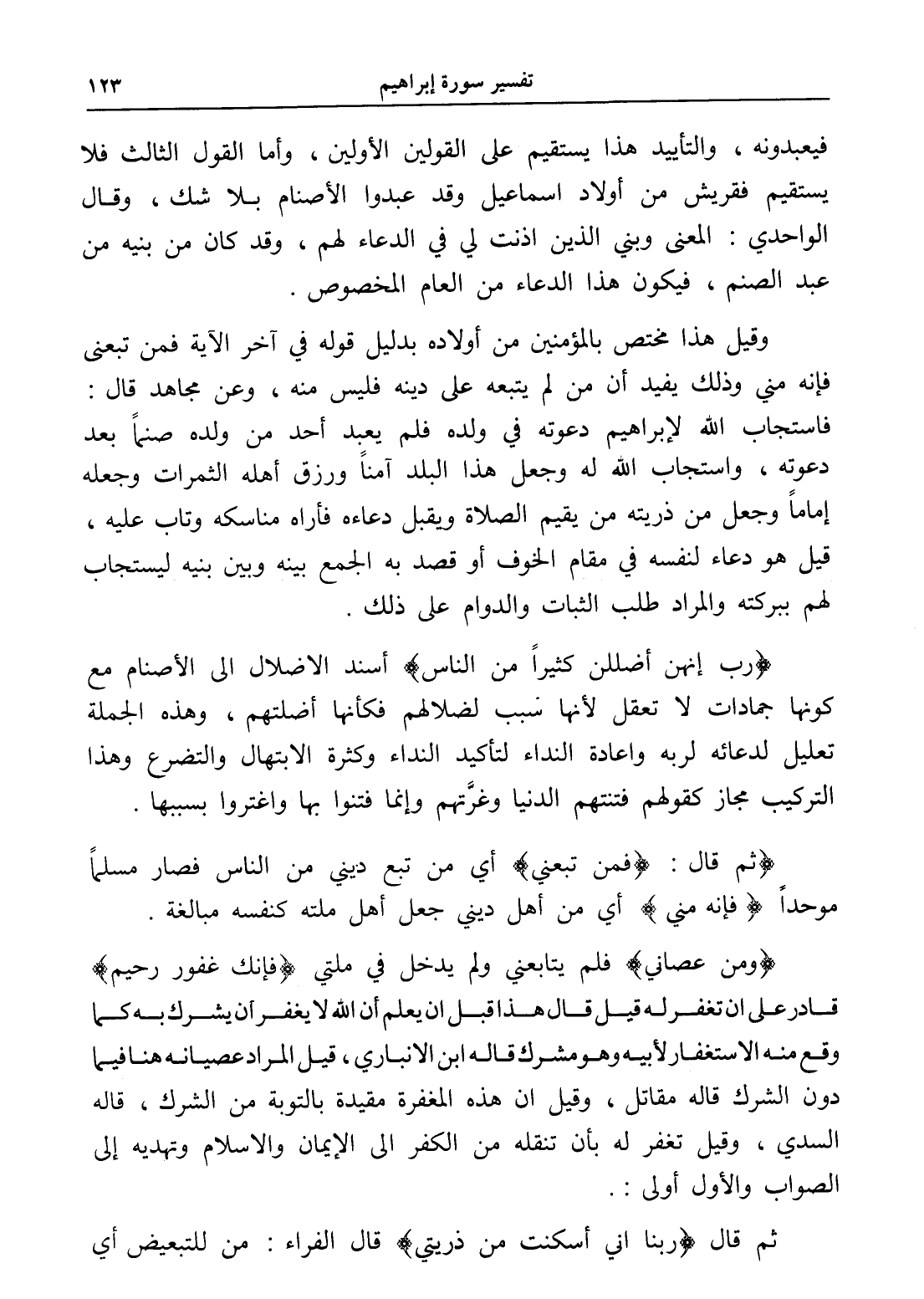 وقيل هذا مختص بالمؤمنين من أولاده بدليل قوله في آخر الآية فمن تبعني فإنه مني وذلك يفيد أن من لم يتبعه على دينه فليس منه، وعن مجاهد قال: فاستجاب الله لإبراهيم دعوته في ولده فلم يعبد أحد من ولده صنماً بعد دعوته، واستجاب الله له وجعل هذا البلد آمناً ورزق أهله الثمرات وجعله إماماً وجعل من ذريته من يقيم الصلاة ويقبل دعاءه فأراه مناسكه وتاب عليه، قيل هو دعاء لنفسه في مقام الخوف أو قصد به الجمع بينه وبين بنيه ليستجاب لهم ببركته والمراد طلب الثبات والدوام على ذلك.