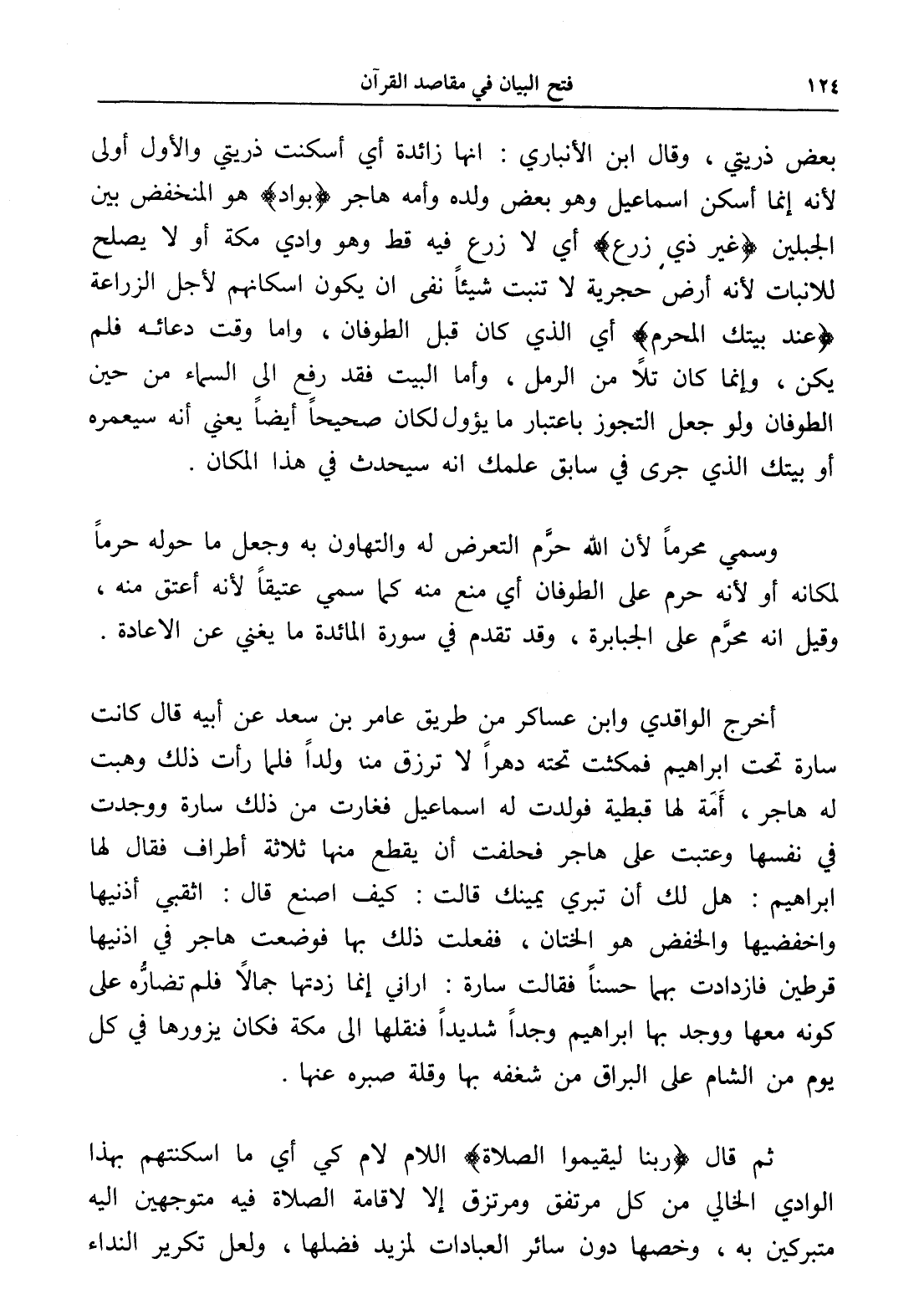 بعض ذريتي، وقال ابن الأنباري: أنها زائدة أي أسكنت ذريتي والأول أولى لأنه إنما أسكن إسماعيل وهو بعض ولده وأمه هاجر (بواد) هو المنخفض بين الجبلين (غير ذي زرع) أي لا زرع فيه قط وهو وادي مكة أو لا يصلح للإنبات لأنه أرض حجرية لا تنبت شيئاً نفى أن يكون إسكانهم لأجل الزراعة (عند بيتك المحرم) أي الذي كان قبل الطوفان، وأما وقت دعائه فلم يكن، وإنما كان تلاًّ من الرمل، وأما البيت فقد رفع إلى السماء من حين الطوفان ولو جعل التجوز باعتبار ما يؤول لكان صحيحاً أيضاً يعني أنه سيعمره أو بيتك الذي جرى في سابق علمك أنه سيحدث في هذا المكان.