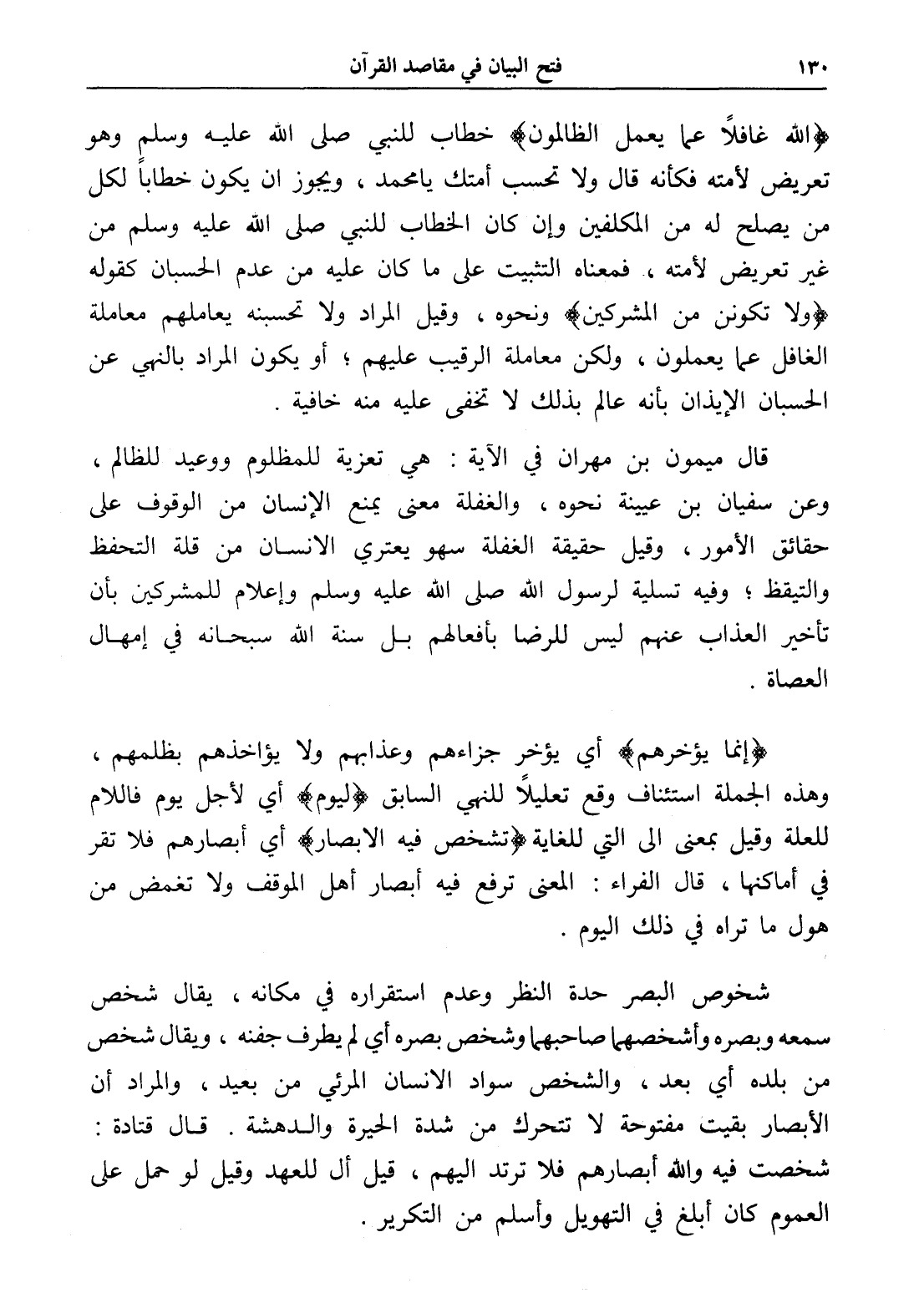 (إنما يؤخرهم) أي يؤخر جزاءهم وعذابهم ولا يؤاخذهم بظلمهم، وهذه الجملة استئناف وقع تعليلاً للنهي السابق (ليوم) أي لأجل يوم فاللام للعلة وقيل بمعنى إلى التي للغاية (تشخص فيه الأبصار) أي أبصارهم فلا تقر في أماكنها، قال الفراء: المعنى ترفع فيه أبصار أهل الموقف ولا تغمض من هول ما تراه في ذلك اليوم.