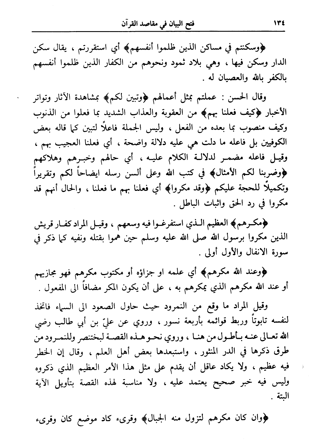 (وسكنتم في مساكن الذين ظلموا أنفسهم) أي استقررتم، يقال سكن الدار وسكن فيها، وهي بلاد ثمود ونحوهم من الكفار الذين ظلموا أنفسهم بالكفر بالله والعصيان له.