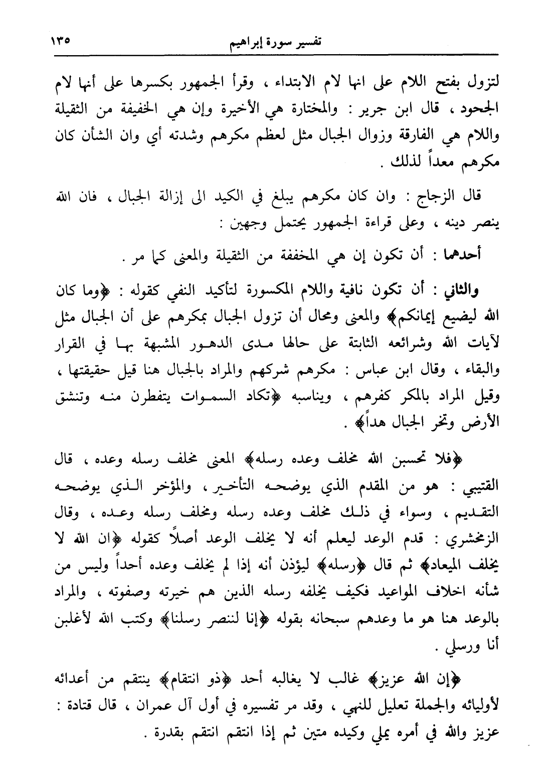 والثاني: أن تكون نافية واللام المكسورة لتأكيد النفي كقوله: (وما كان الله ليضيع إيمانكم) والمعنى ومحال أن تزول الجبال بمكرهم على أن الجبال مثل لآيات الله وشرائعه الثابتة على حالها مدى الدهور المشبهة بها في القرار والبقاء، وقال ابن عباس: مكرهم شركهم والمراد بالجبال هنا قيل حقيقتها، وقيل المراد بالمكر كفرهم، ويناسبه (تكاد السماوات يتفطرن منه وتنشق الأرض وتخر الجبال هداً).