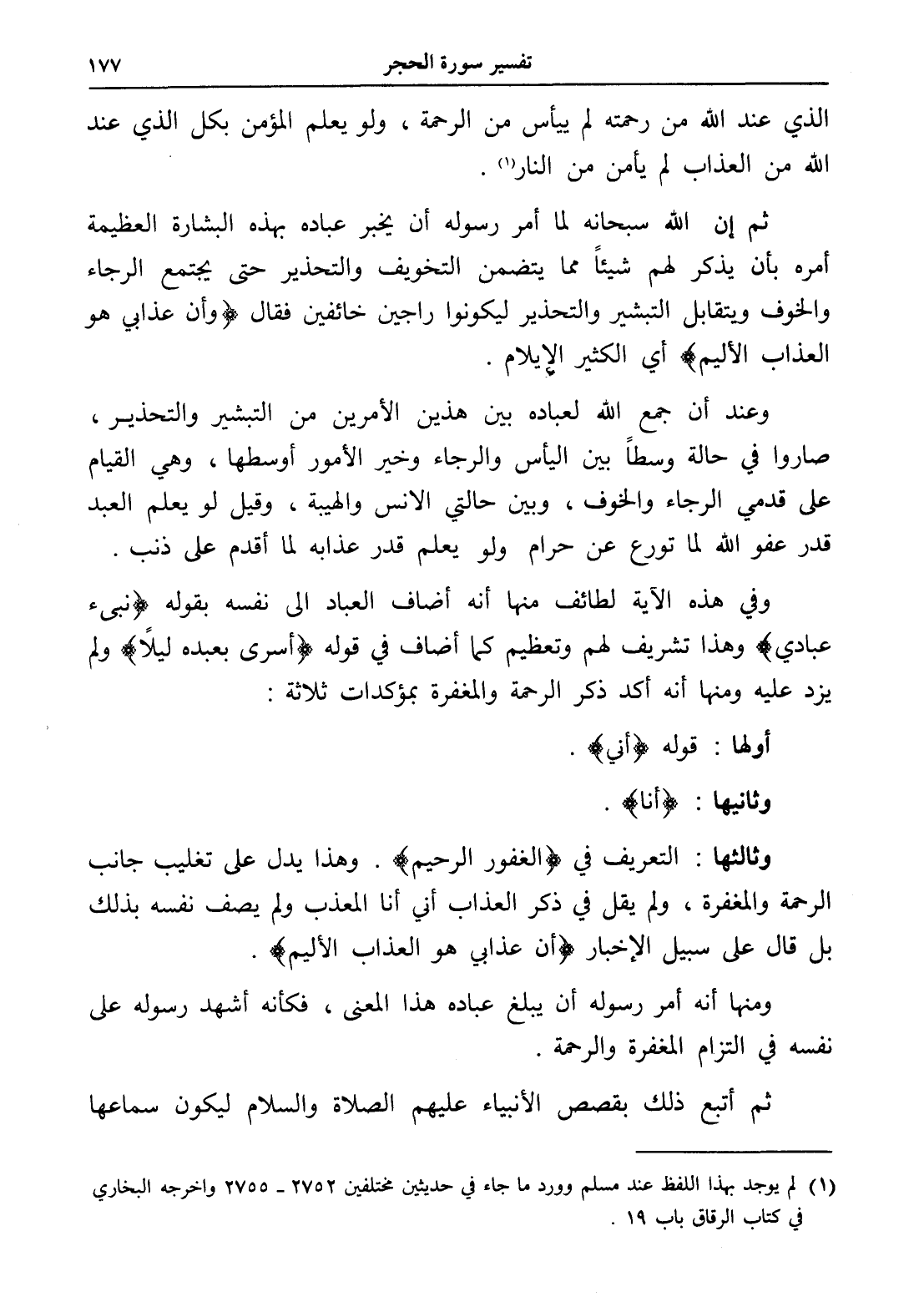 وفي هذه الآية لطائف منها أنه أضاف العباد إلى نفسه بقوله (نبئ عبادي) وهذا تشريف لهم وتعظيم كما أضاف في قوله (أسرى بعبده ليلاً) ولم يزد عليه ومنها أنه أكد ذكر الرحمة والمغفرة بمؤكدات ثلاثة: