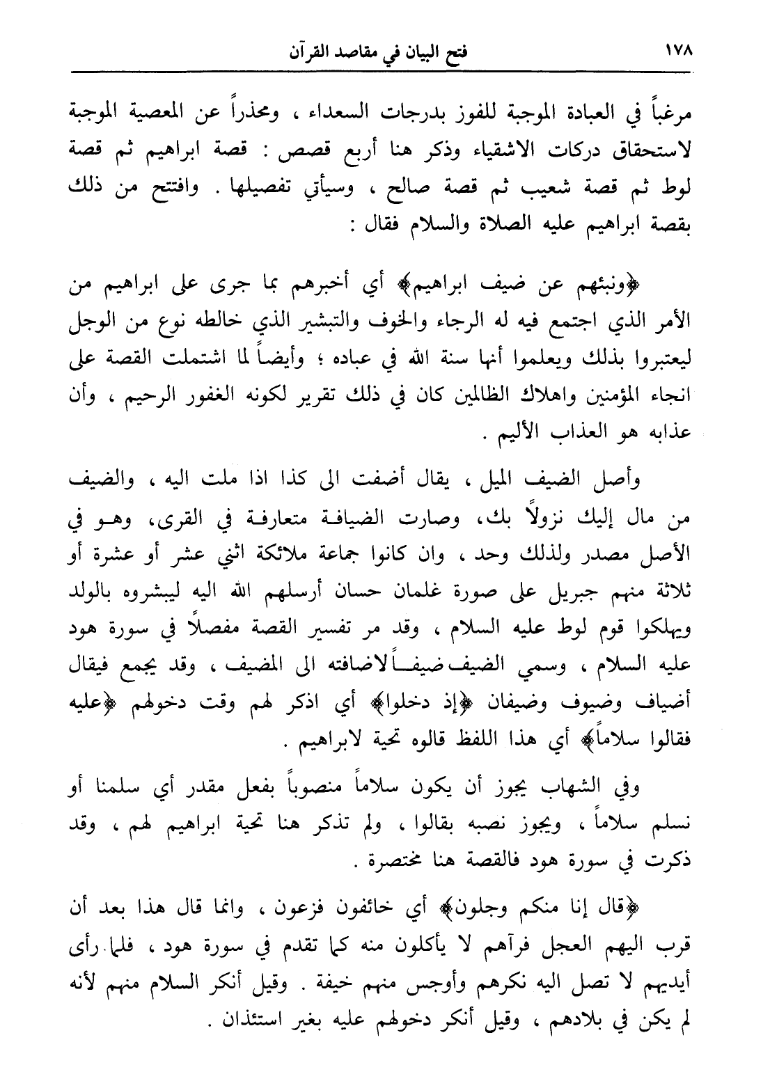 مرغباً في العبادة الموجبة للفوز بدرجات السعداء، ومحذراً عن المعصية الموجبة لاستحقاق دركات الأشقياء وذكر هنا أربع قصص: قصة إبراهيم ثم قصة لوط ثم قصة شعيب ثم قصة صالح، وسيأتي تفصيلها. وافتتح من ذلك بقصة إبراهيم عليه الصلاة والسلام فقال: