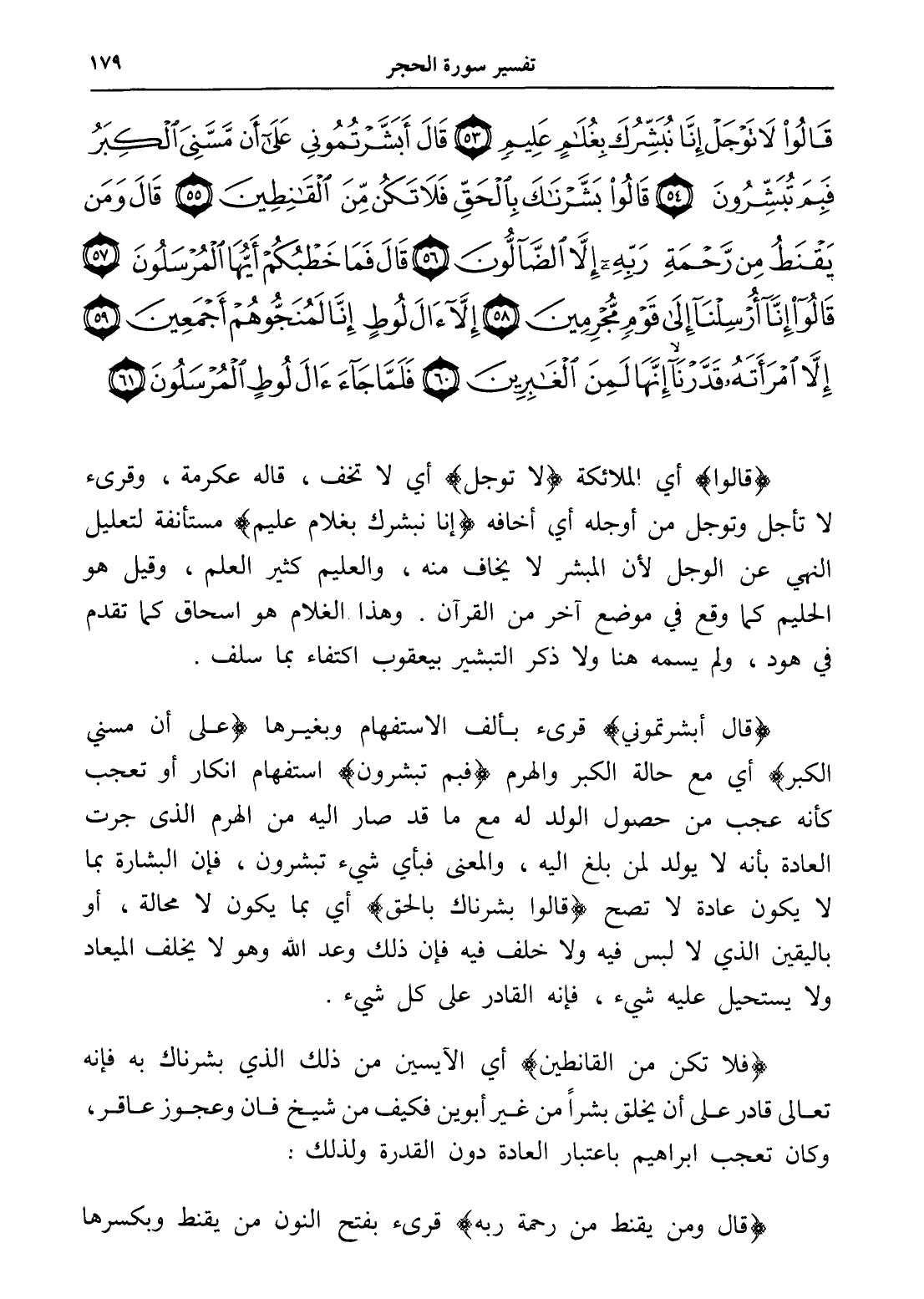 قَالُوا لَا تَوْجَلْ إِنَّا نُبَشِّرُكَ بِغُلَامٍ عَلِيمٍ (53) قَالَ أَبَشَّرْتُمُونِي عَلَى أَنْ مَسَّنِيَ الْكِبَرُ فَبِمَ تُبَشِّرُونَ (54) قَالُوا بَشَّرْنَاكَ بِالْحَقِّ فَلَا تَكُنْ مِنَ الْقَانِطِينَ (55) قَالَ وَمَنْ يَقْنَطُ مِنْ رَحْمَةِ رَبِّهِ إِلَّا الضَّالُّونَ (56) قَالَ فَمَا خَطْبُكُمْ أَيُّهَا الْمُرْسَلُونَ (57) قَالُوا إِنَّا أُرْسِلْنَا إِلَى قَوْمٍ مُجْرِمِينَ (58) إِلَّا آلَ لُوطٍ إِنَّا لَمُنَجُّوهُمْ أَجْمَعِينَ (59) إِلَّا امْرَأَتَهُ قَدَّرْنَا إِنَّهَا لَمِنَ الْغَابِرِينَ (60) فَلَمَّا جَاءَ آلَ لُوطٍ الْمُرْسَلُونَ (61)