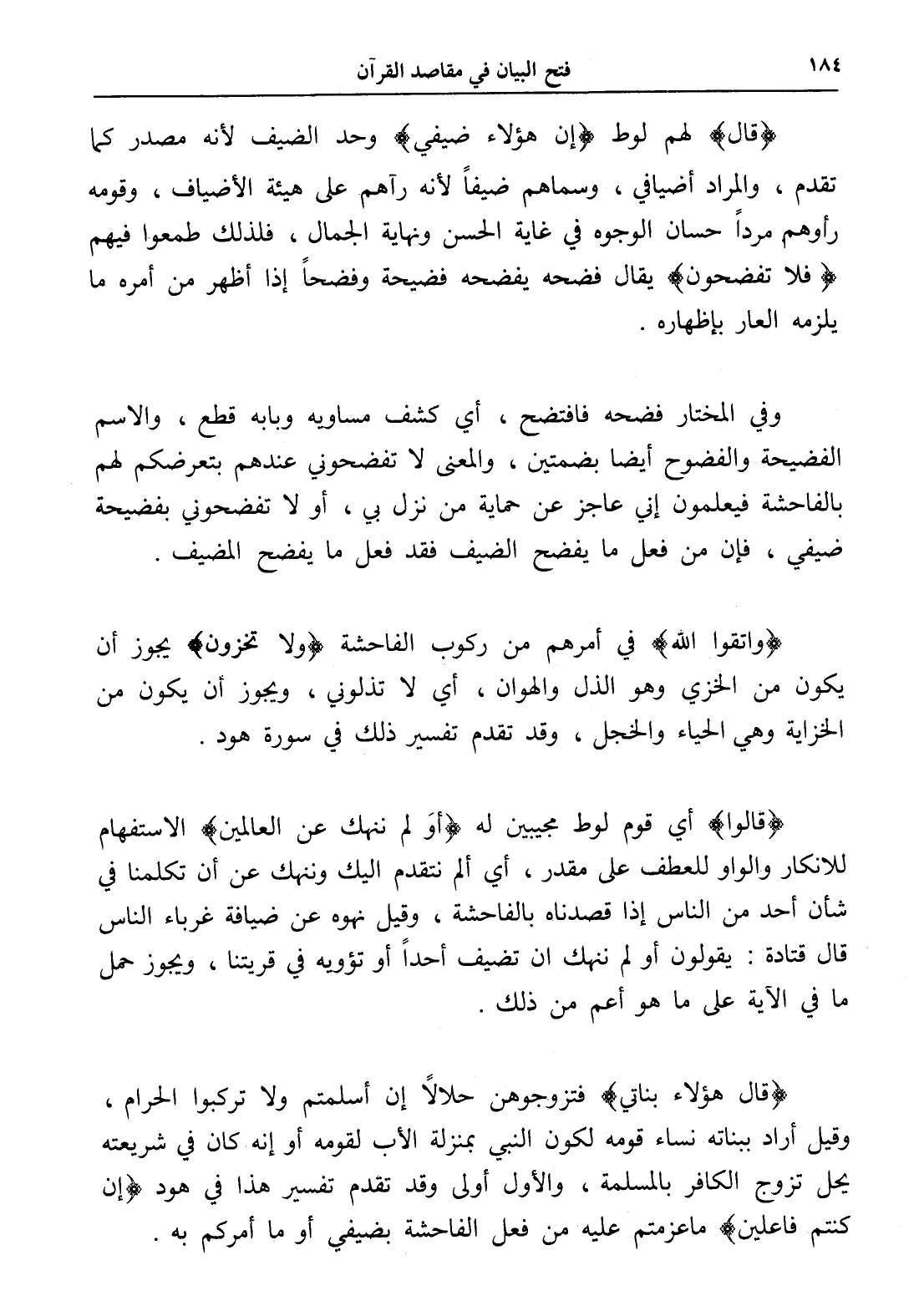 وفي المختار فضحه فافتضح، أي كشف مساويه وبابه قطع، والاسم الفضيحة والفضوح أيضًا بضمتين، والمعنى لا تفضحوني عندهم بتعرضكم لهم بالفاحشة فيعلمون إني عاجز عن حماية من نزل بي، أو لا تفضحوني بفضيحة ضيفي، فإن من فعل ما يفضح الضيف فقد فعل مايفضح المضيف.