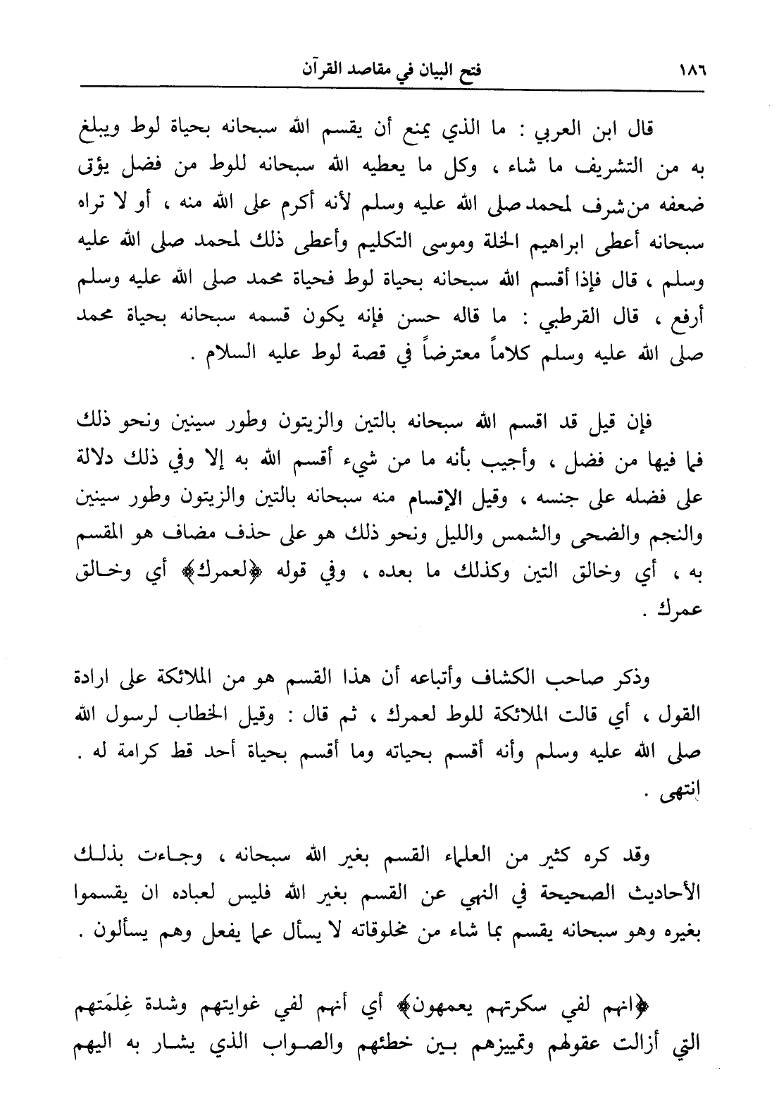 قال ابن العربي: ما الذي يمنع أن يقسم الله سبحانه بحياة لوط ويبلغ به من التشريف ما شاء، وكل ما يعطيه الله سبحانه للوط من فضل يؤتى ضعفه من شرف لحمد صلى الله عليه وسلم لأنه أكرم على الله منه، أو لا تراه سبحانه أعطى إبراهيم الخلة وموسى التكليم وأعطى ذلك لمحمد صلى الله عليه وسلم، قال فإذا أقسم الله سبحانه بحياة لوط فحياة محمد صلى الله عليه وسلم أرفع، قال القرطبي: ما قاله حسن فإنه يكون قسمه سبحانه بحياة محمد صلى الله عليه وسلم كلاماً معترضاً في قصة لوط عليه السلام.