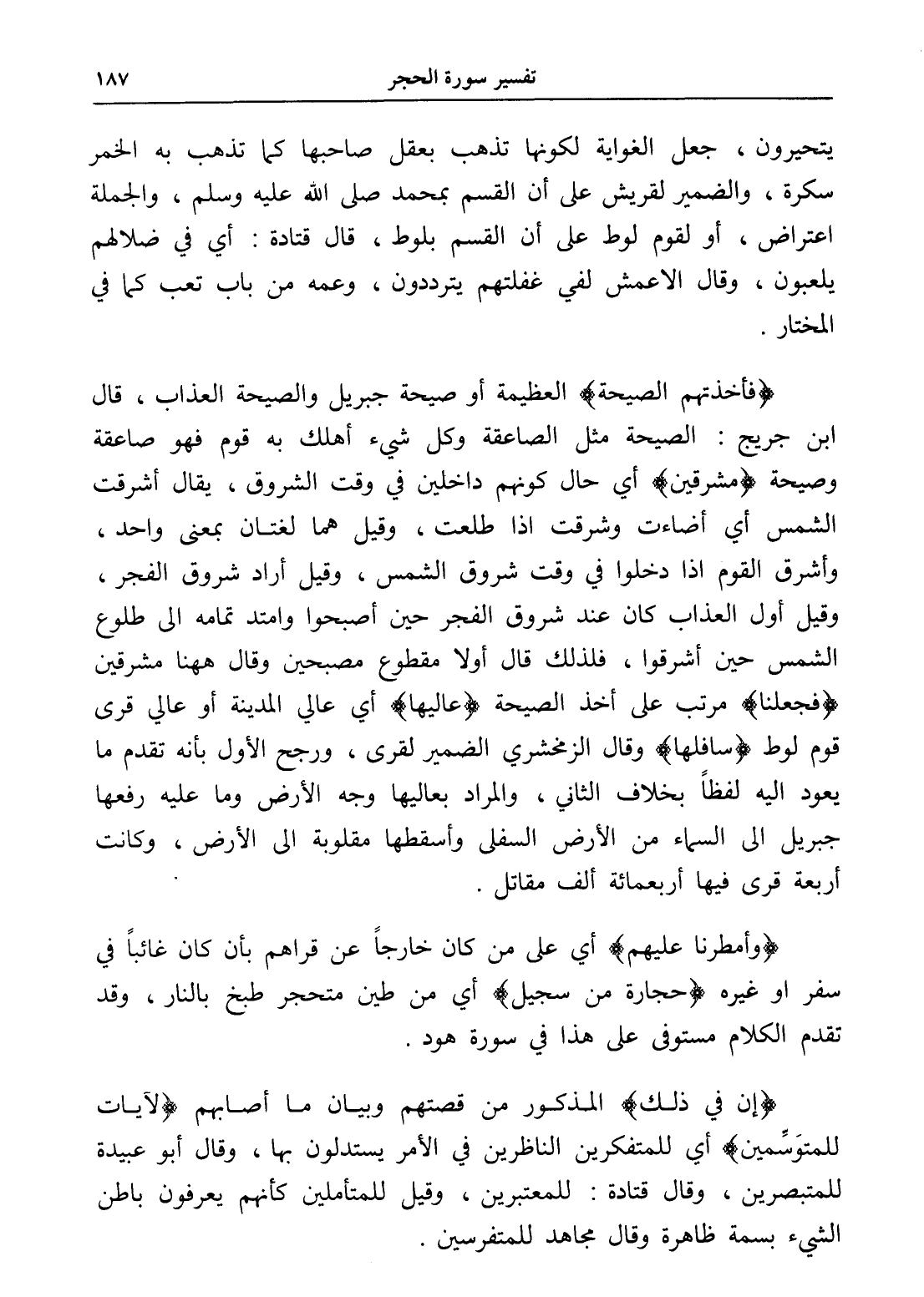 (فجعلنا) مرتب على أخذ الصيحة (عاليها) أي عالي المدينة أو عالي قرى قوم لوط (سافلها) وقال الزمخشري الضمير لقرى، ورجح الأول بأنه تقدم ما يعود إليه لفظاً بخلاف الثاني، والمراد بعاليها وجه الأرض وما عليه رفعها جبريل إلى السماء من الأرض السفلى وأسقطها مقلوبة إلى الأرض، وكانت أربعة قرى فيها أربعمائة ألف مقاتل.