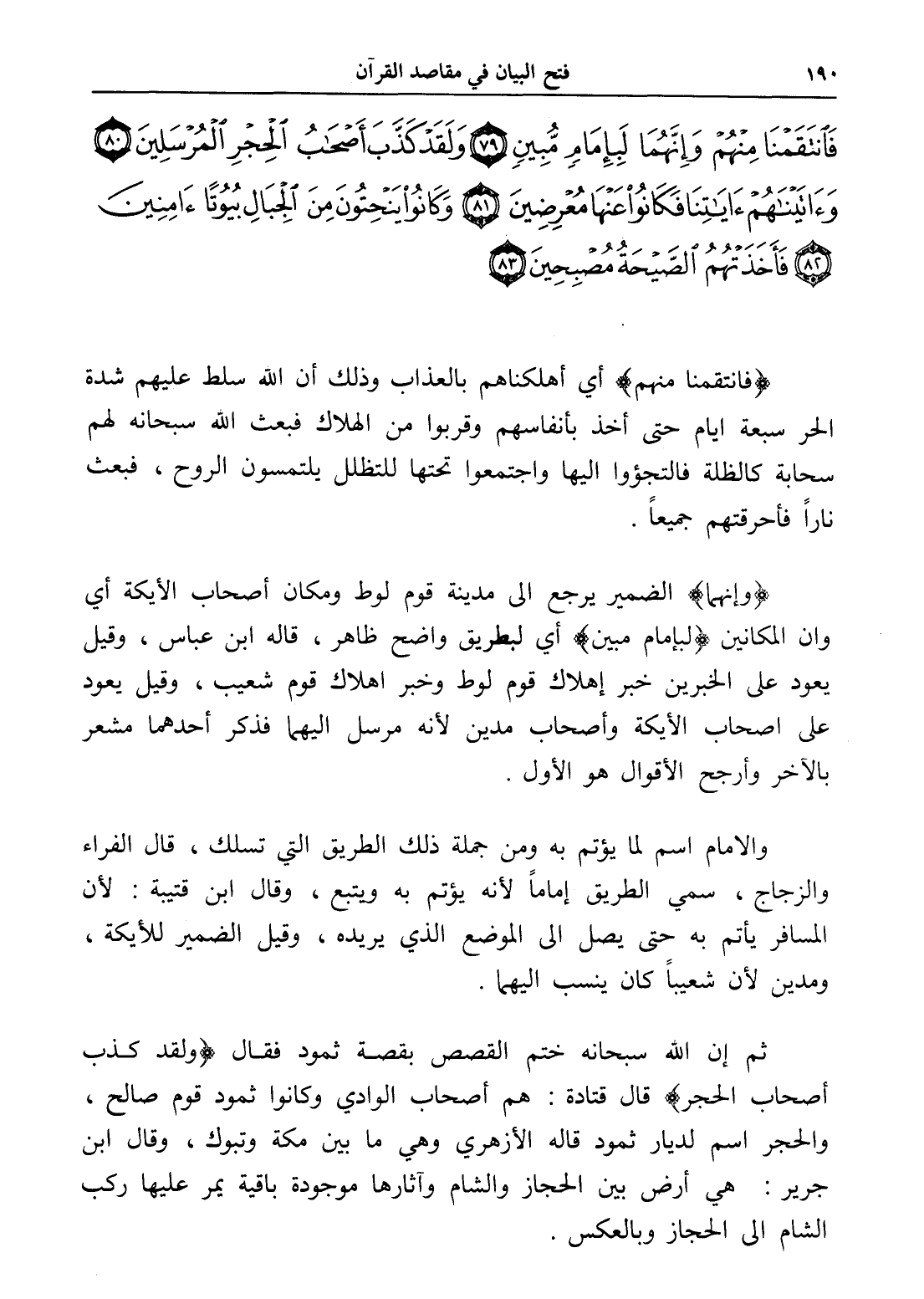 فَانْتَقَمْنَا مِنْهُمْ وَإِنَّهُمَا لَبِإِمَامٍ مُبِينٍ (79) وَلَقَدْ كَذَّبَ أَصْحَابُ الْحِجْرِ الْمُرْسَلِينَ (80) وَآتَيْنَاهُمْ آيَاتِنَا فَكَانُوا عَنْهَا مُعْرِضِينَ (81) وَكَانُوا يَنْحِتُونَ مِنَ الْجِبَالِ بُيُوتًا آمِنِينَ (82) فَأَخَذَتْهُمُ الصَّيْحَةُ مُصْبِحِينَ (83)