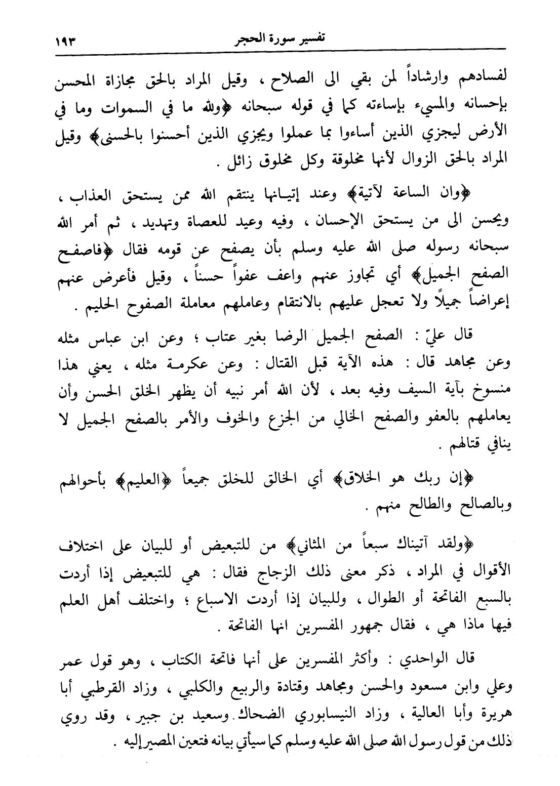 (ولقد آتيناك سبعاً من المثاني) من للتبعيض أو للبيان على اختلاف الأقوال في المراد، ذكر معنى ذلك الزجاج فقال: هي للتبعيض إذا أردت بالسبع الفاتحة أو الطوال، وللبيان إذا أردت الاسباع؛ واختلف أهل العلم فيها ماذا هي، فقال جمهور المفسرين أنها الفاتحة.