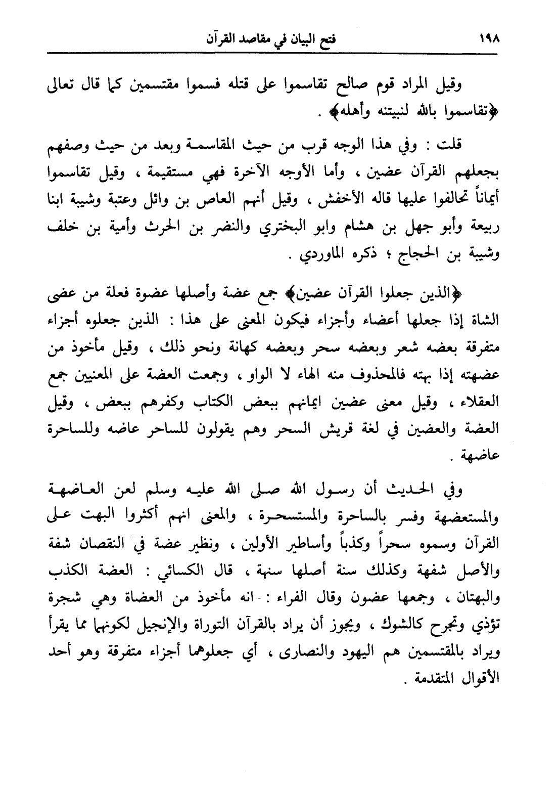 وفي الحديث أن رسول الله صلى الله عليه وسلم لعن العاضهة والمستعضهة وفسر بالساحرة والمستسحرة، والمعنى أنهم أكثروا البهت على القرآن وسموه سحراً وكذباً وأساطير الأولين، ونظير عضة في النقصان شفة والأصل شفهة وكذلك سنة أصلها سنهة، قال الكسائي: العضة الكذب والبهتان، وجمعها عضون وقال الفراء: أنه مأخوذ من العضاة وهي شجرة تؤذي وتجرح كالشوك، ويجوز أن يراد بالقرآن التوراة والإنجيل لكونهما مما يقرأ ويراد بالمقتسمين هم اليهود والنصارى، أي جعلوهما أجزاء متفرقة وهو أحد الأقوال المتقدمة.